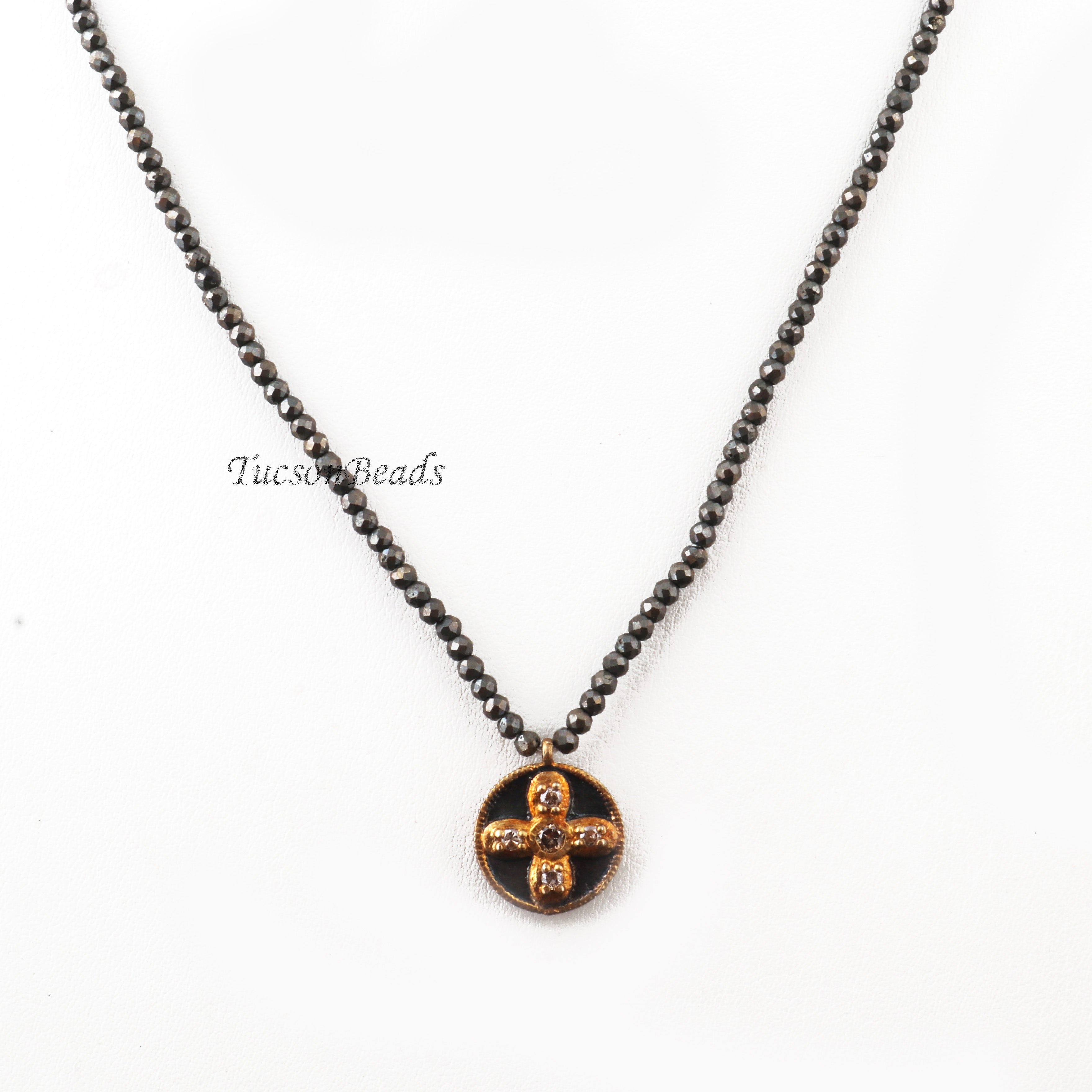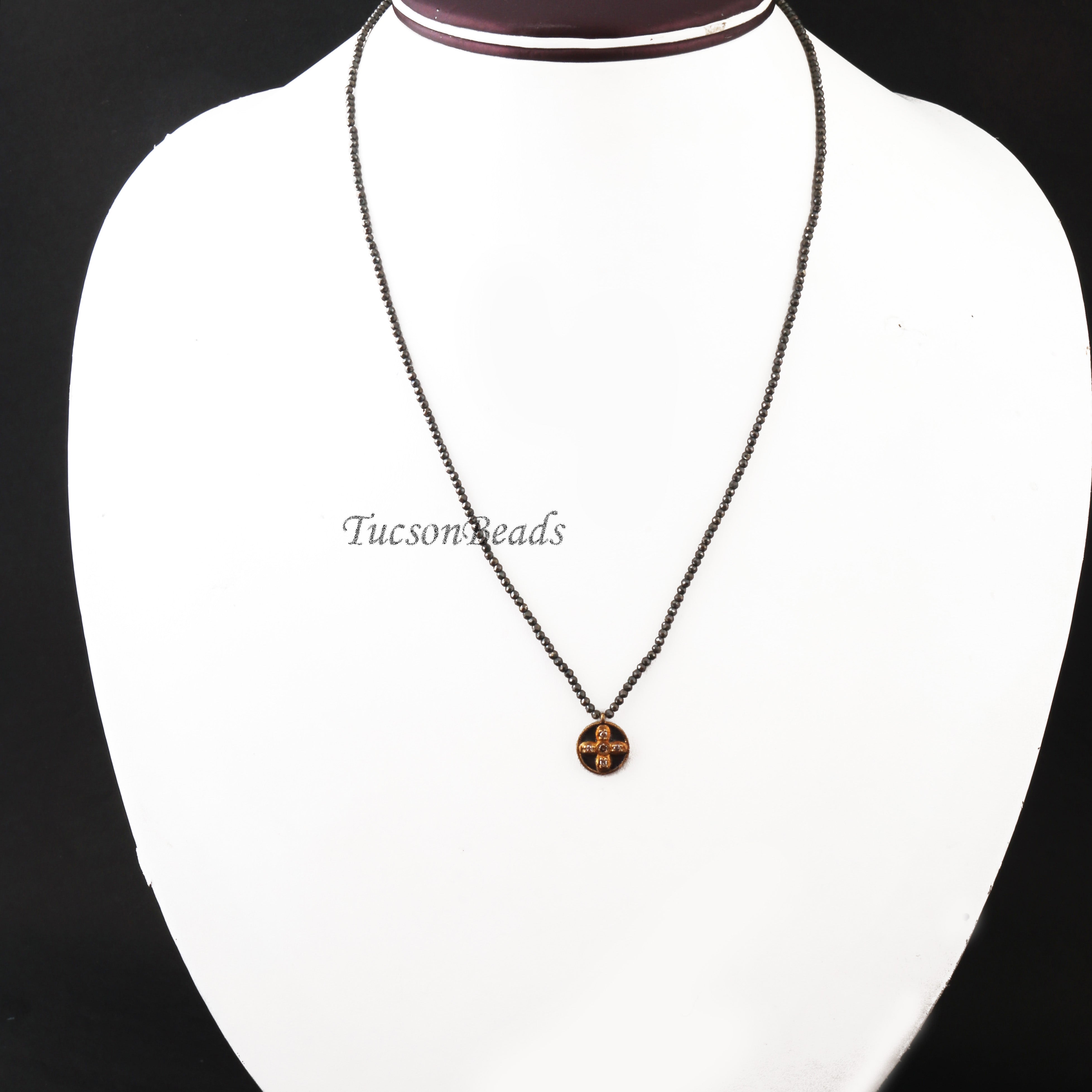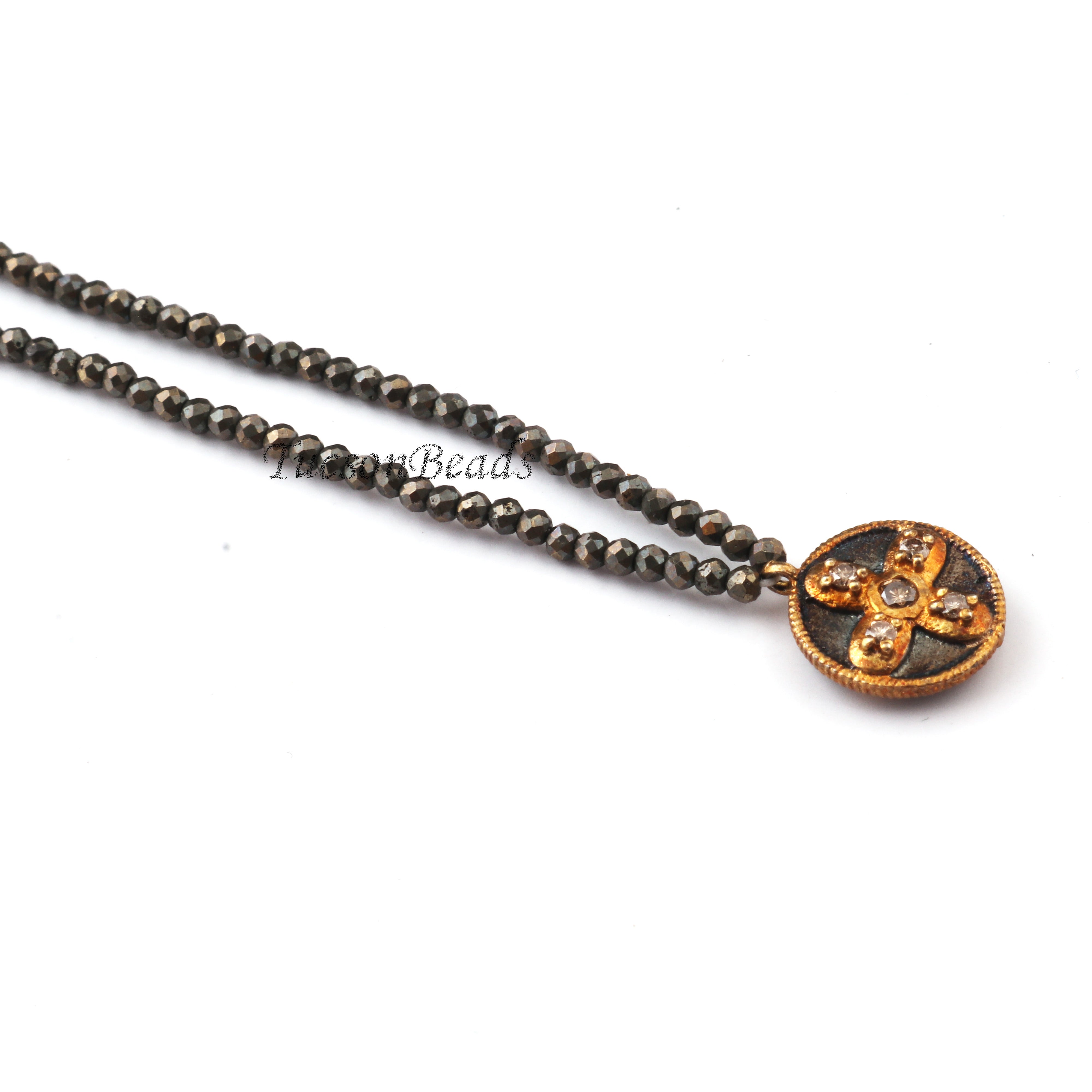 Natural Pyrite Round With Pave Diamond Cross Necklace, Sparkly Necklace ,Tiny Beaded 2mm, Necklace - 13mmx11mm (Charm) -18"Long OS003