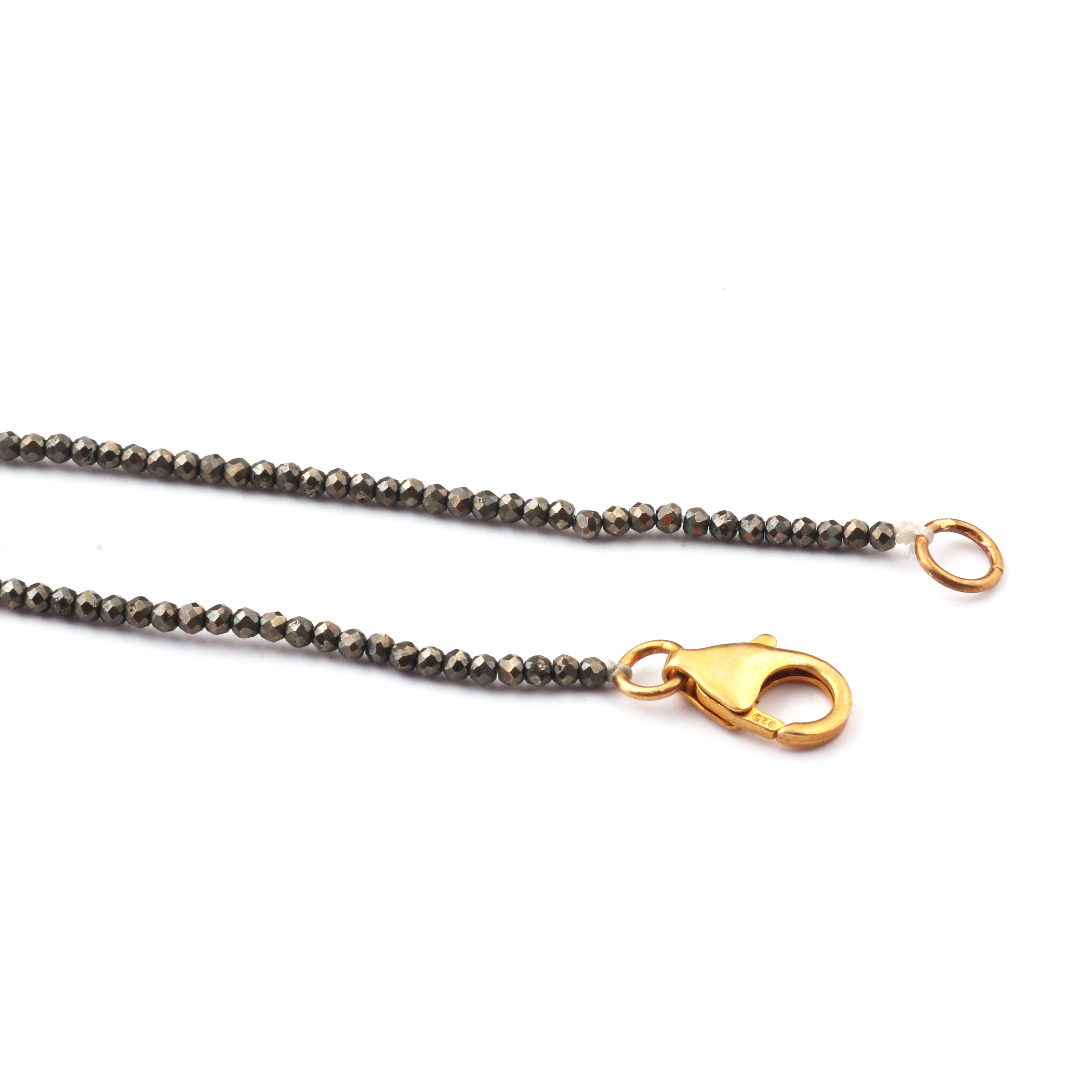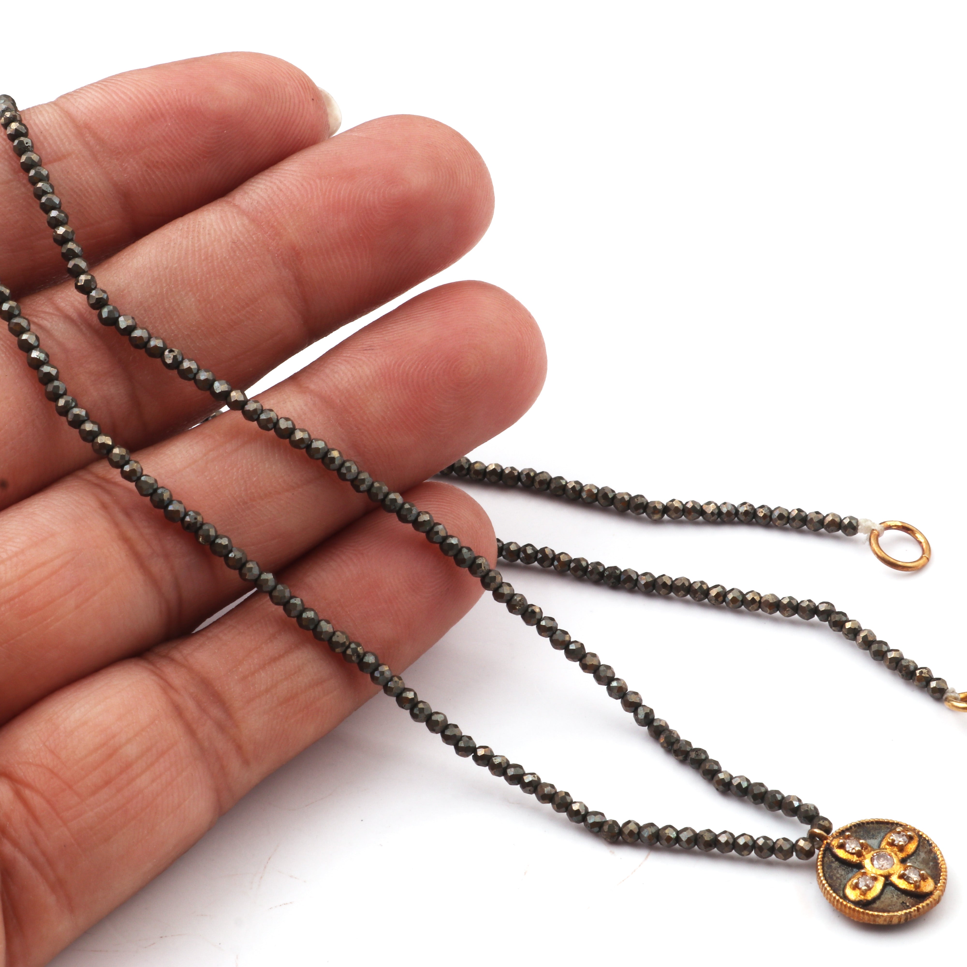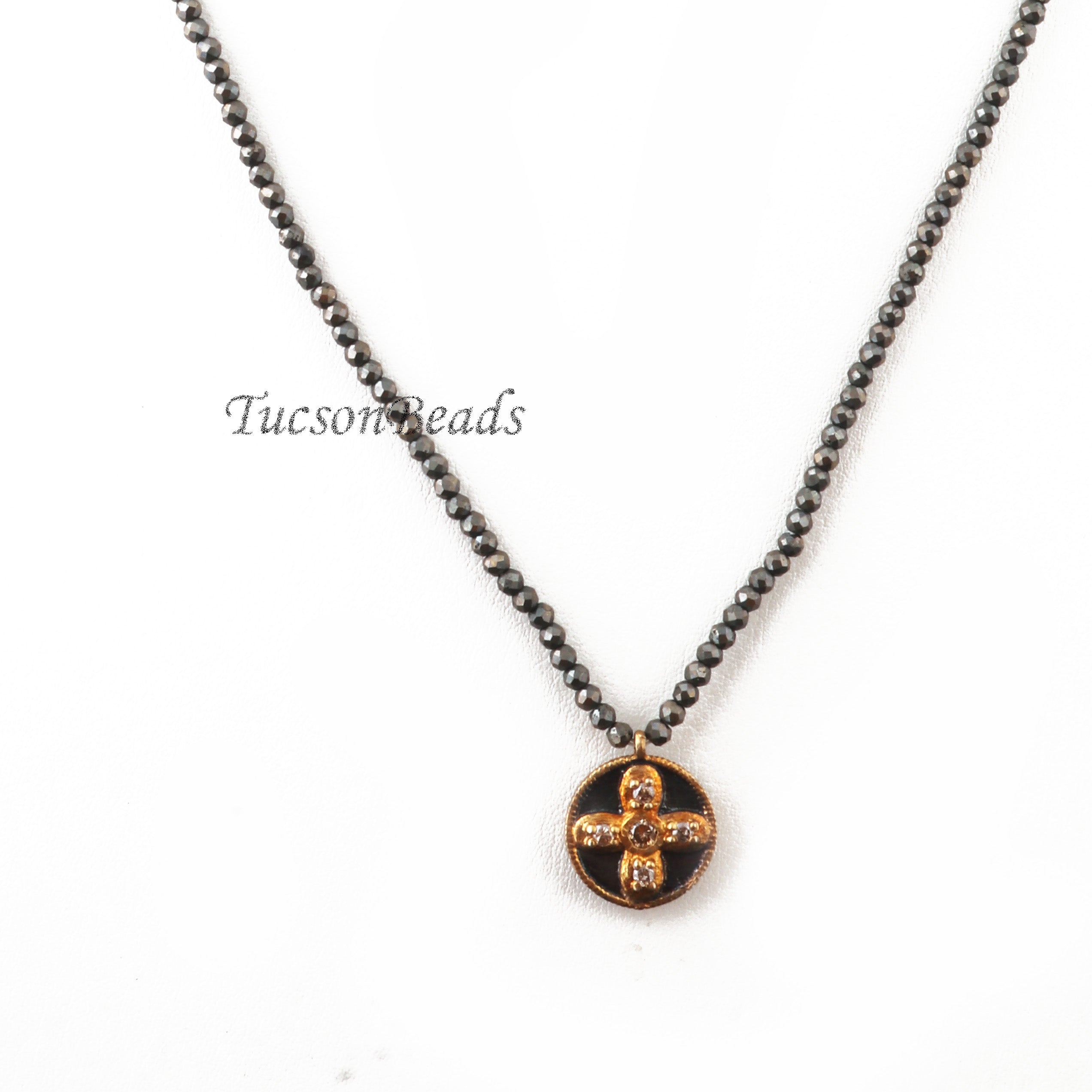 Natural Pyrite Round With Pave Diamond Cross Necklace, Sparkly Necklace ,Tiny Beaded 2mm, Necklace - 13mmx11mm (Charm) -18"Long OS003