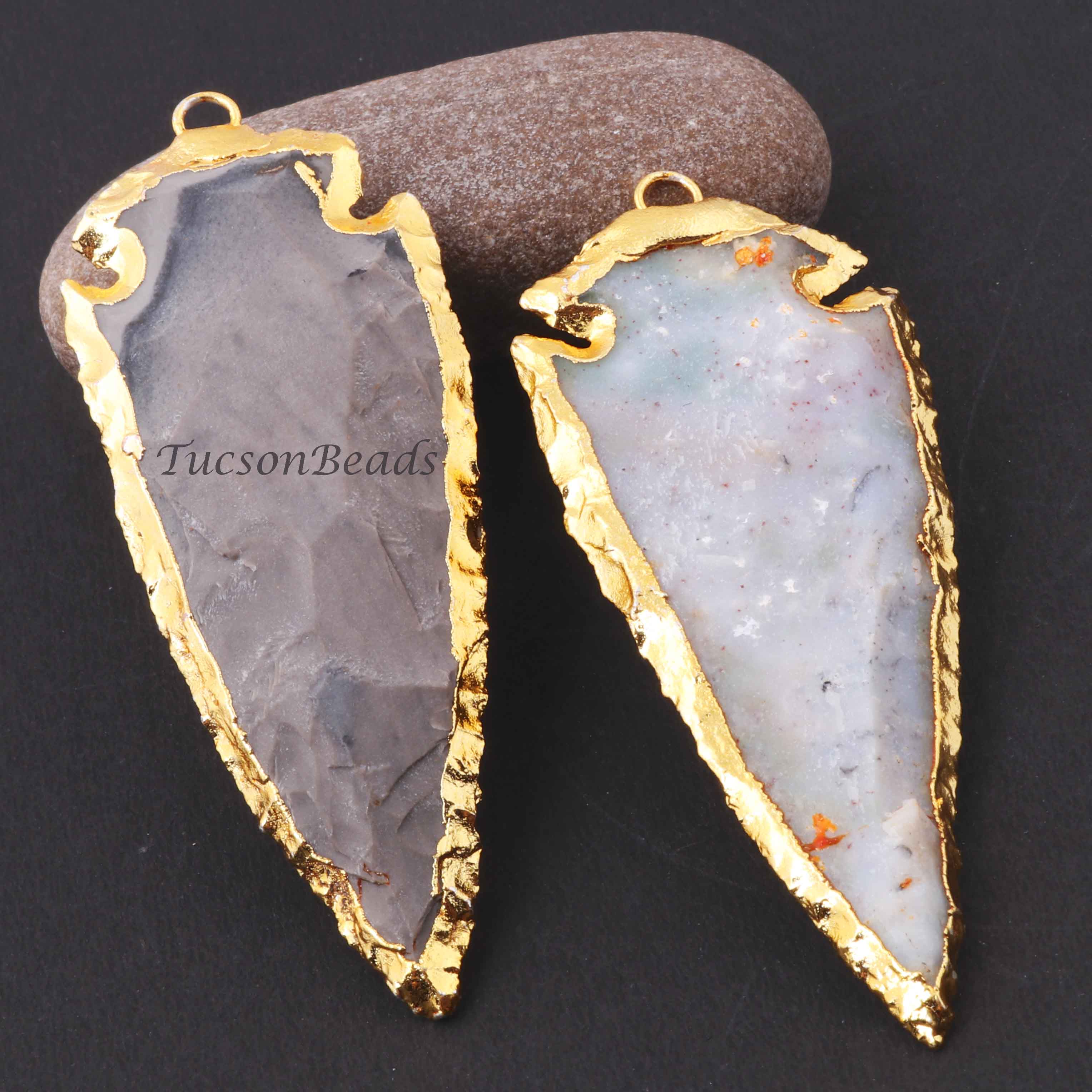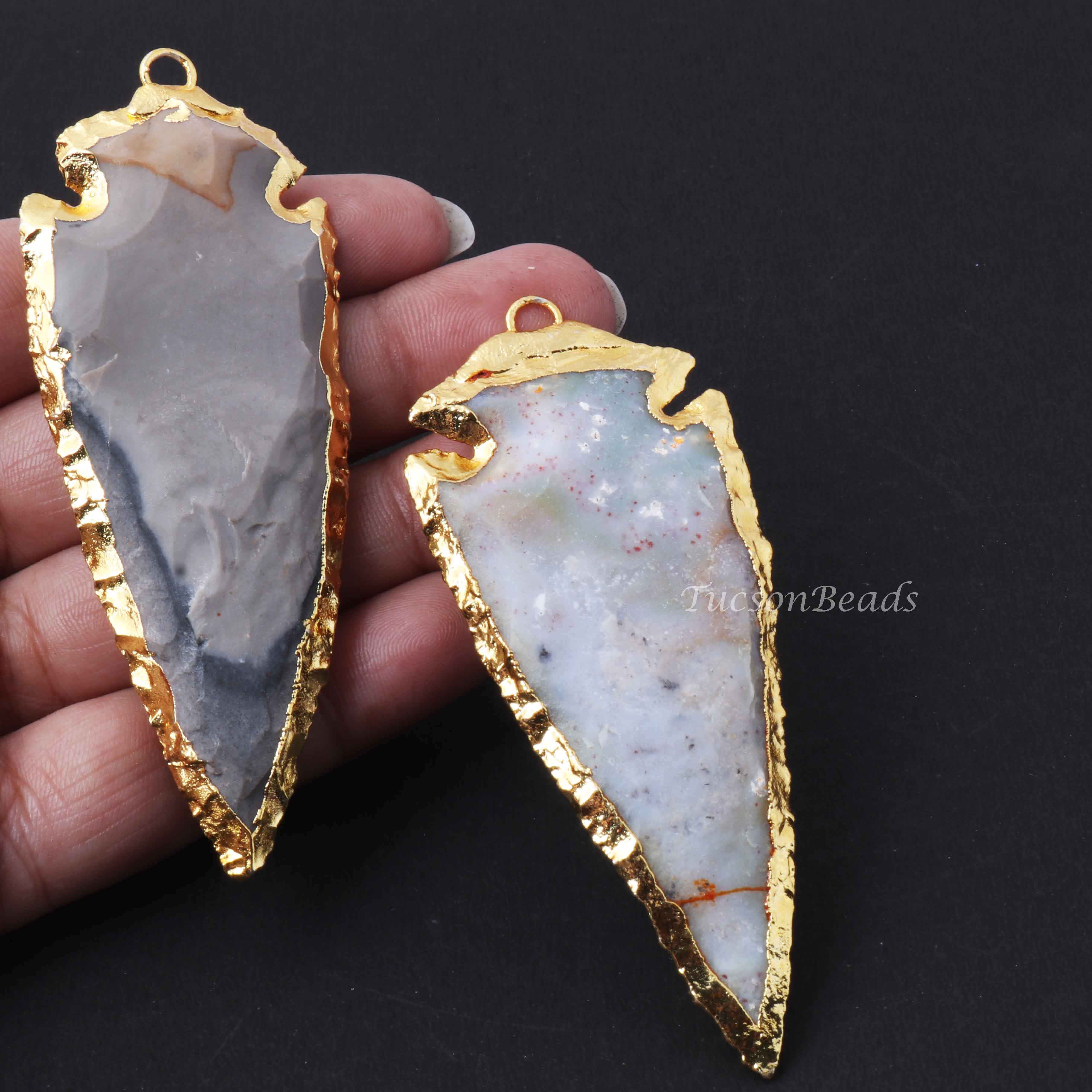 2  Pcs Shaded Gray Jasper Arrowhead  24k Gold  Plated Charm Pendant -  Electroplated With Gold Edge 88mmX32mm - AR039