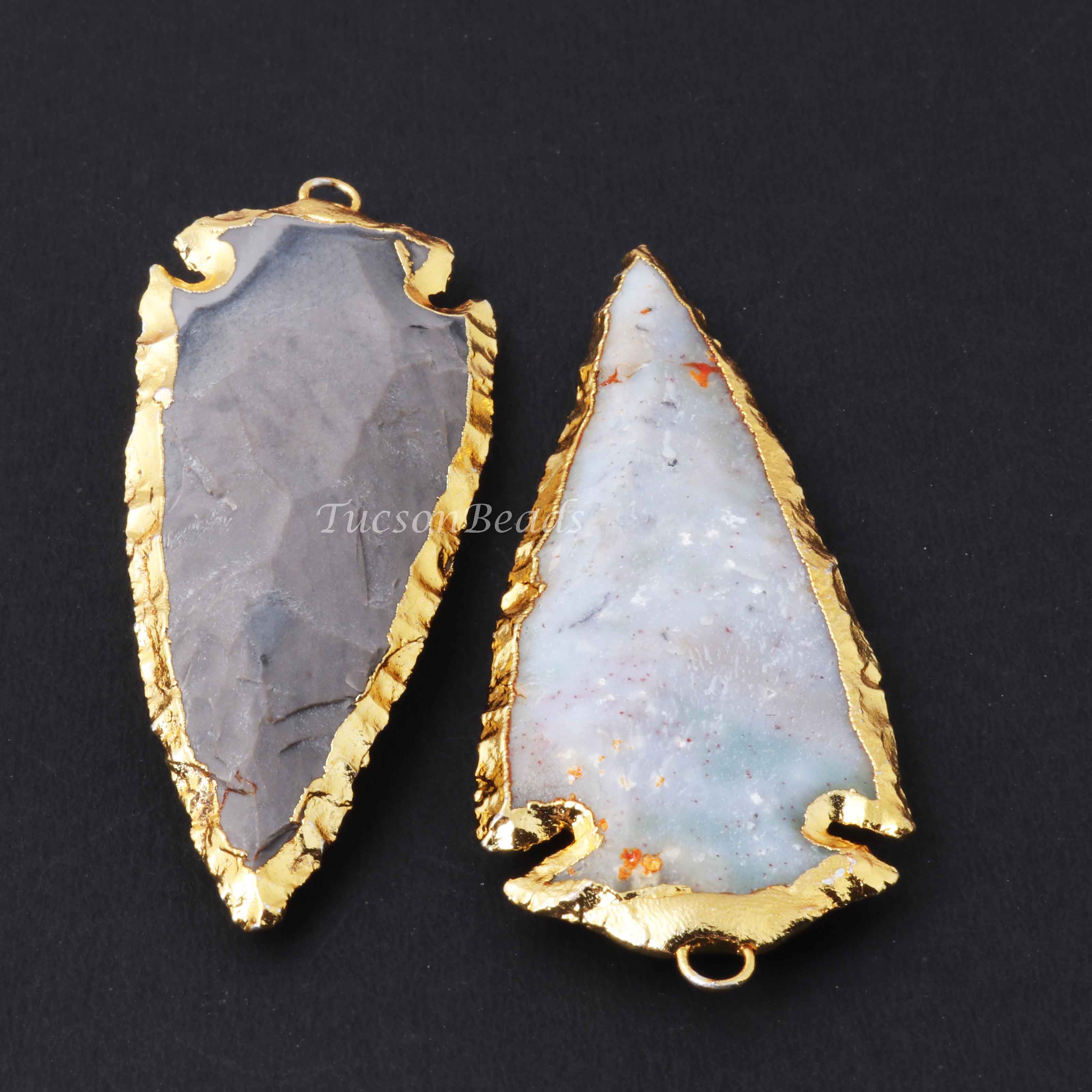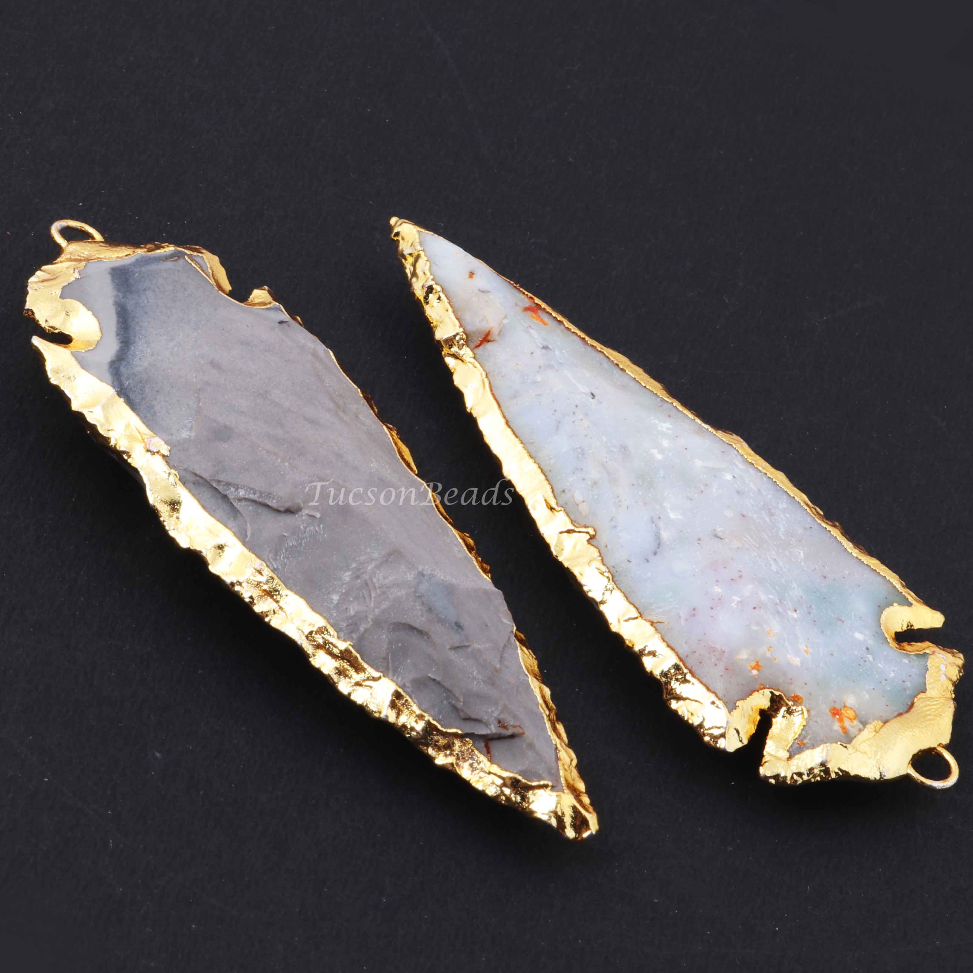 2 Pcs Shaded Gray Jasper Arrowhead 24k Gold Plated Charm Pendant - Electroplated With Gold Edge 88mmX32mm - AR039