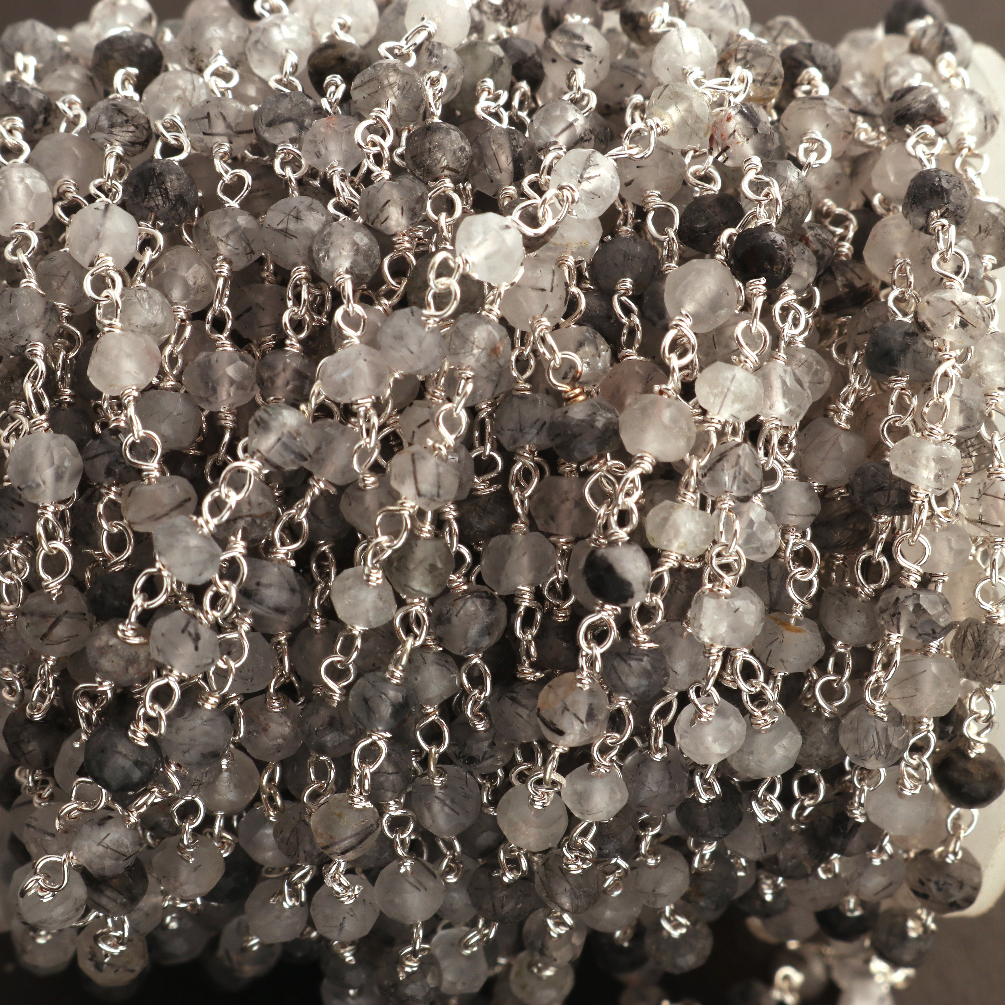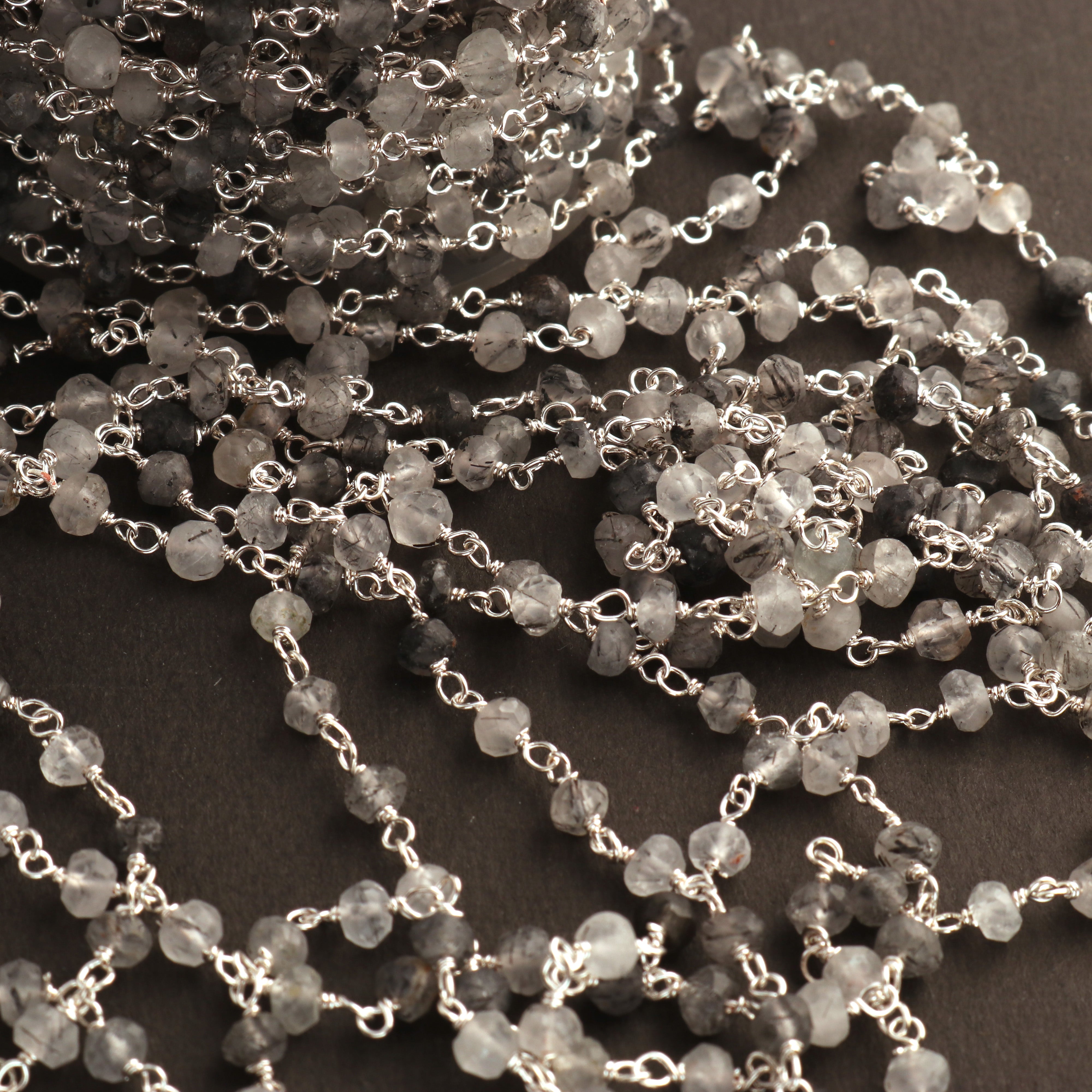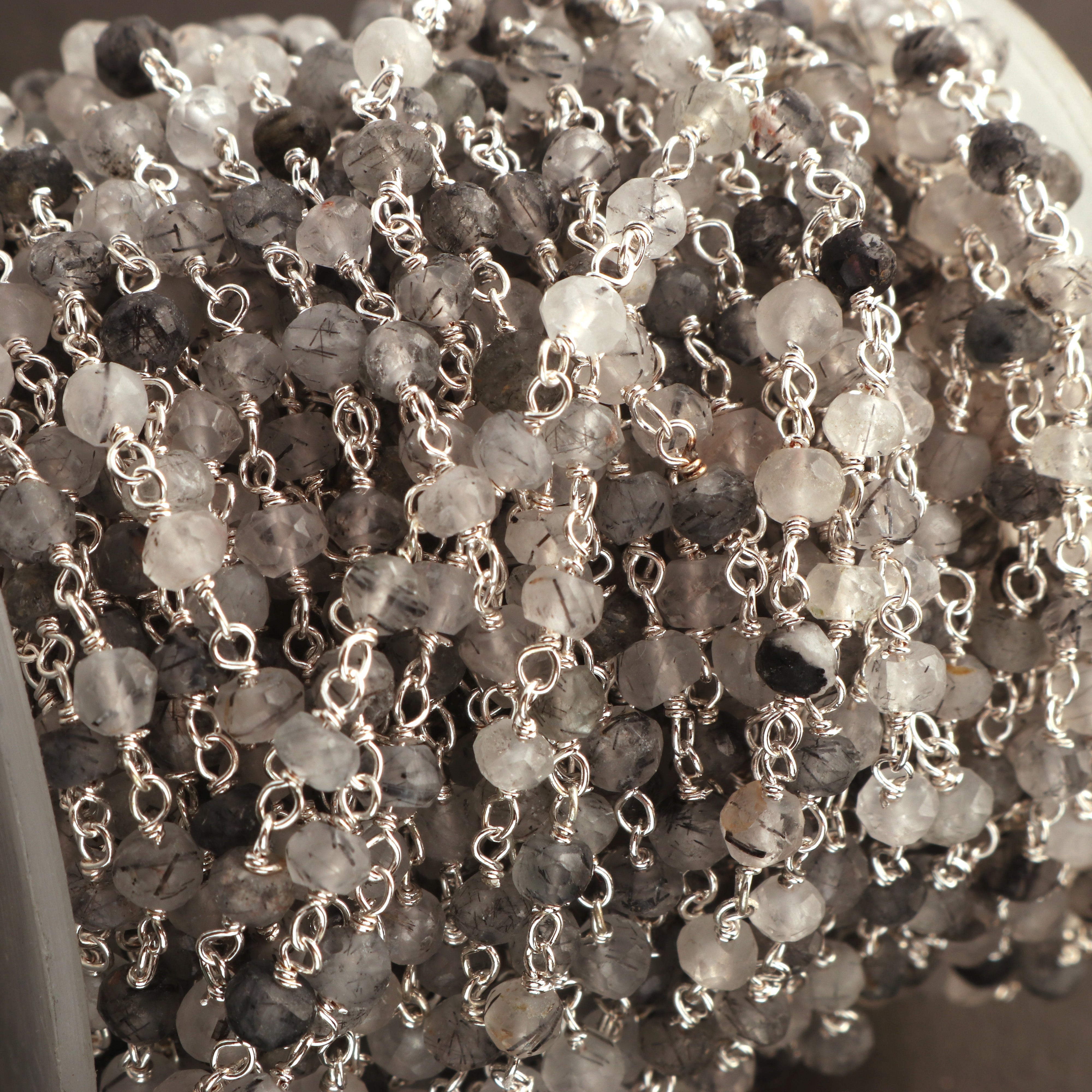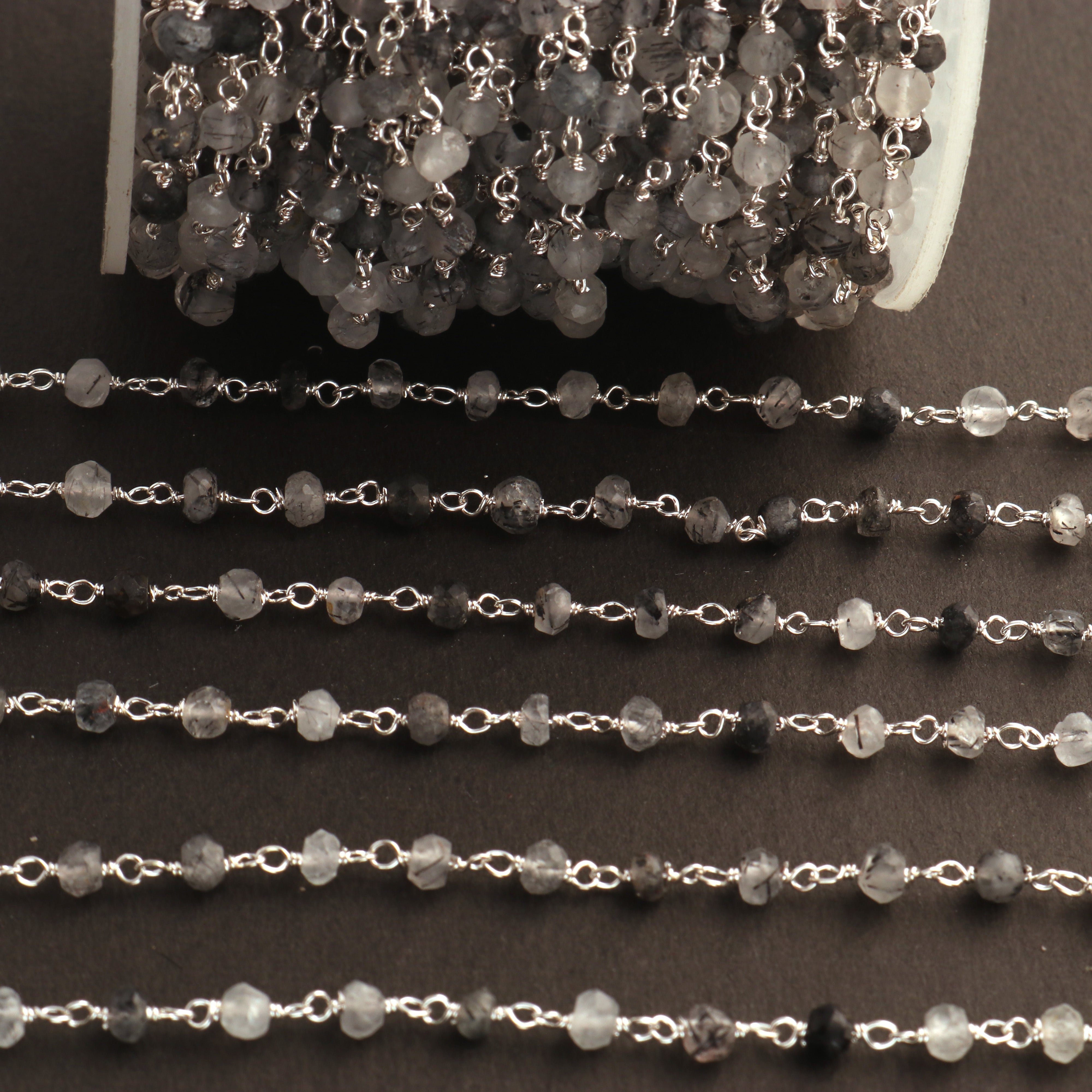 5 Feet Black Rutile 4mm Rosary Style Beaded Chain wire wrapped 925 Silver Plated chain NSC0057