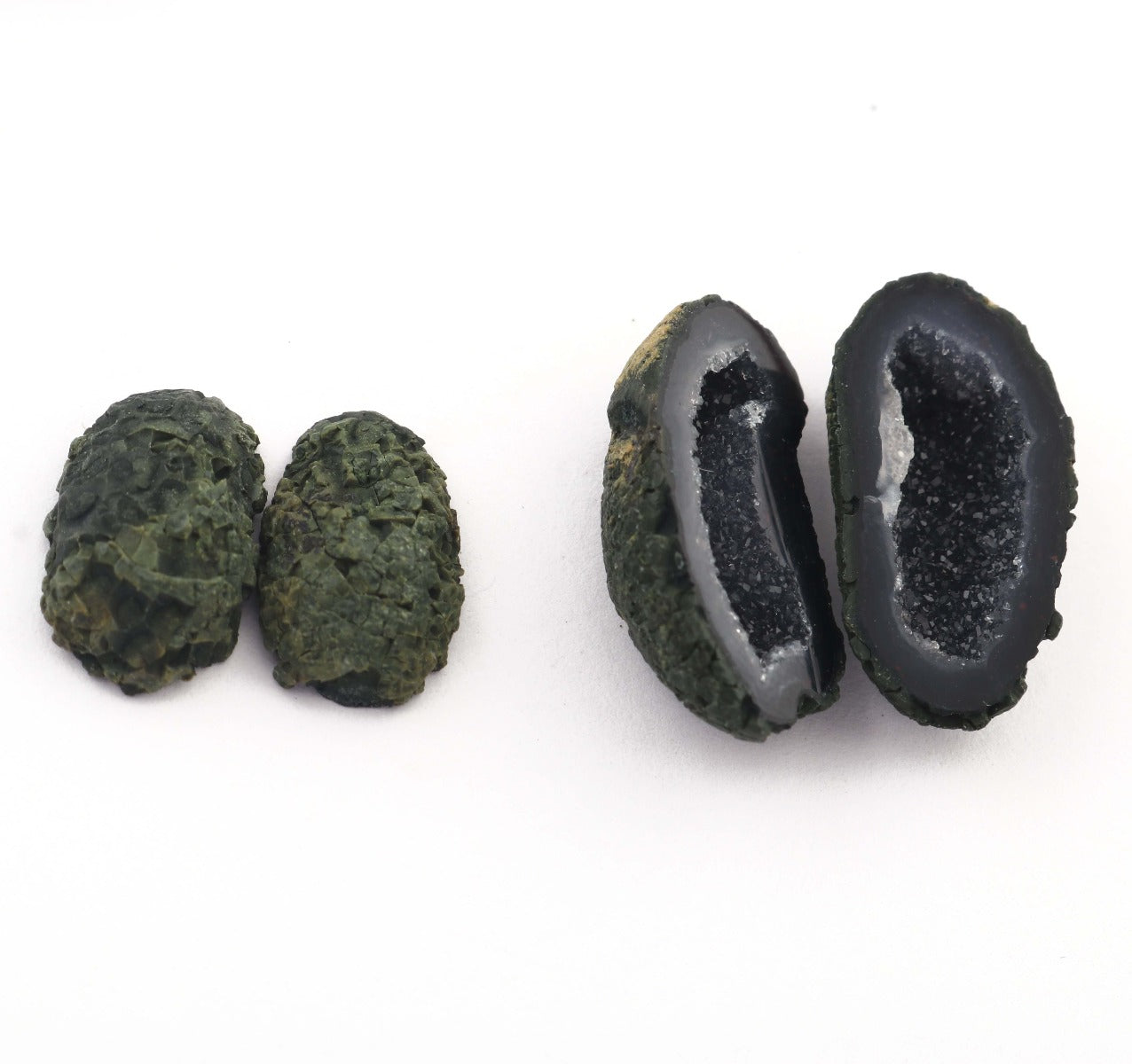 This is a Love Birds Tabasco geode cut in half. They are polished on the front face and backside is green rock. The backs are left natural and rounded, as shown in the last picture. Size is earring will vary. Please refer for photo with quartz for better sizing. Great Quality for making Necklace, earrings, Bracelet or any other jewelry. 100% natural & genuineĀ