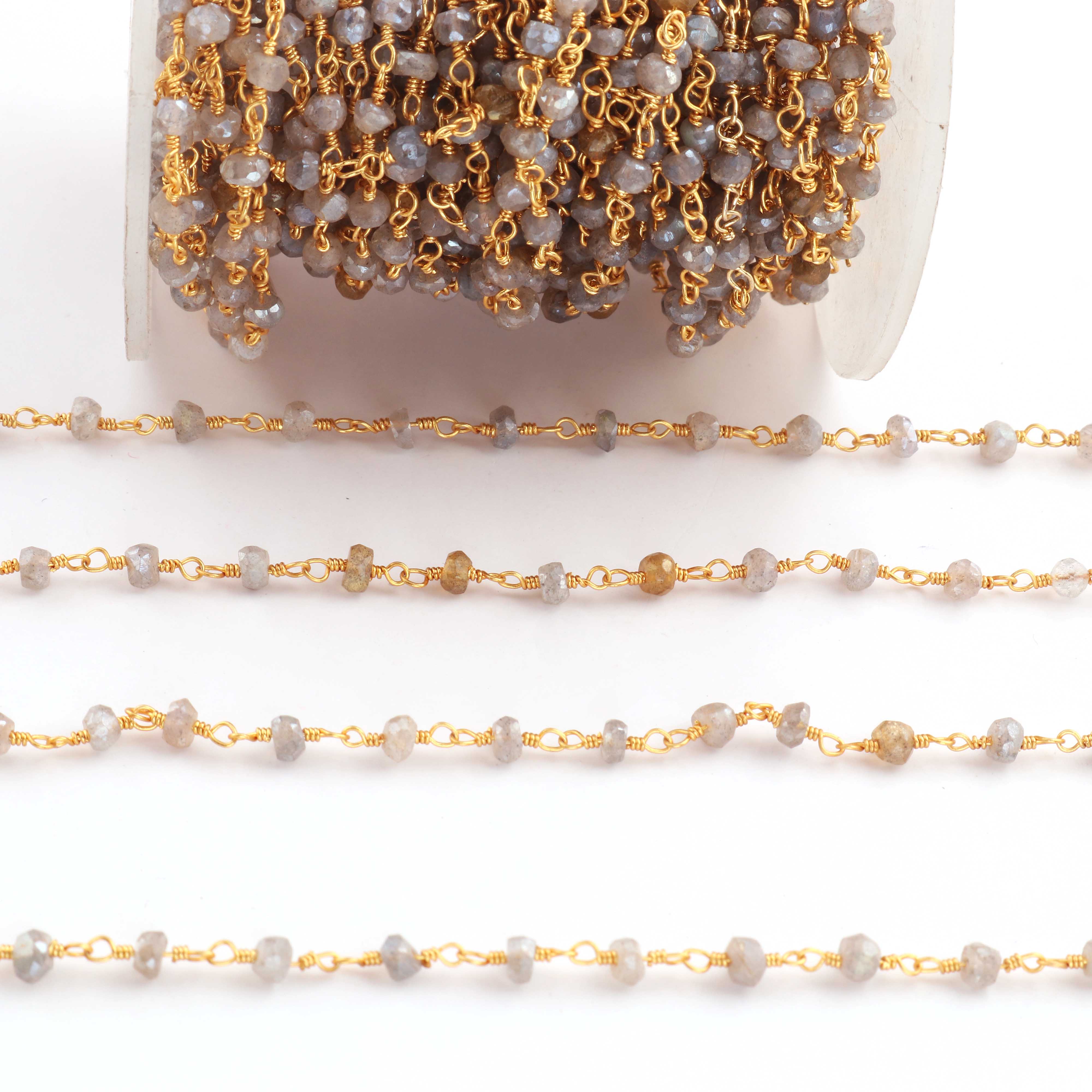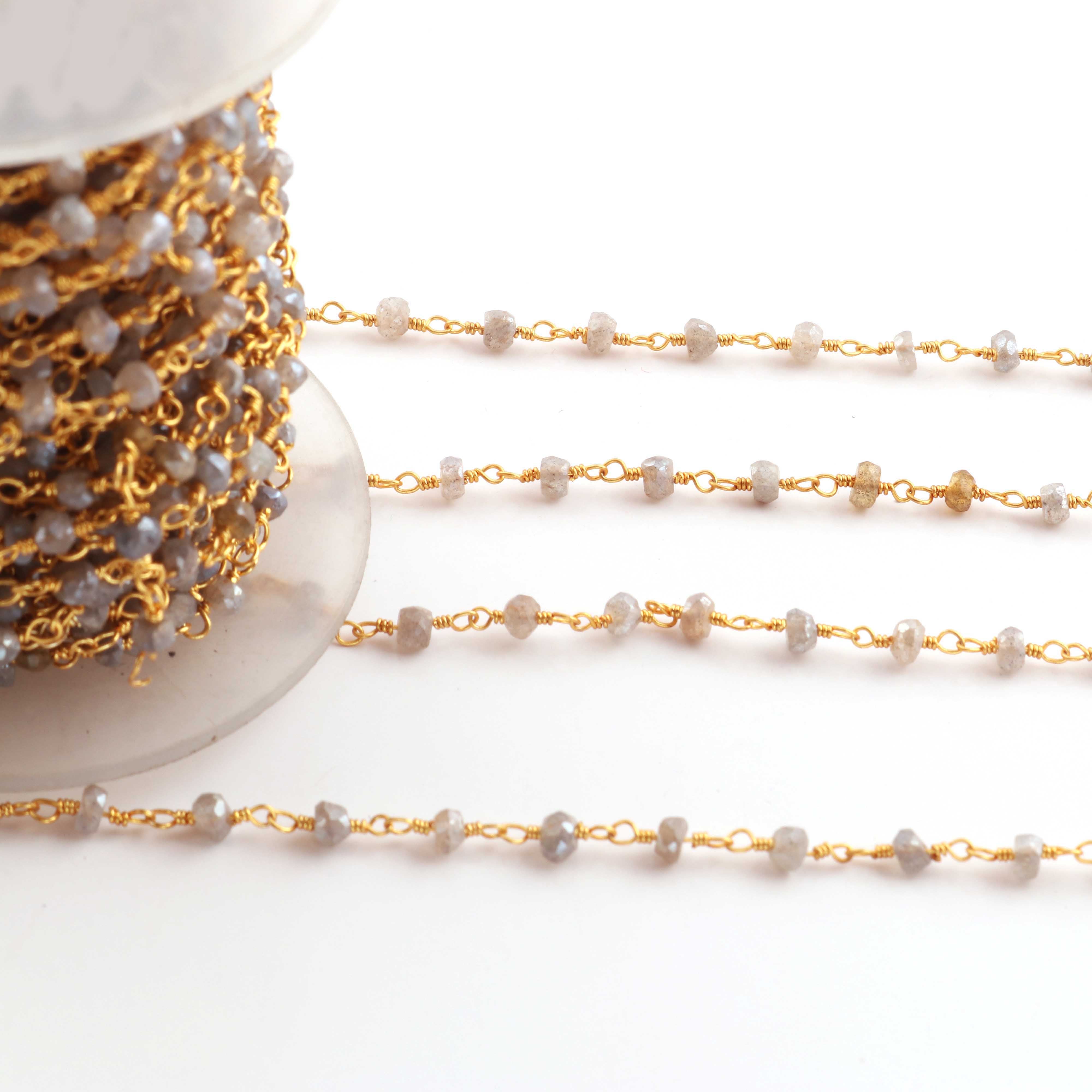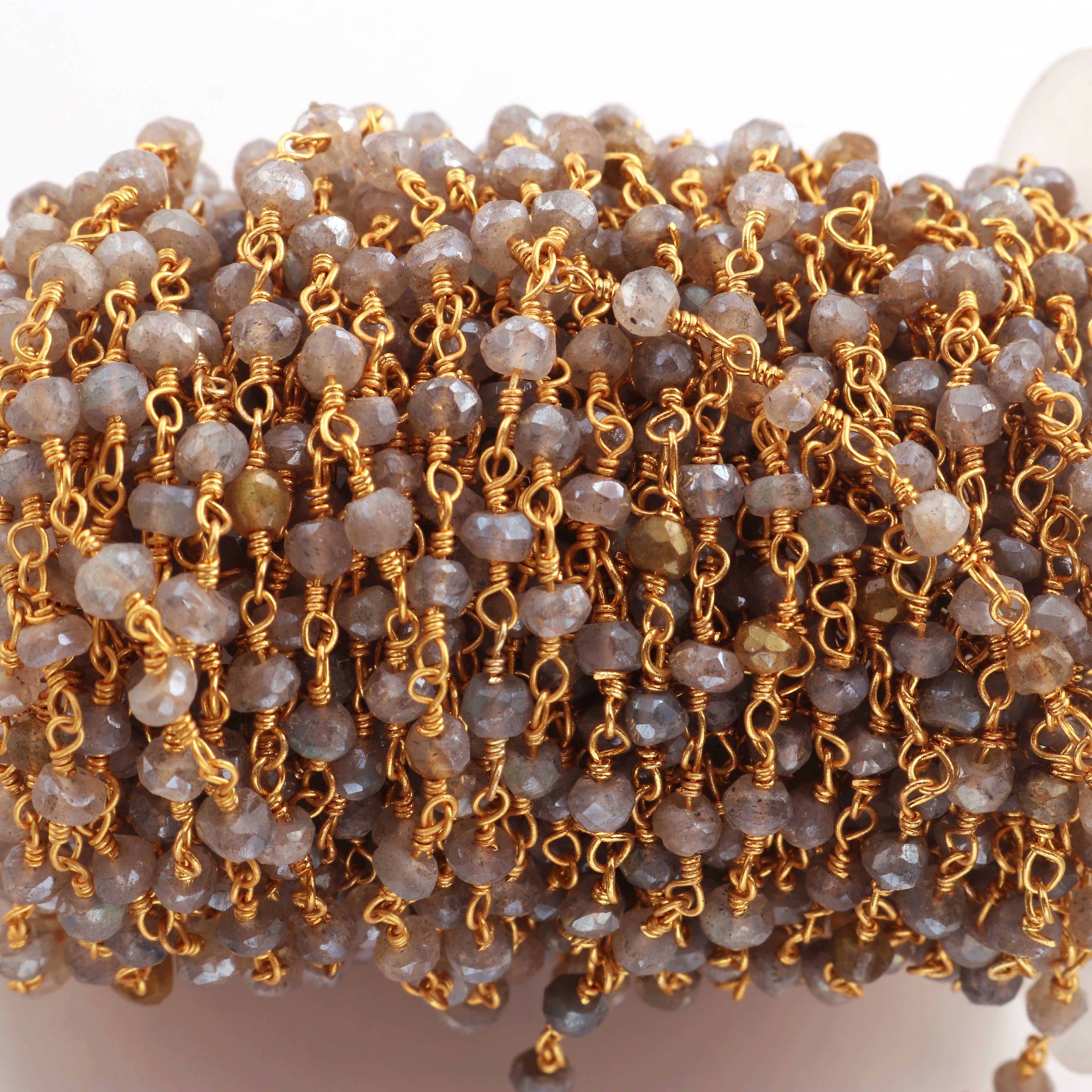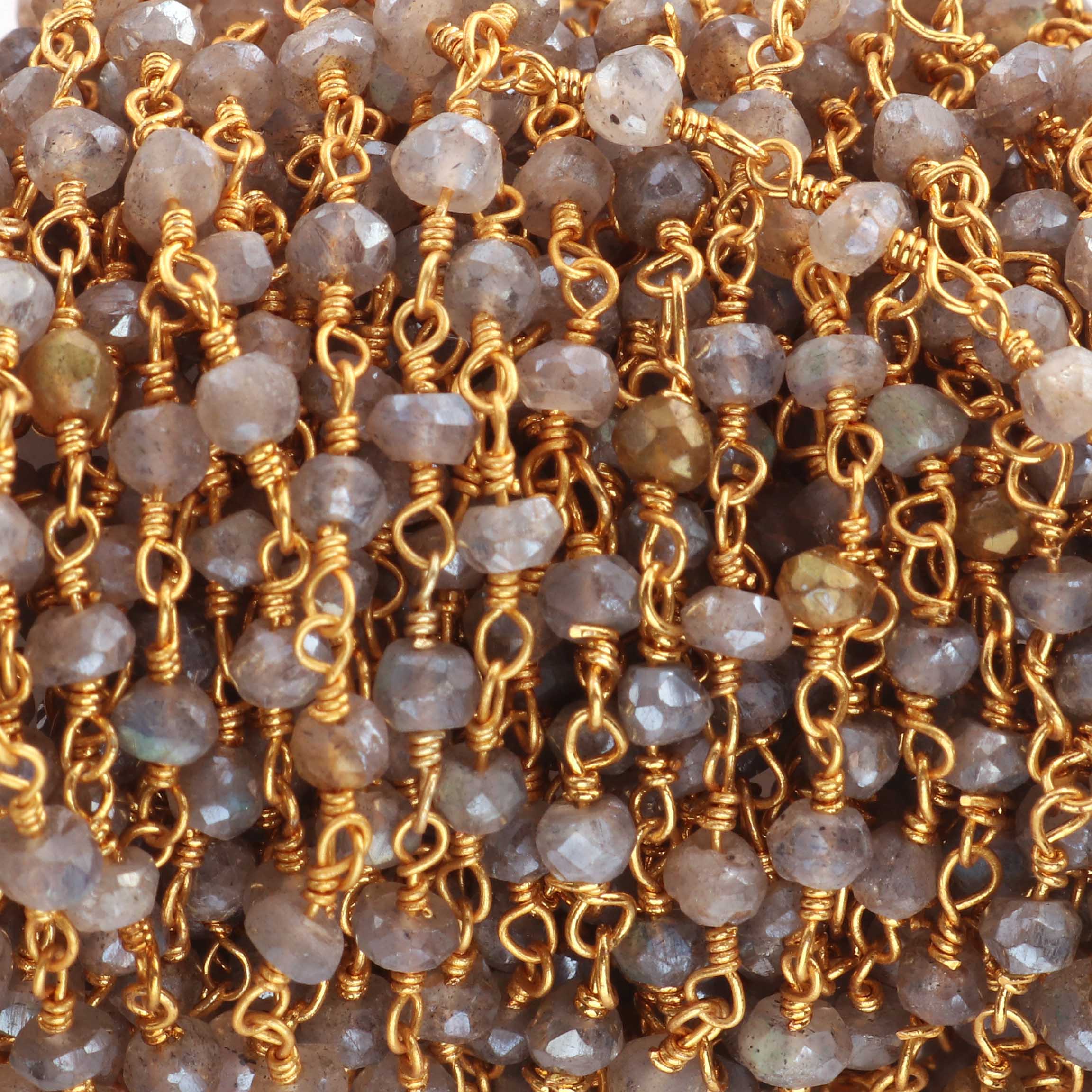 •  3 Feet Labradorite  Silver Coted Moonstone  Beads  3mmx4mm Faceted Rosary Beaded chain- 24 K Gold Plated Wire Wrapped Chain
