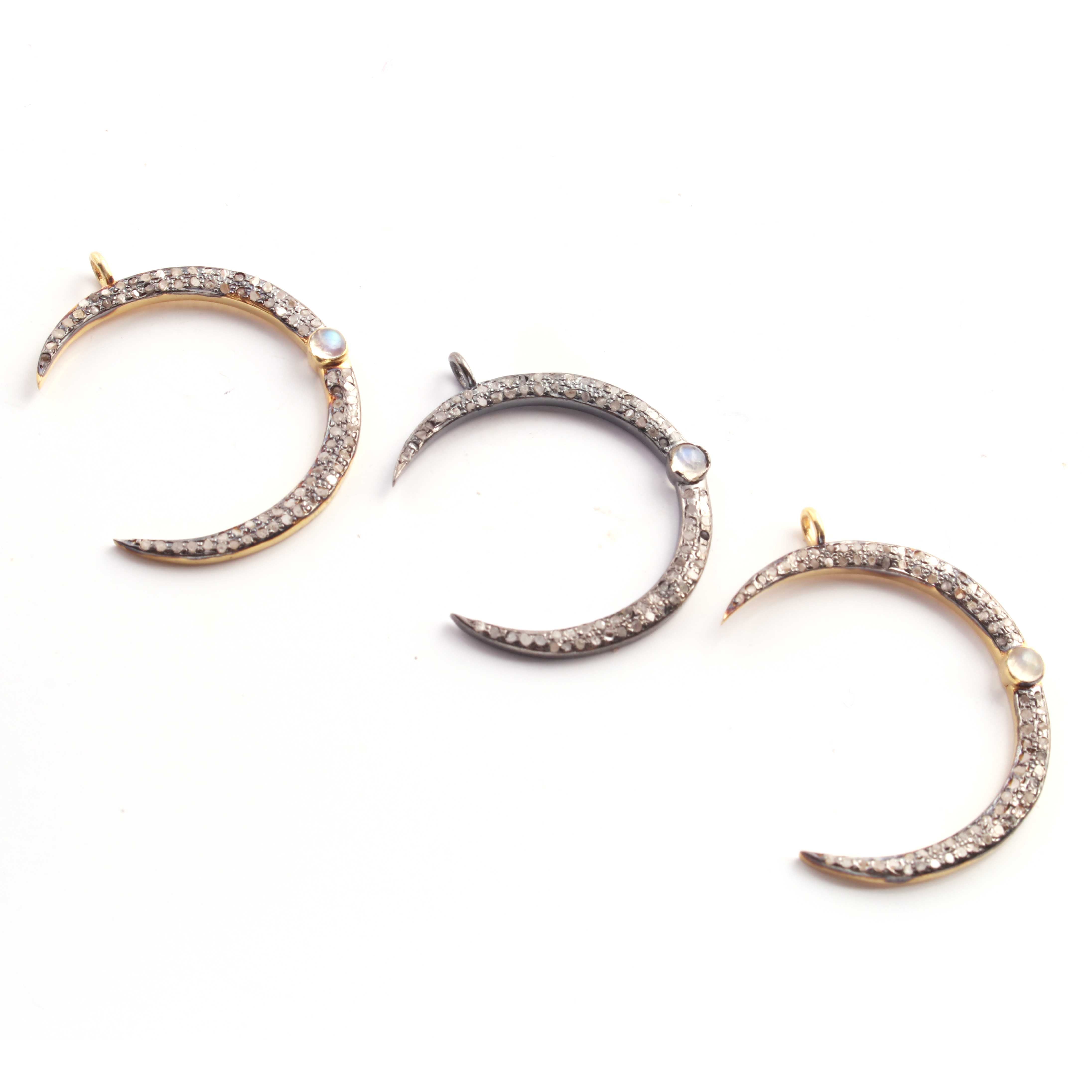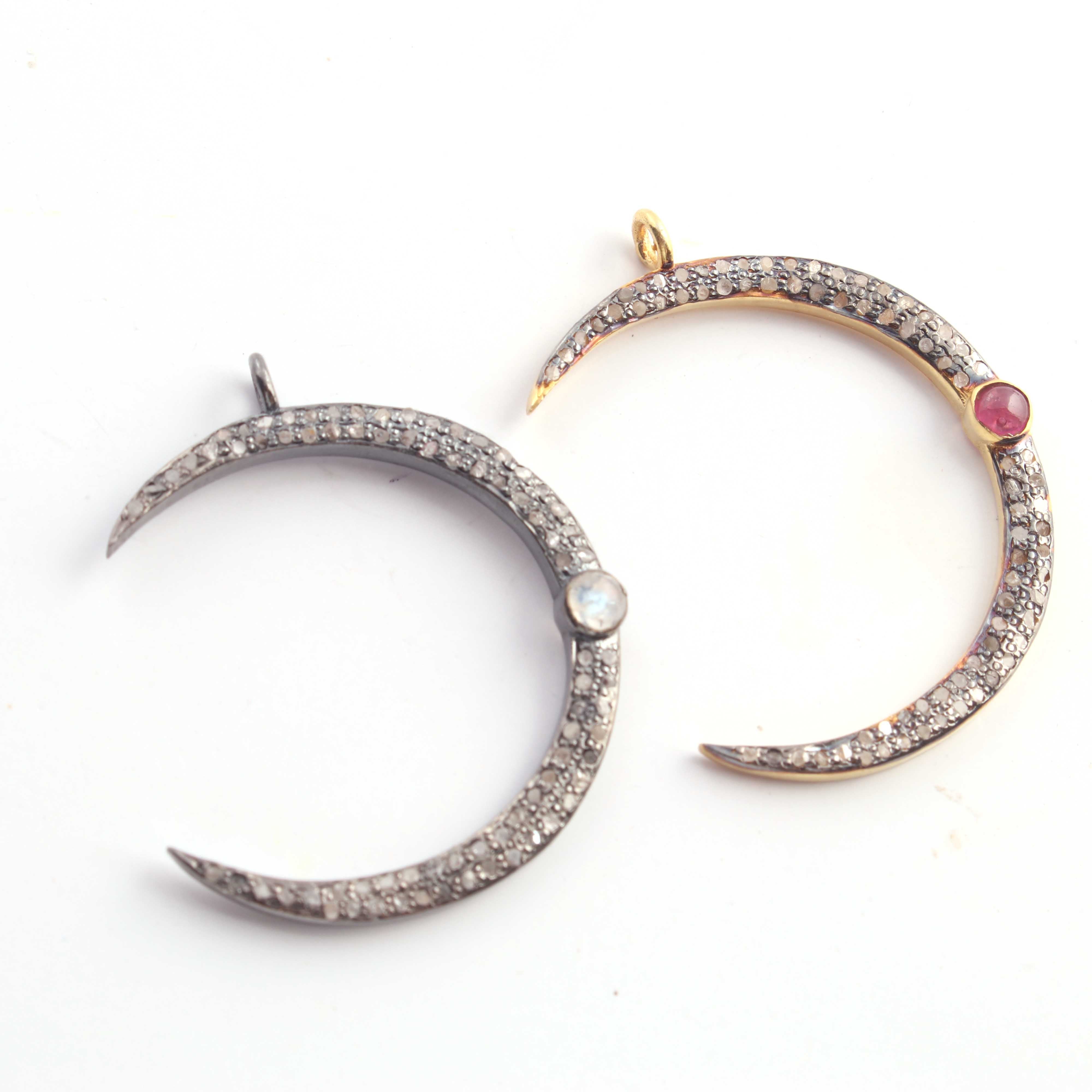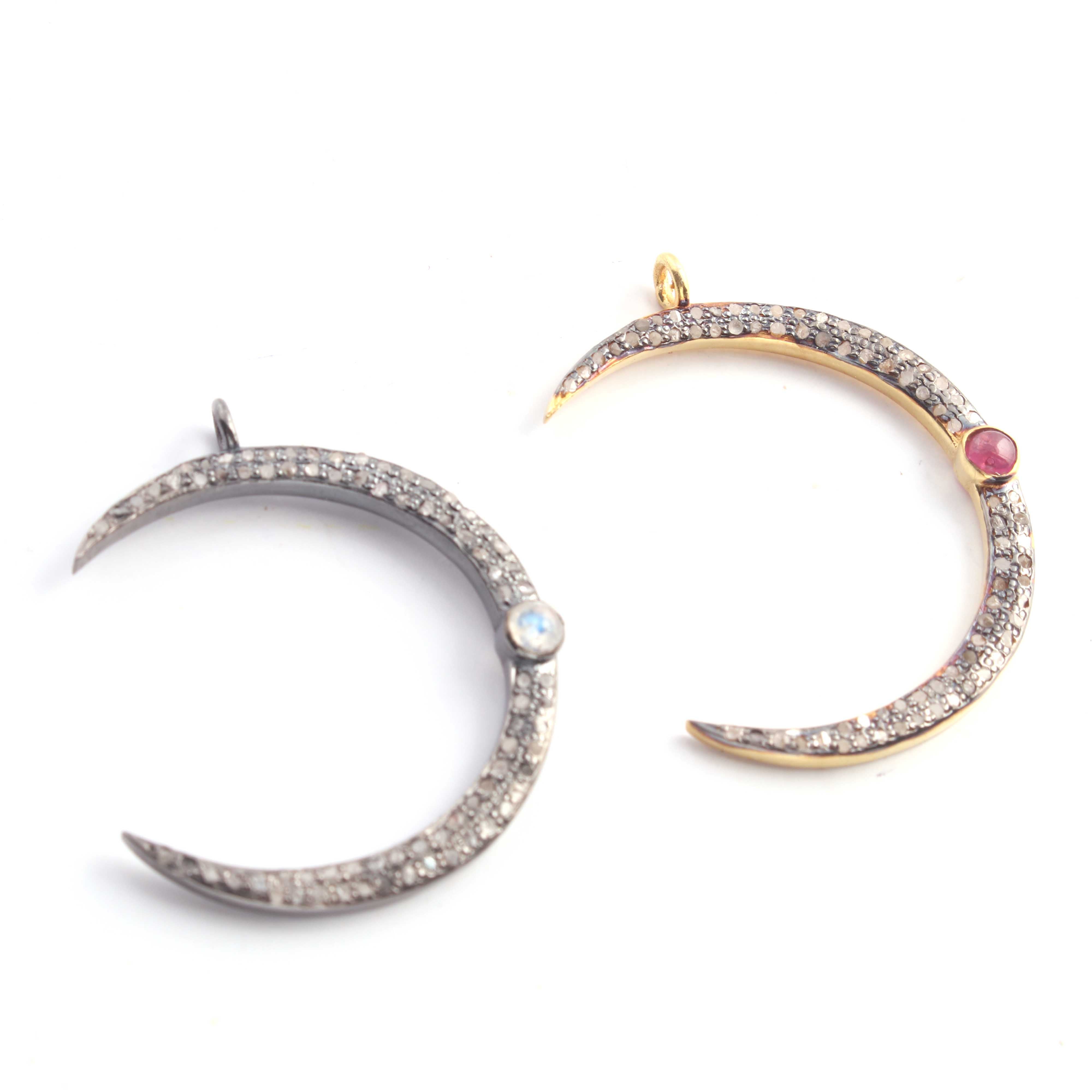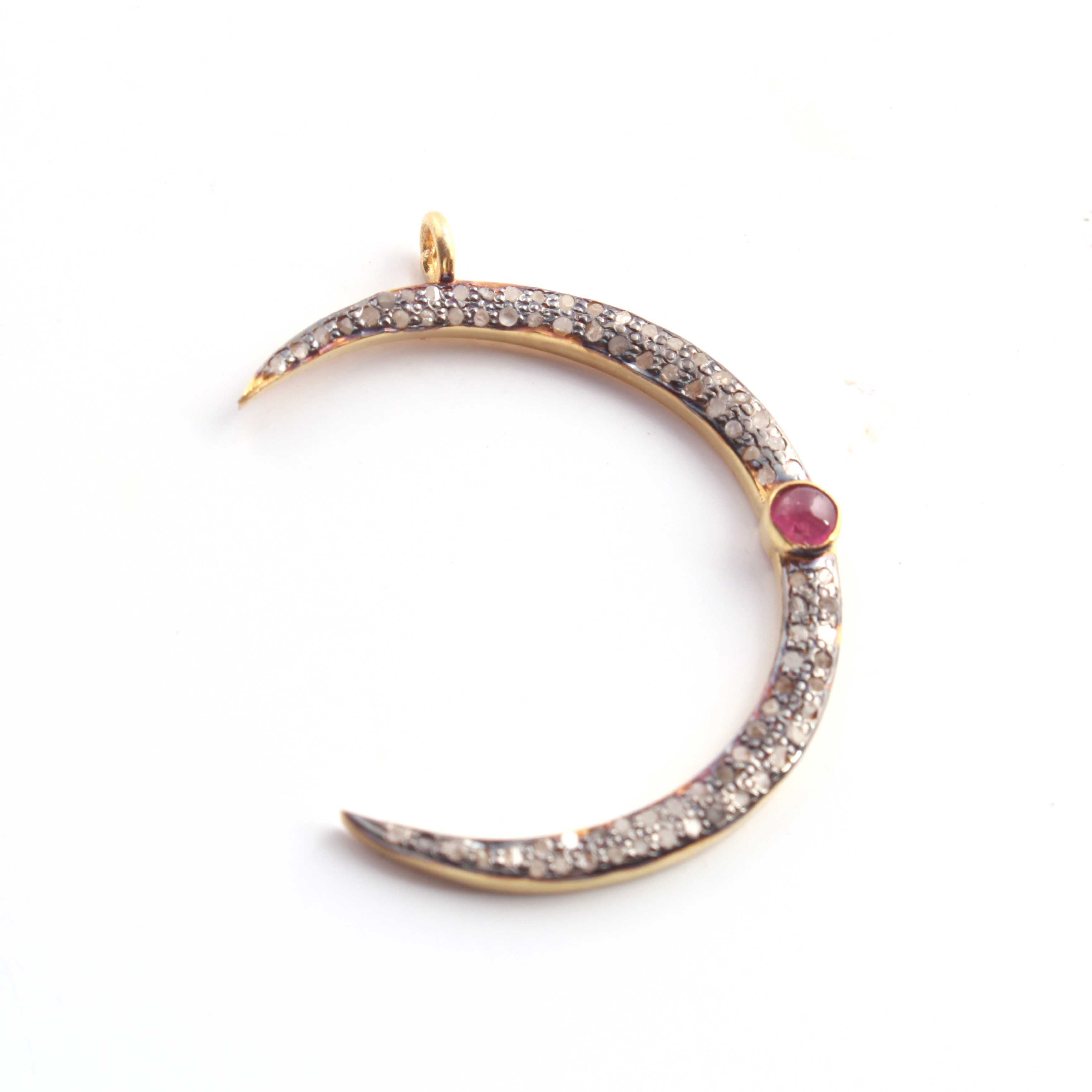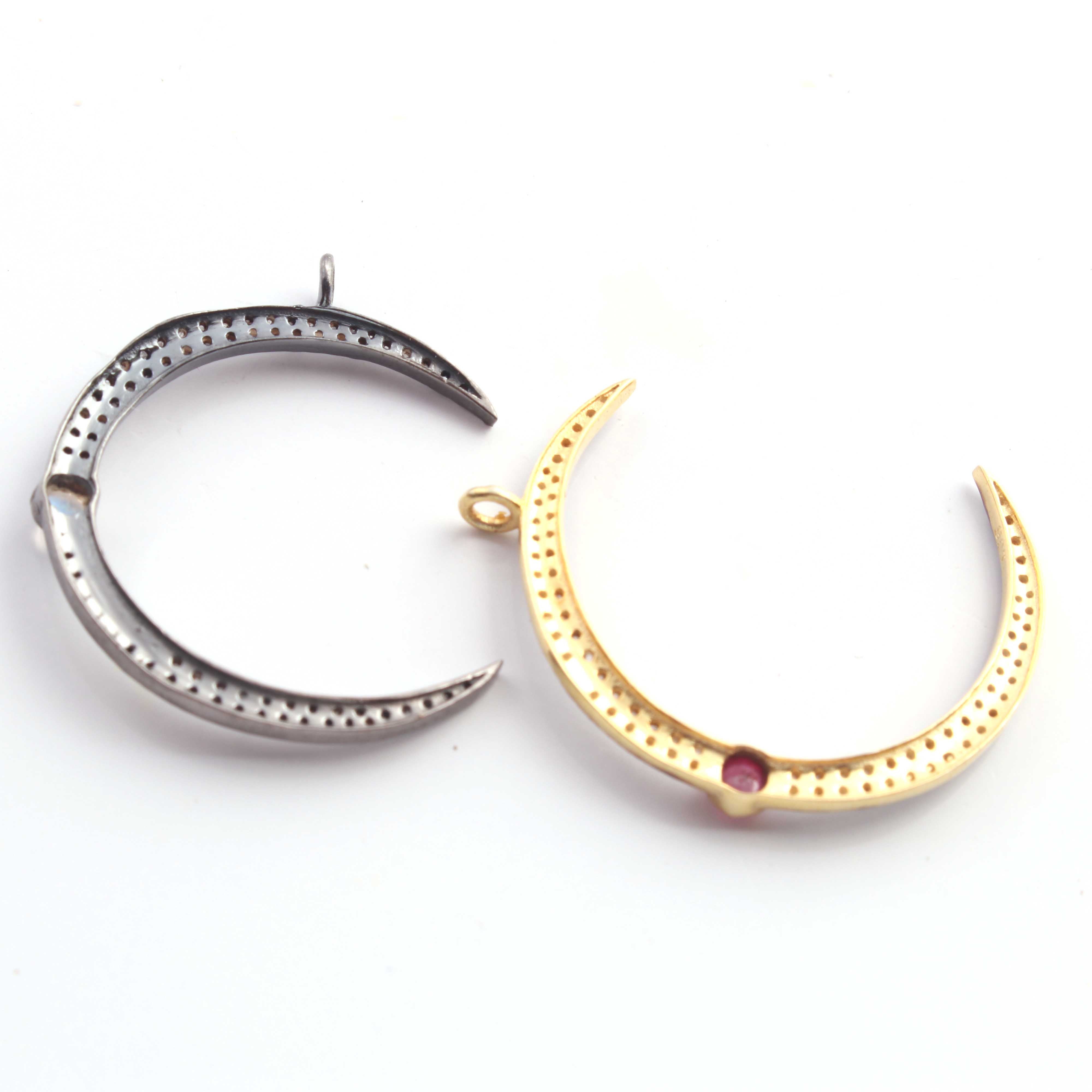 1 Pc Pave Diamond Moon With Moonstone & Ruby Gemstone Charm 925 Sterling Silver & Vermeil Single Bail Pendant 30mmX4mm PDC314