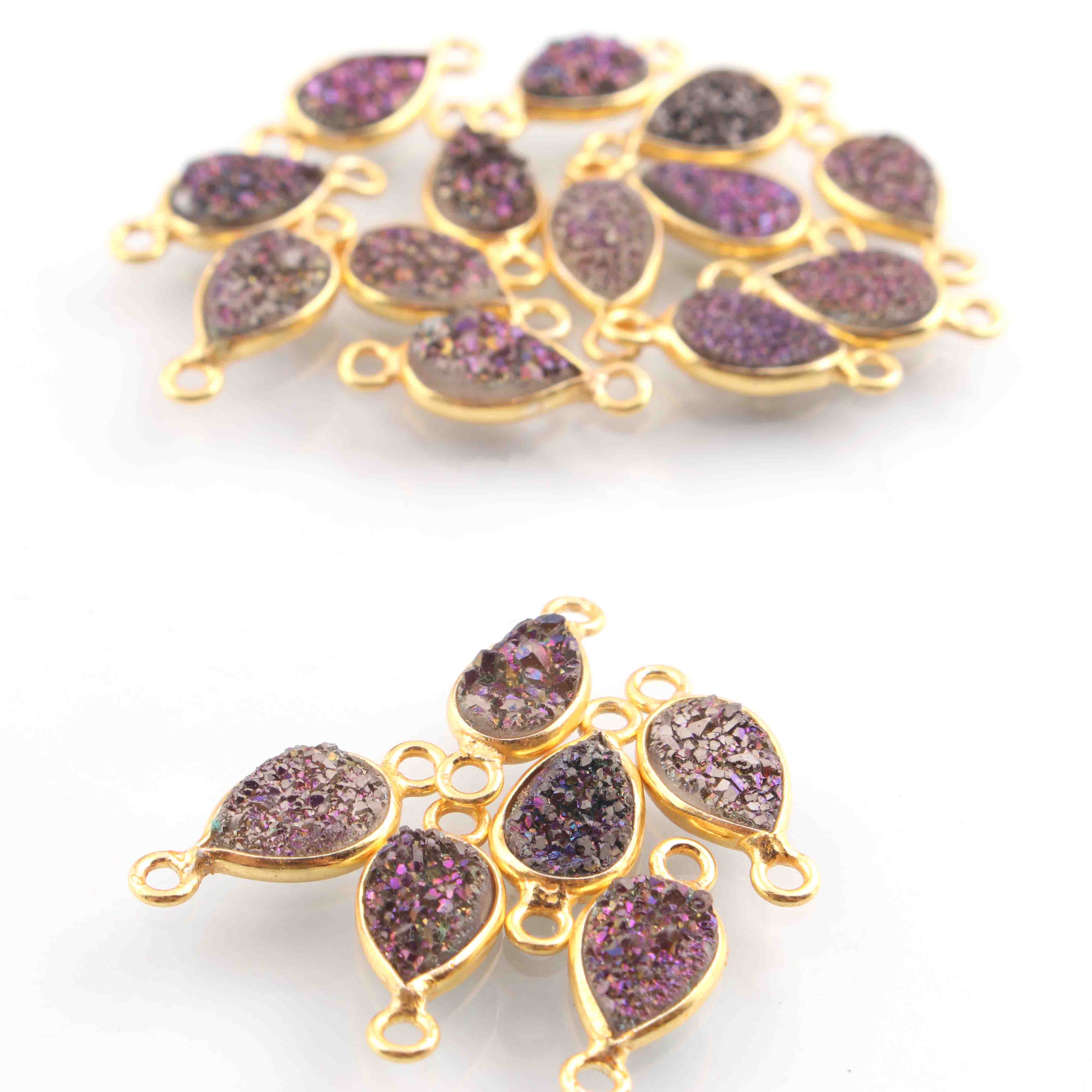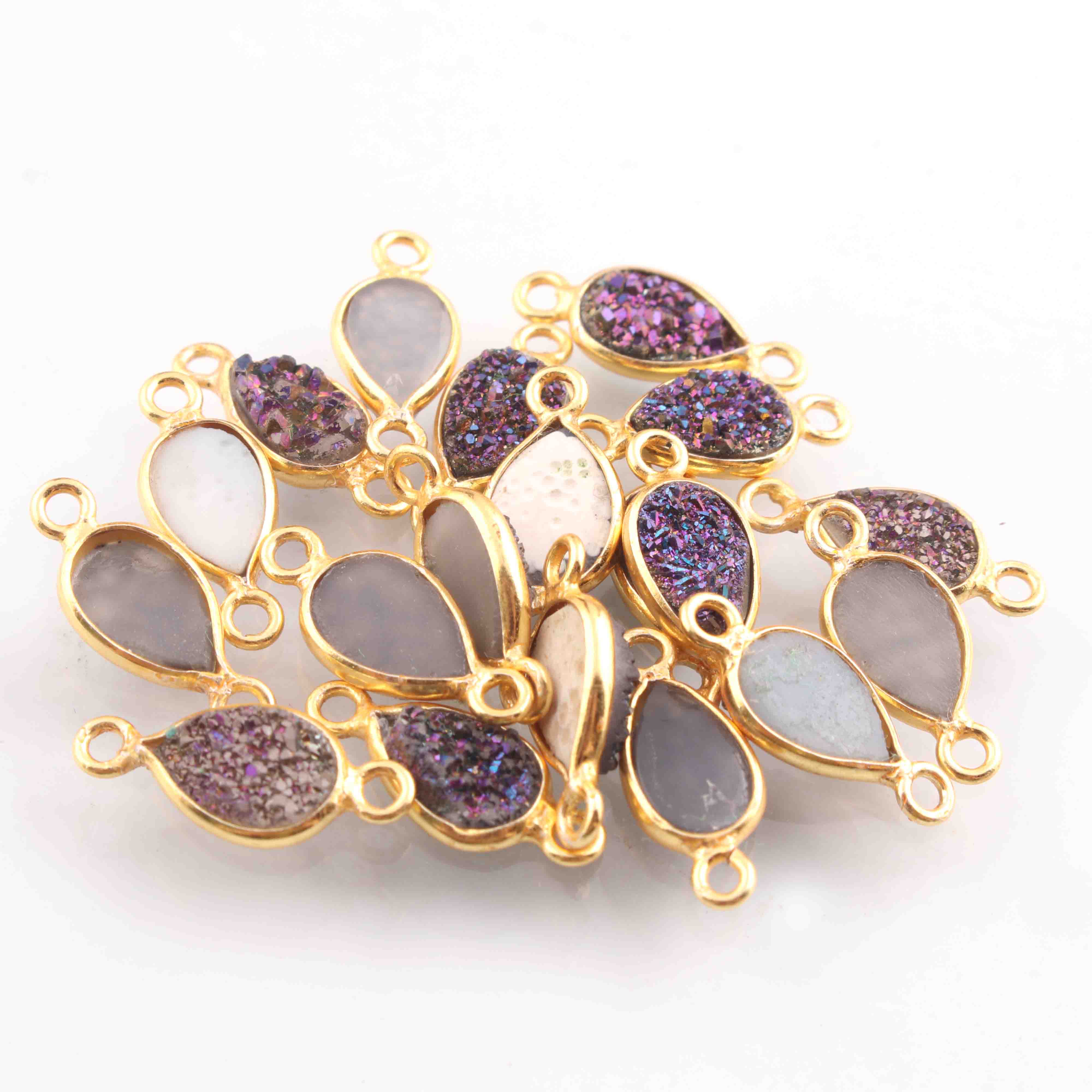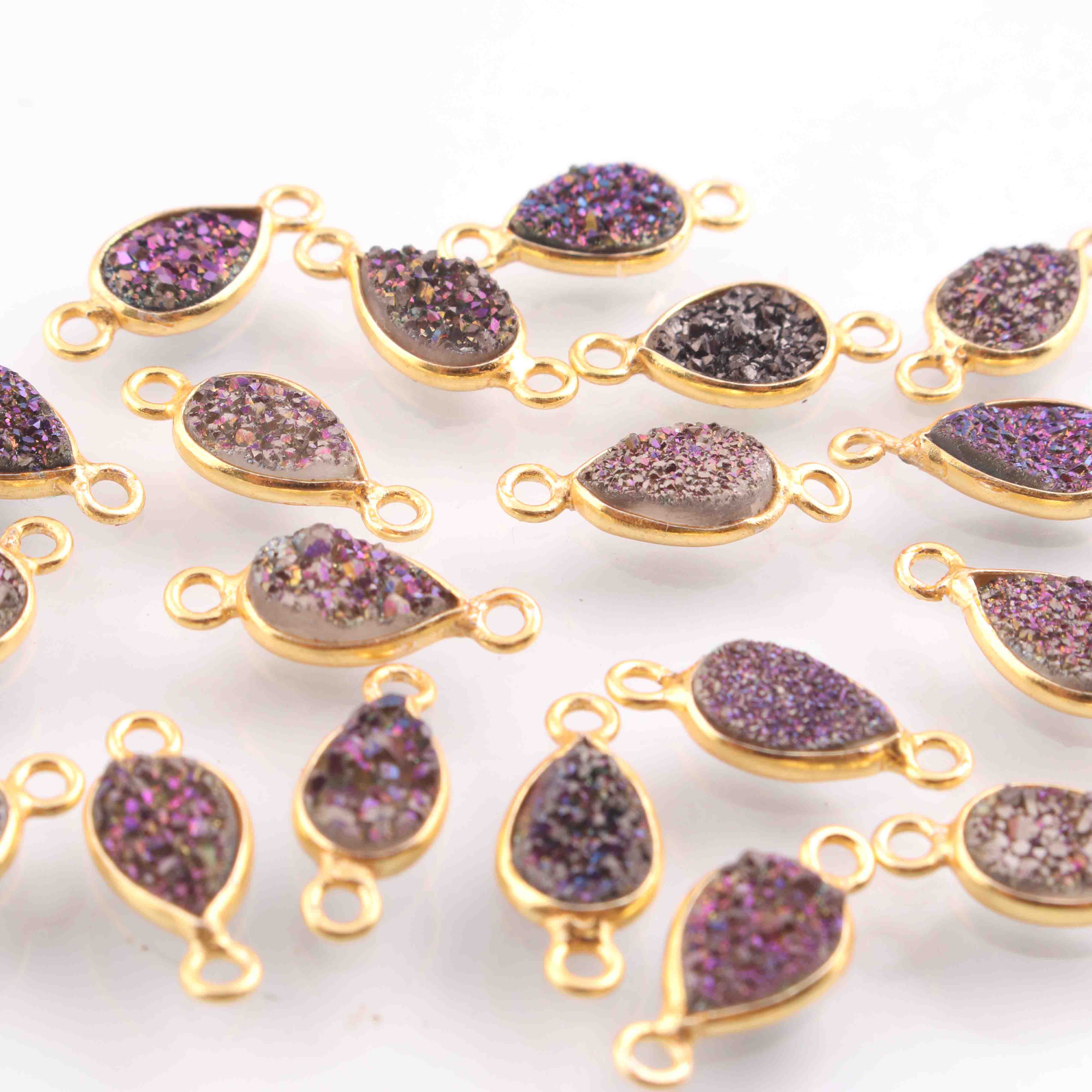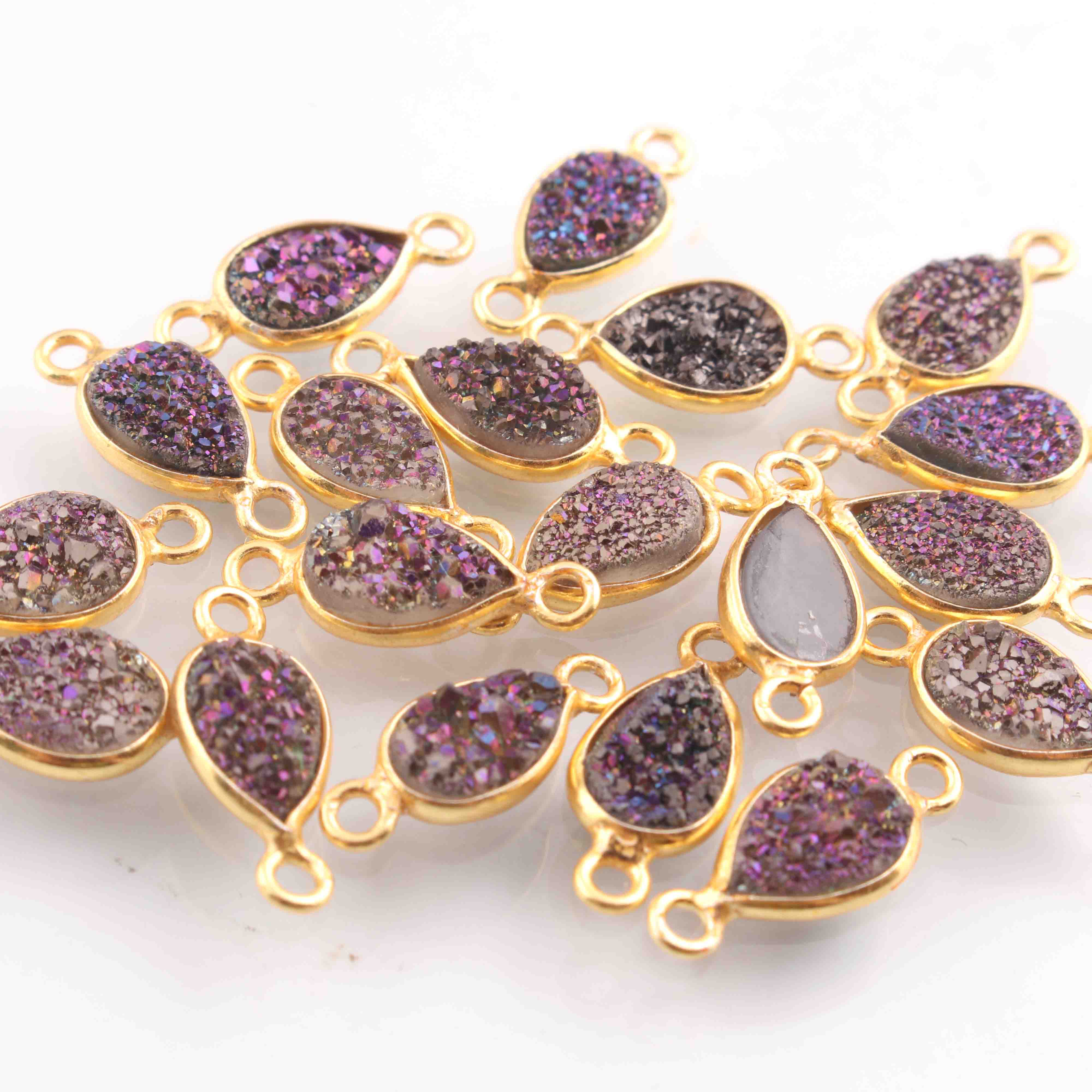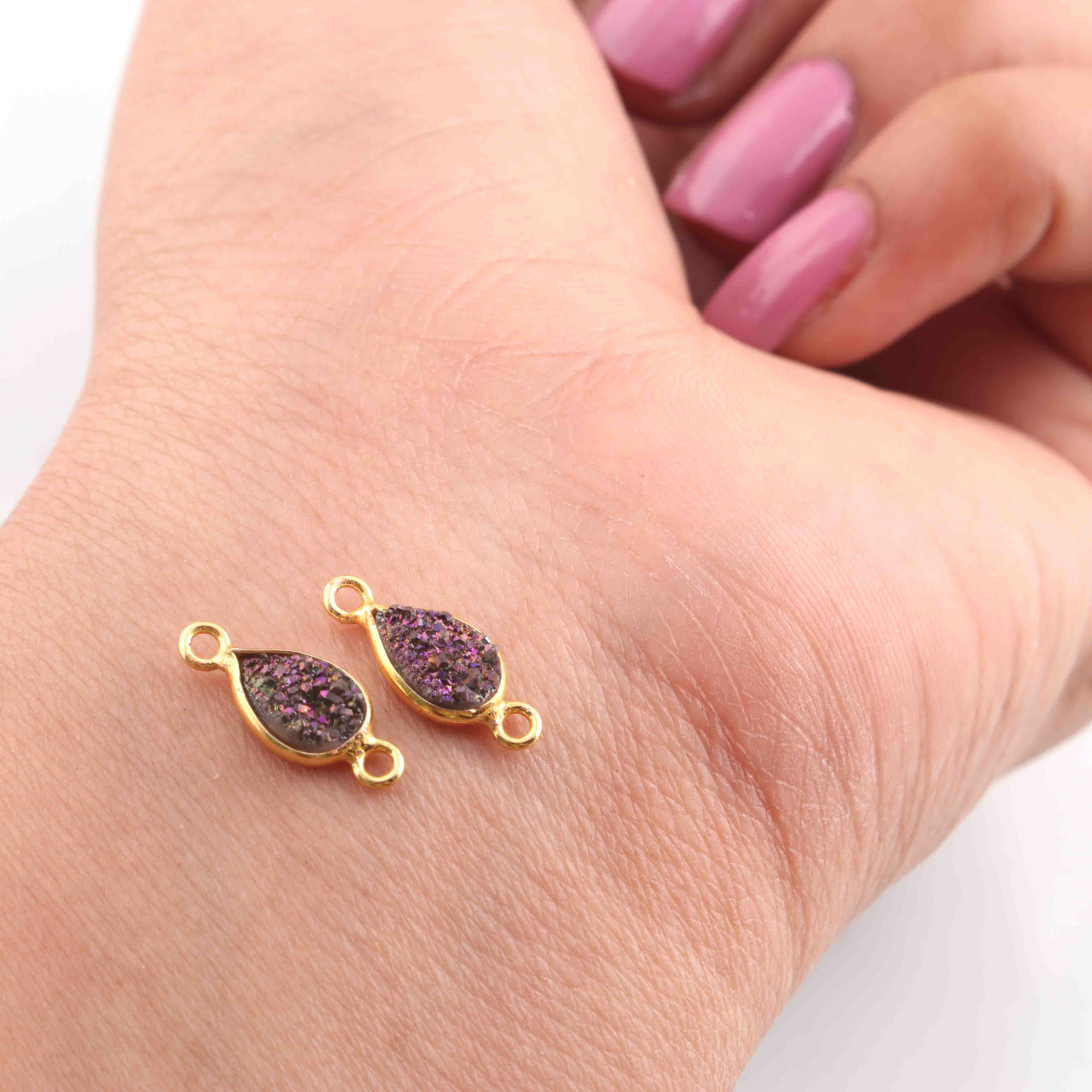 9 Pcs Mystic Pink Druzy Pear 925 Sterling Vermeil Double Bail Connector - 15mmx6mm- SS1143