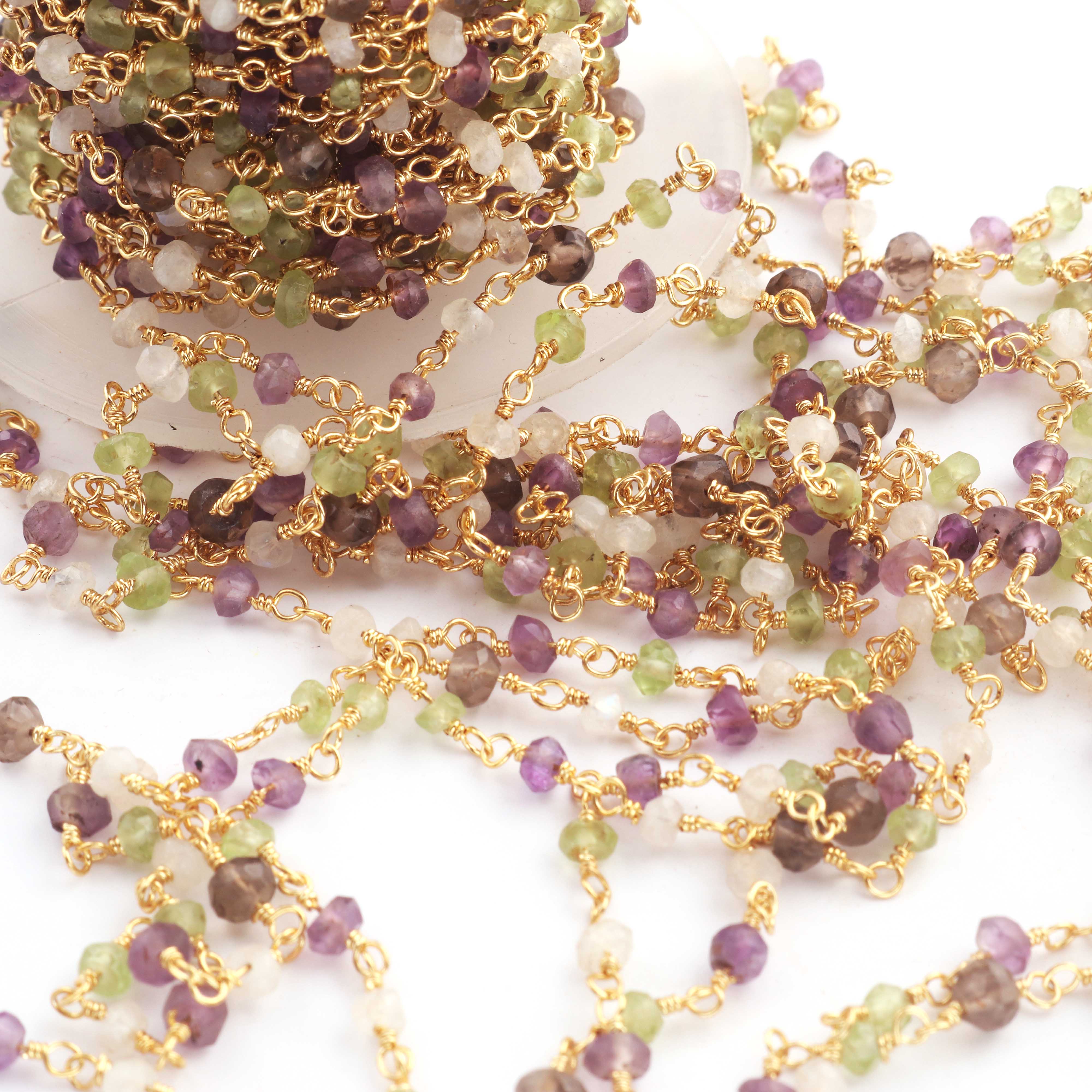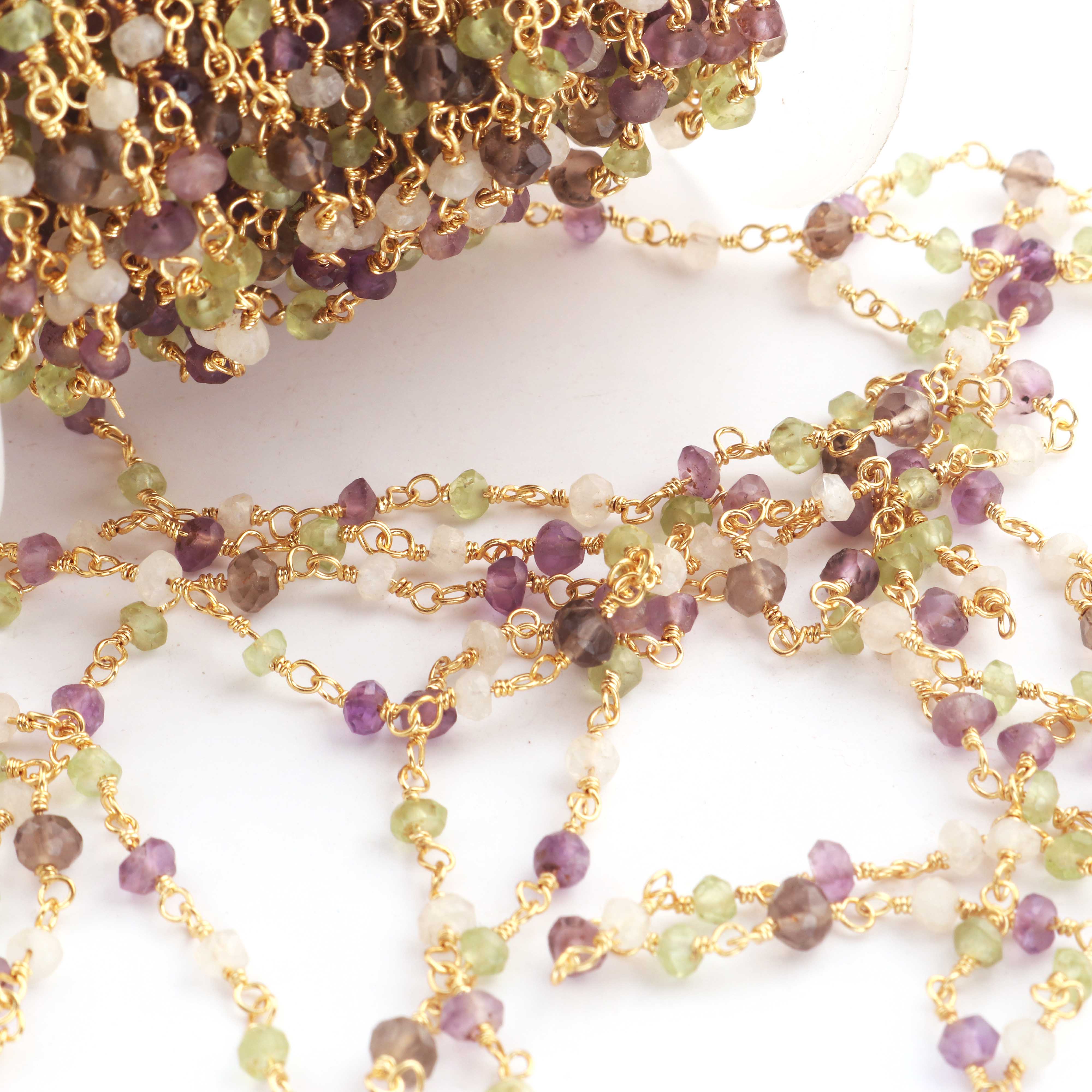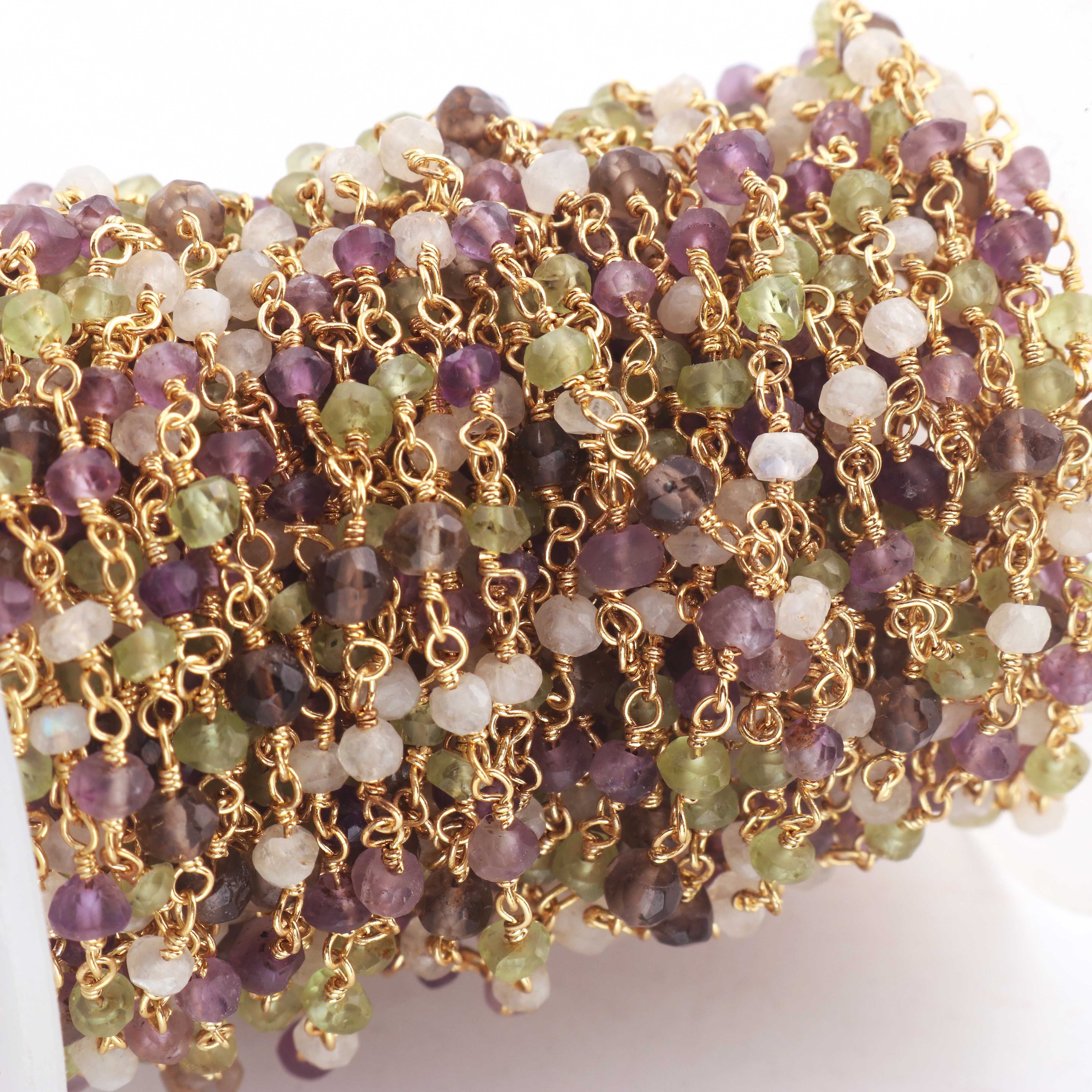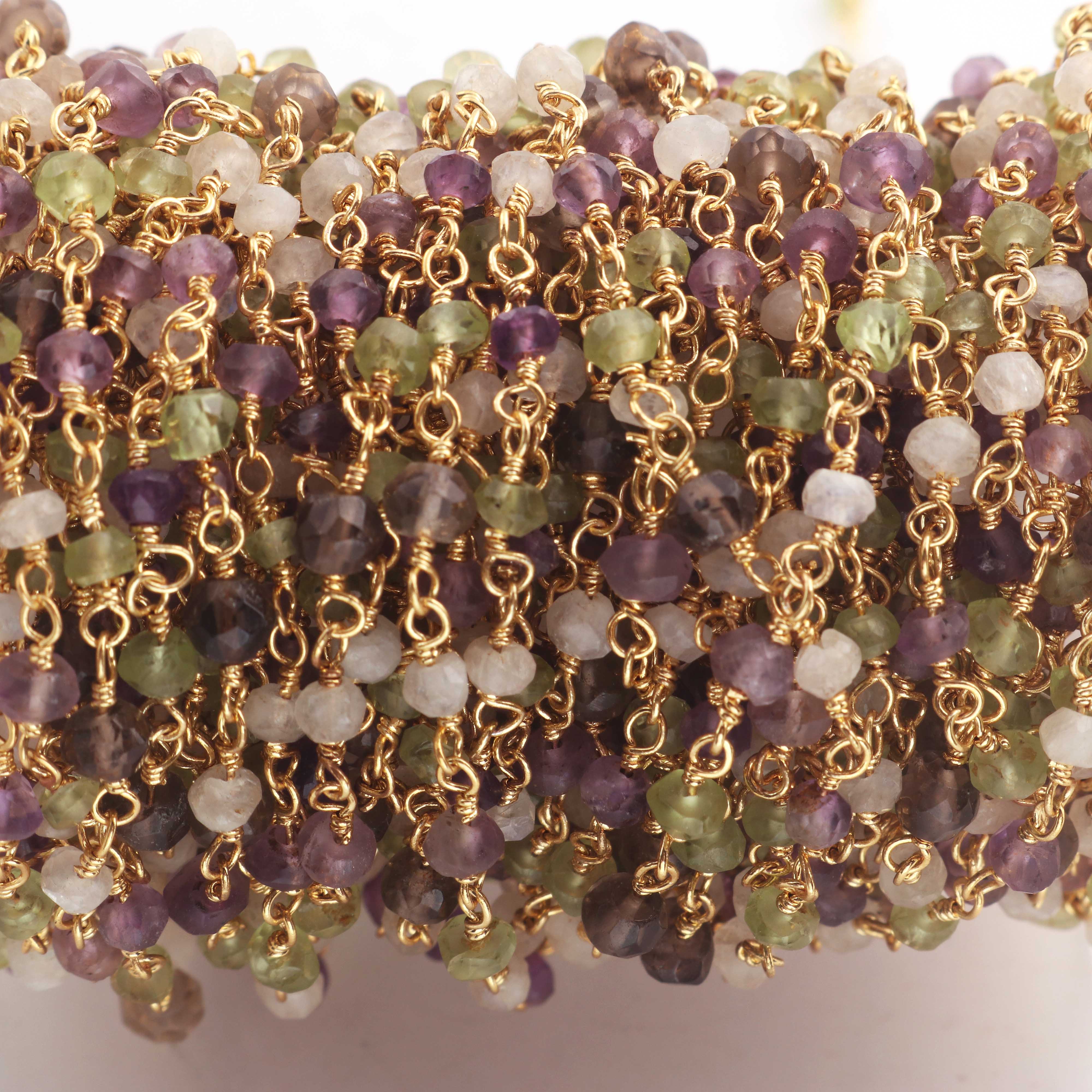 5 Feet Mix Stone Rosary 3mm- Amethyst, Moonstone, Peridot 24K Gold Plated Wire Wrapped Rosary Style Beaded Chain BDG144