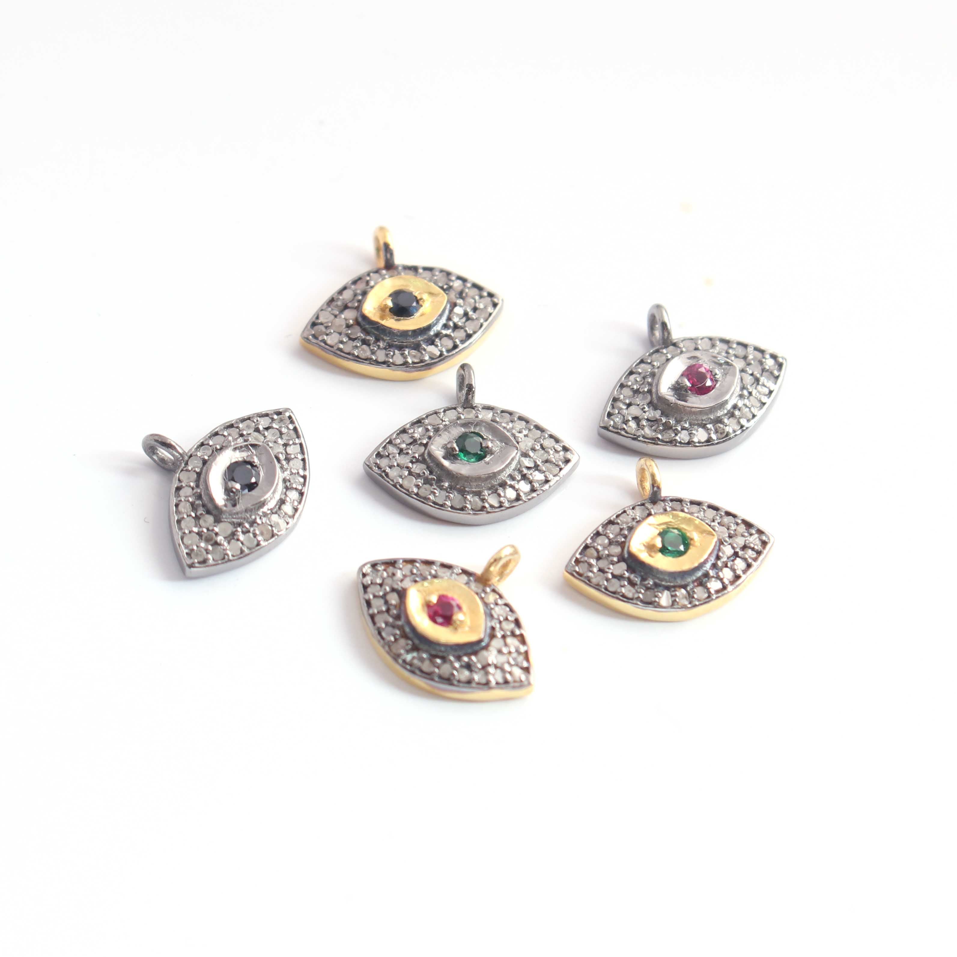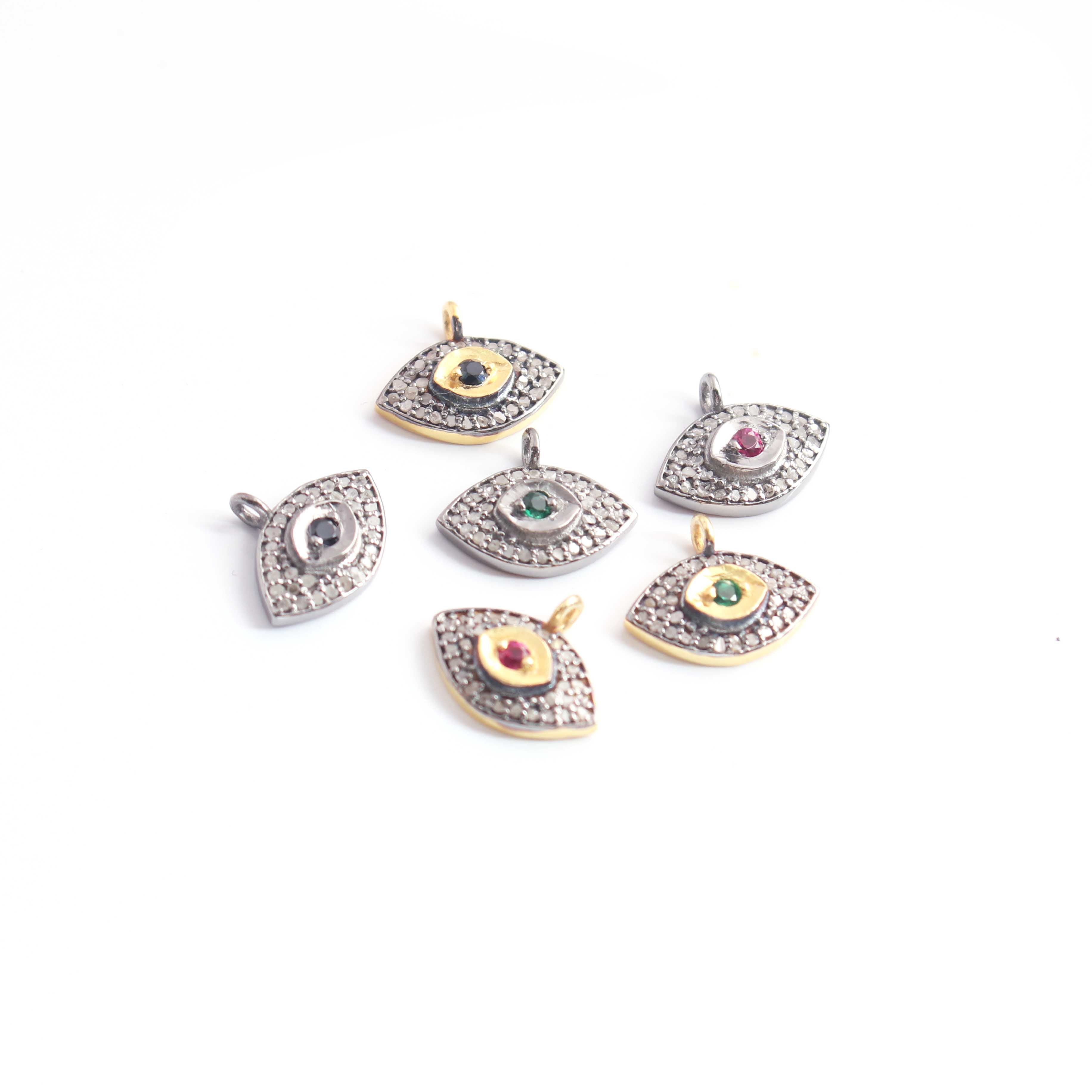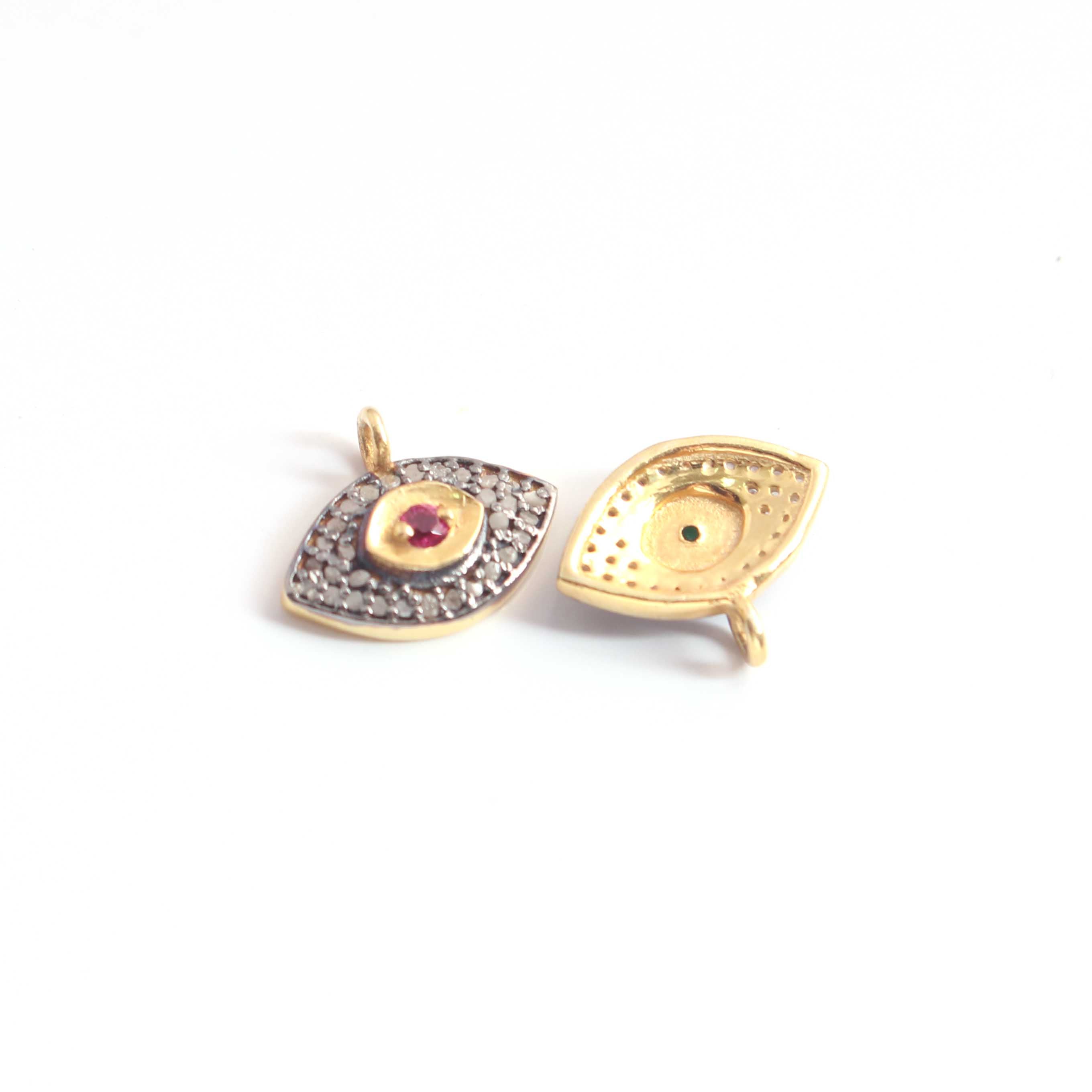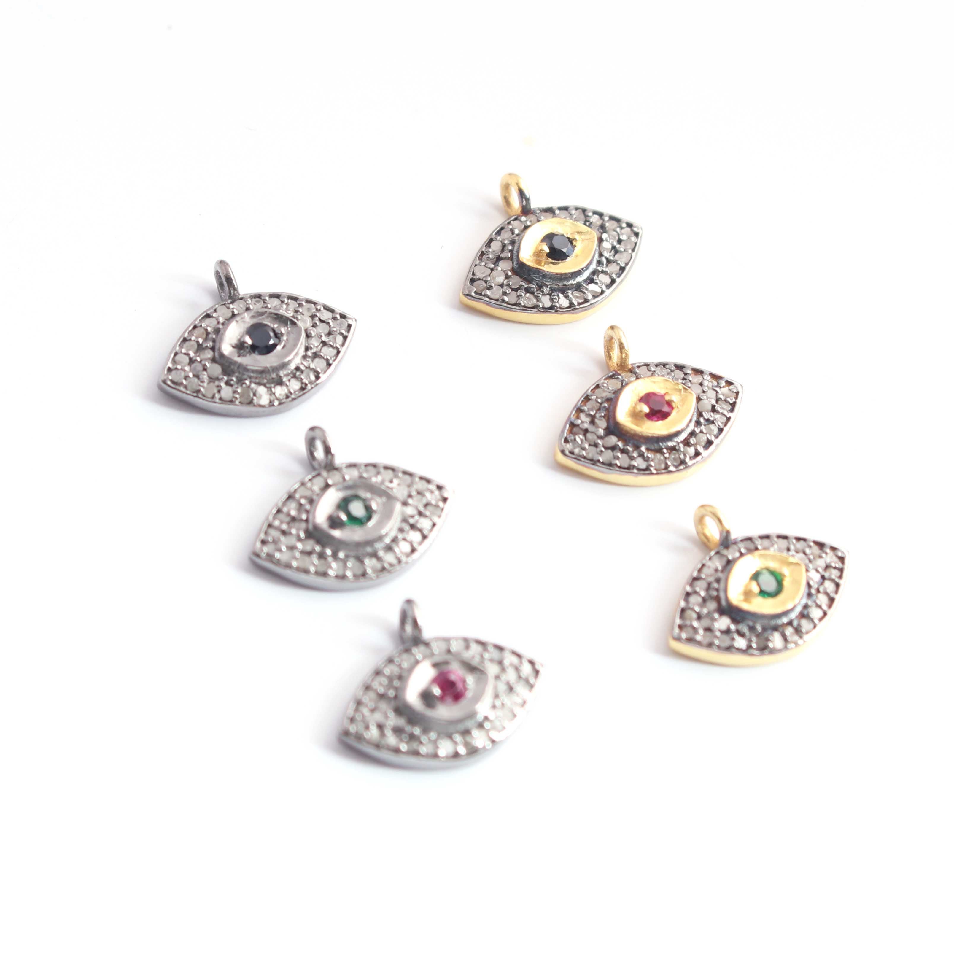 1 Pc Pave Diamond Center in Ruby, Emerald and Blue Sapphire Evil Eye Charm 925 Sterling Silver & Vermeil Pendant - 13mmx10mm PDC1204