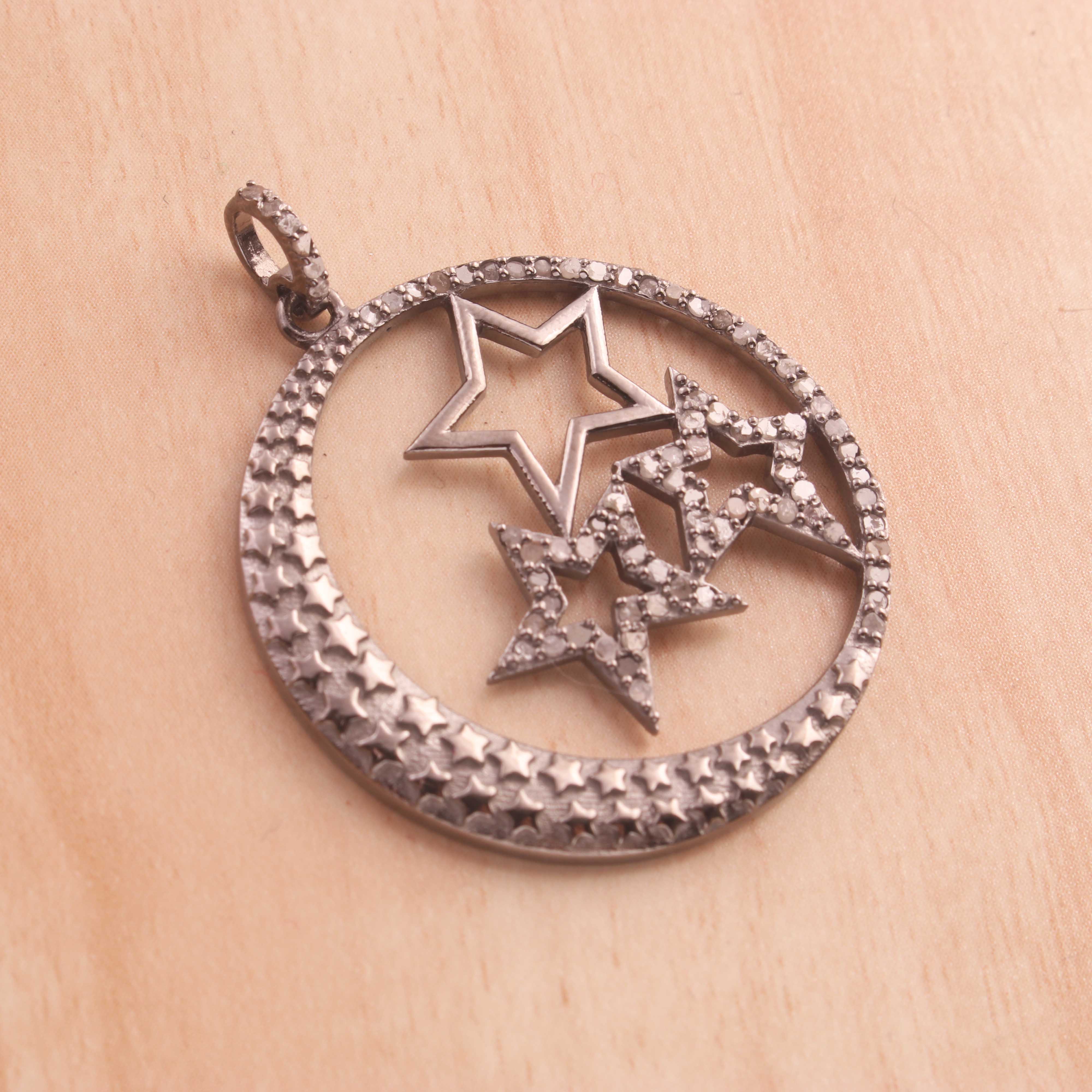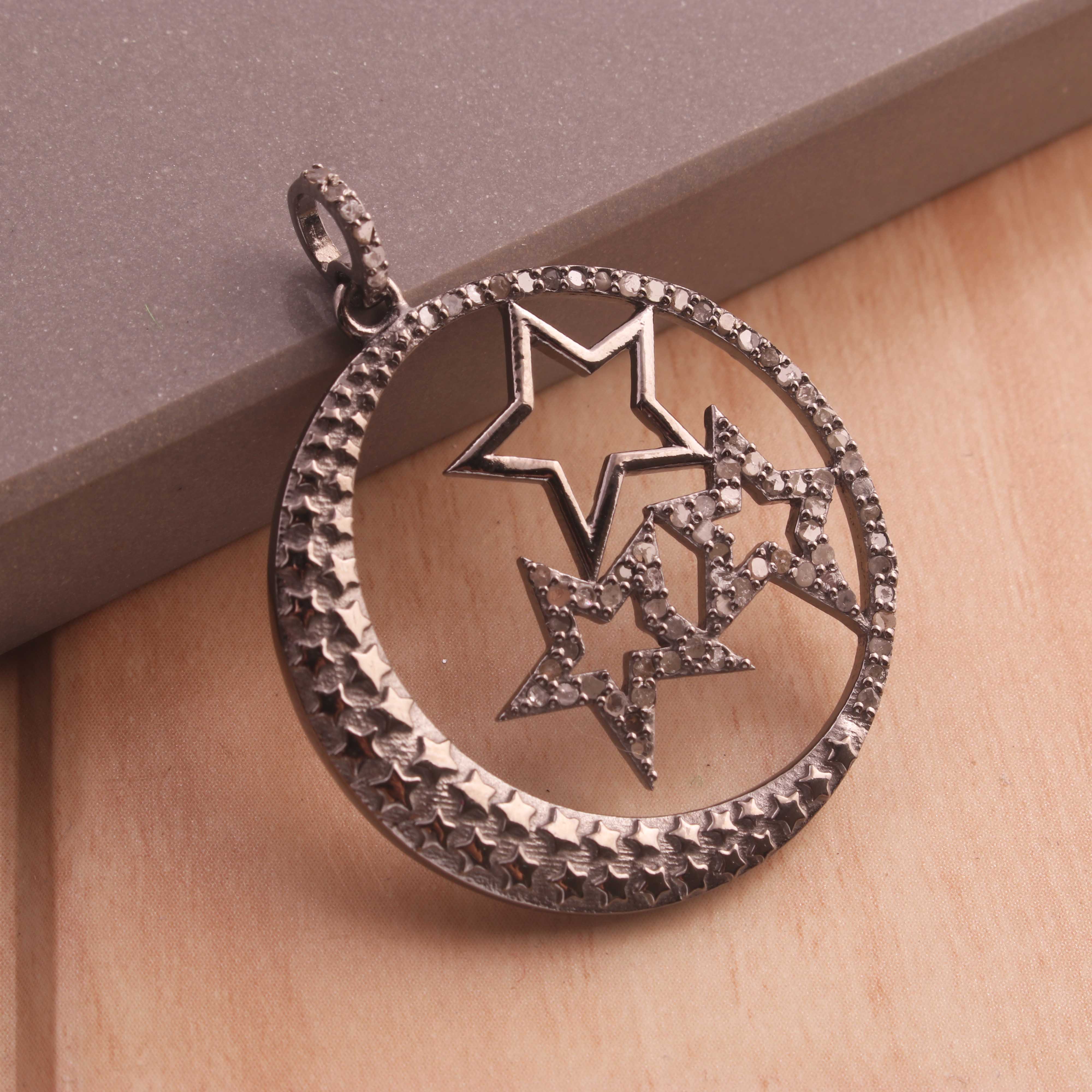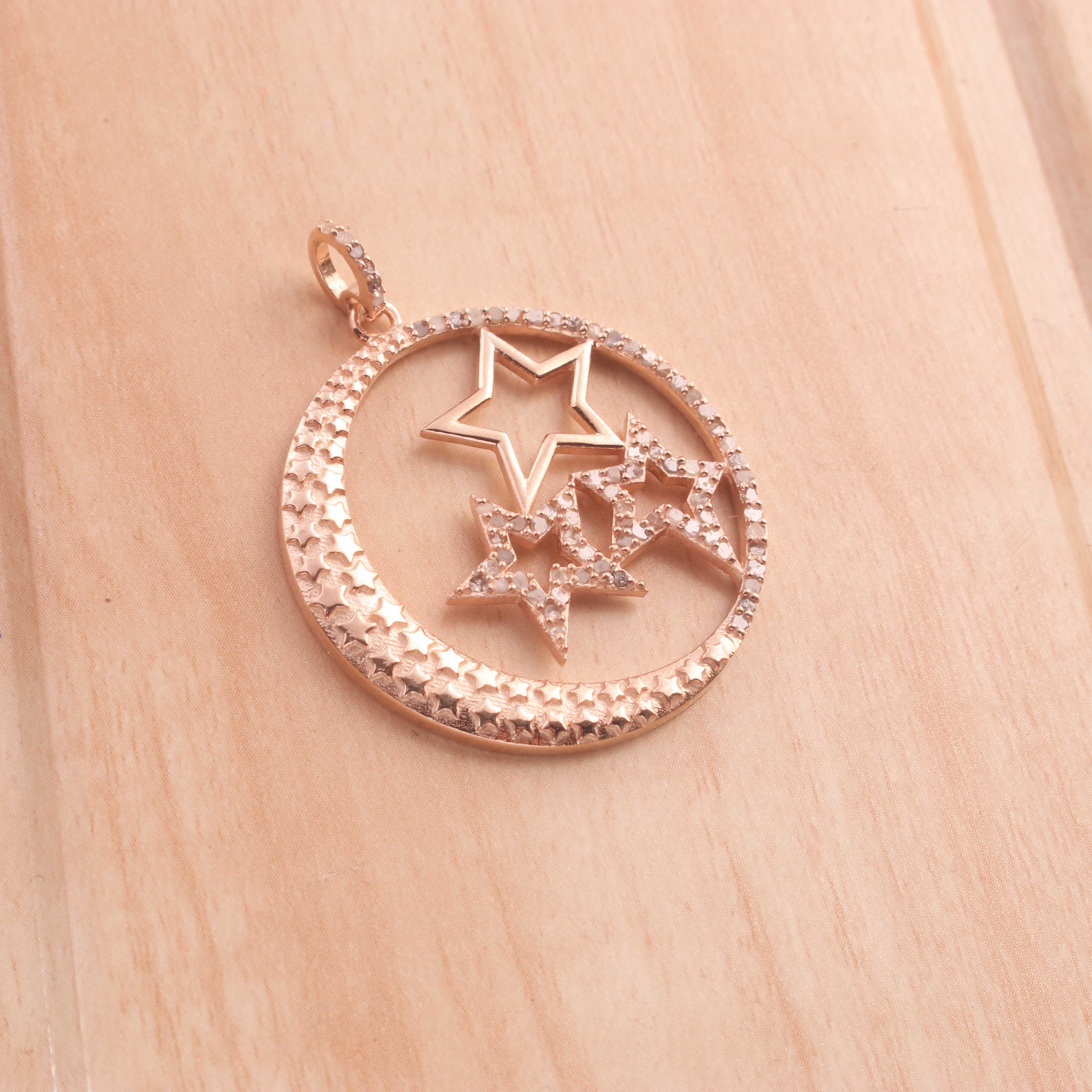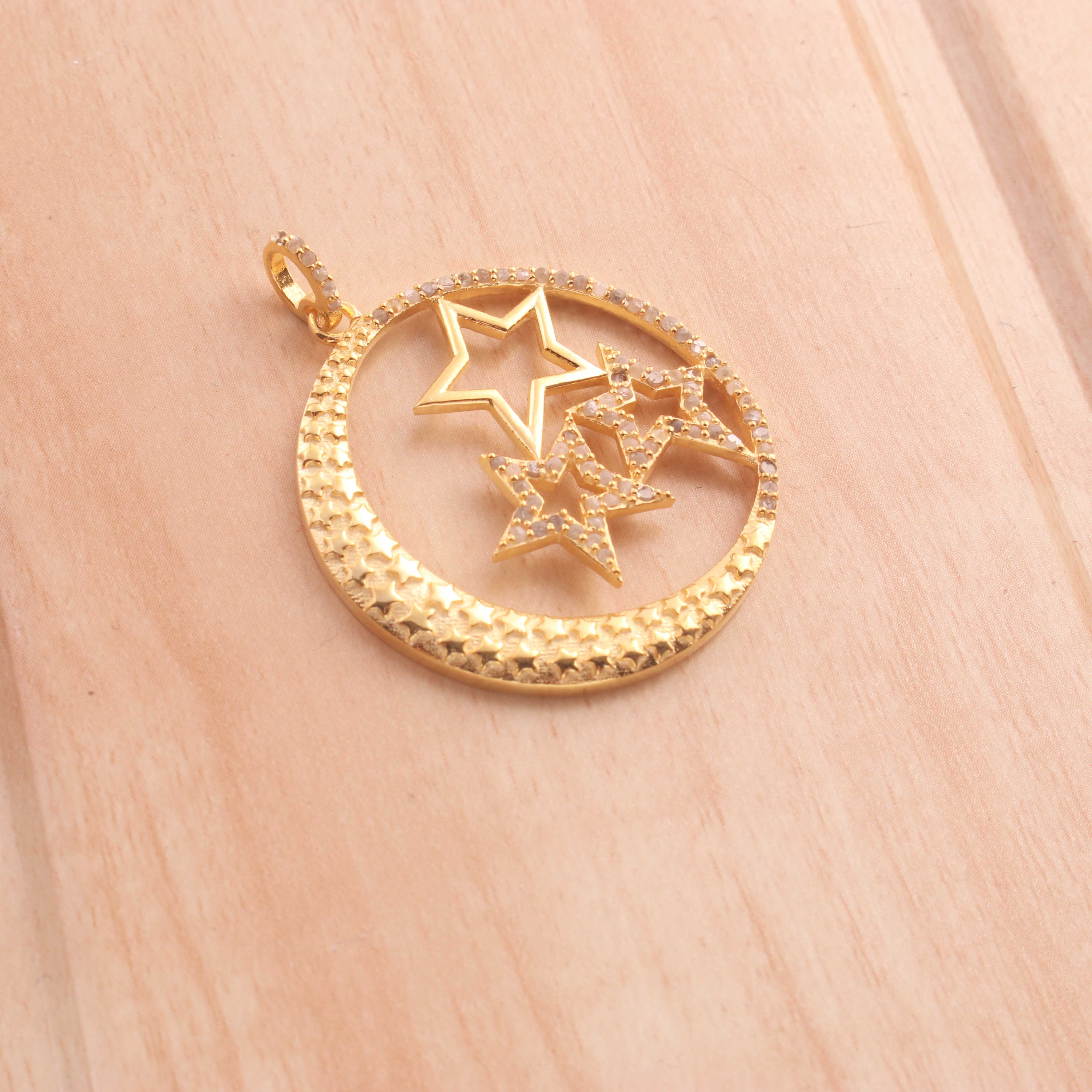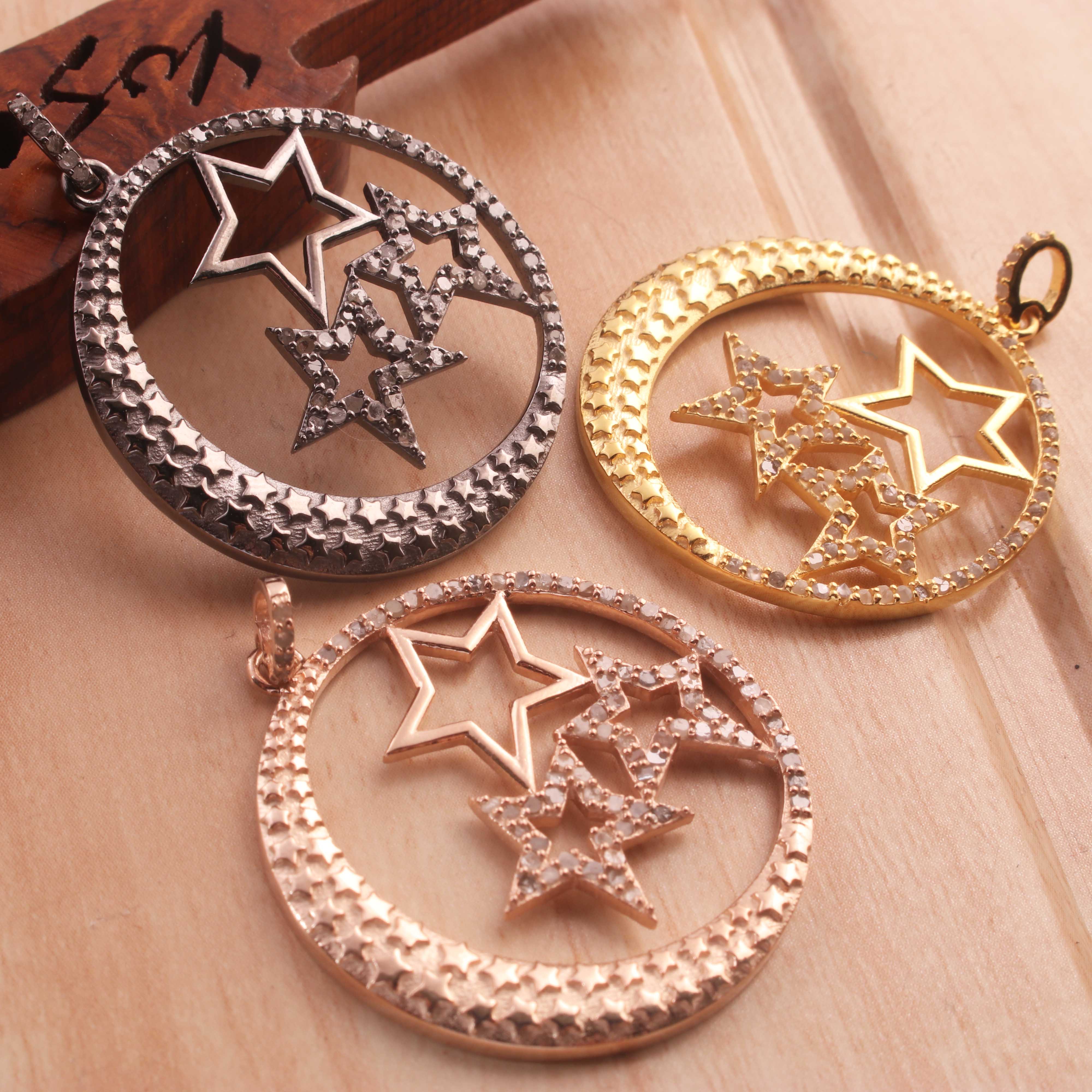 • 1 Pc Pave Diamond Round With Star Pendant - 925 Sterling Silver , Yellow & Rose Gold Vermeil -Diamond Pendant 42mmx30mm PD1820