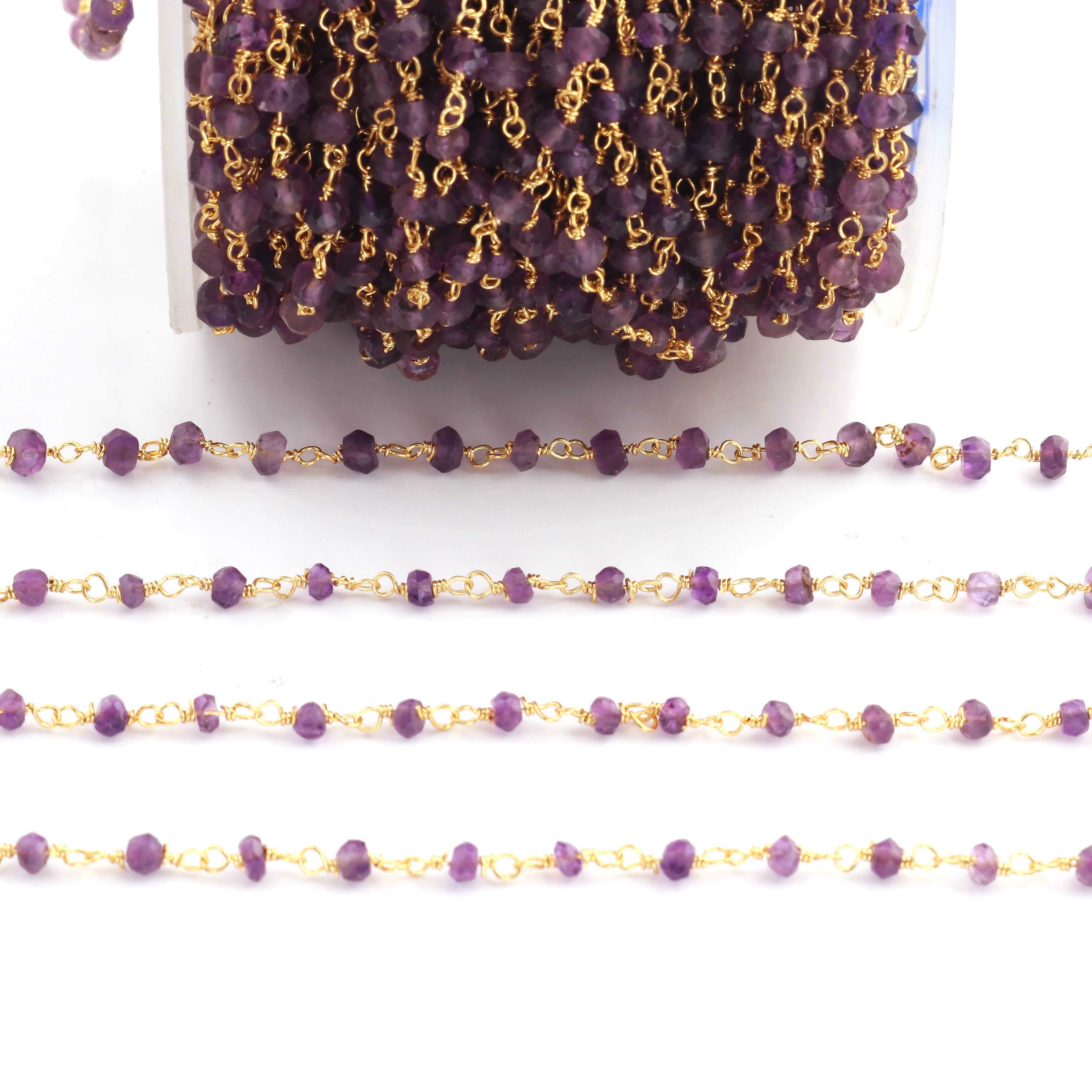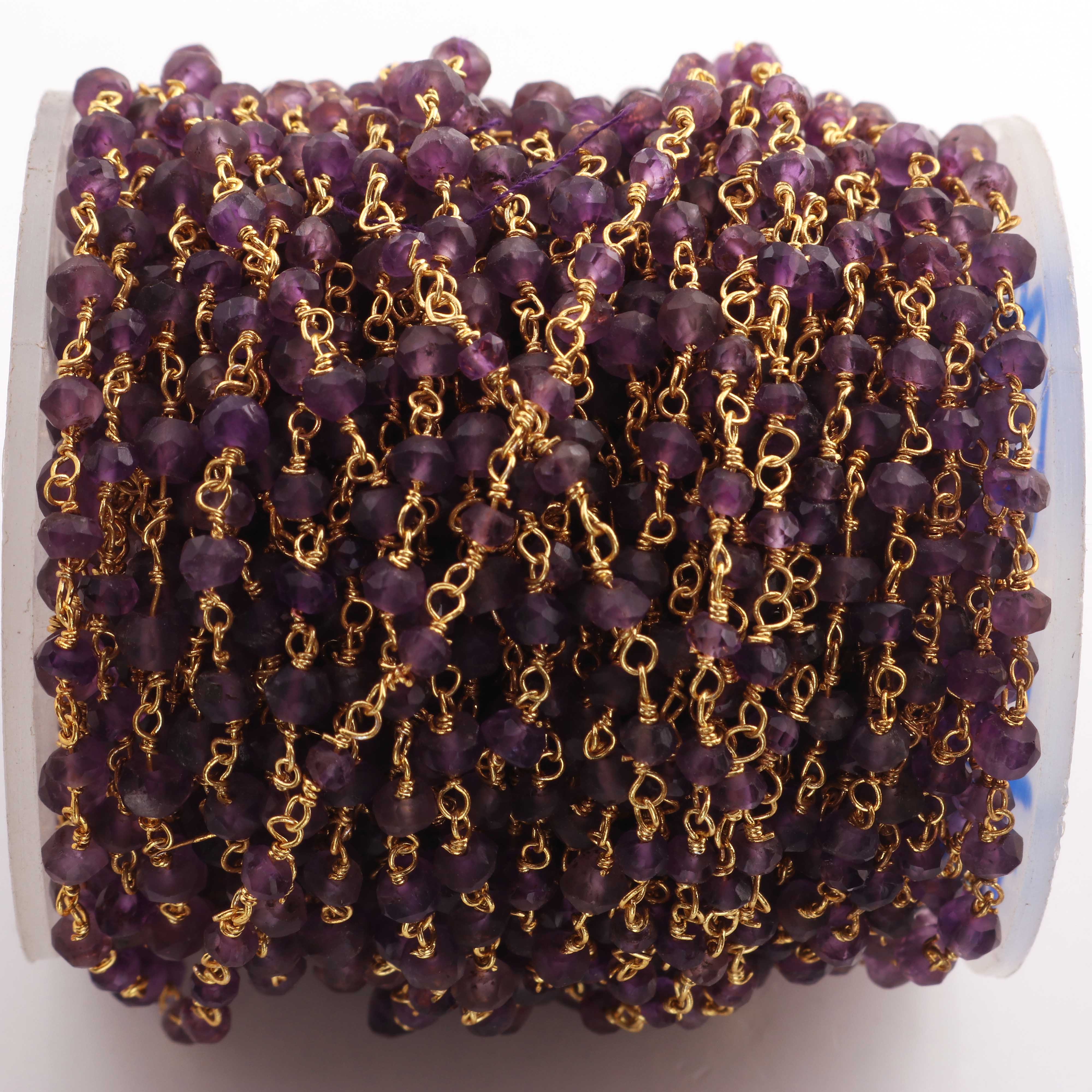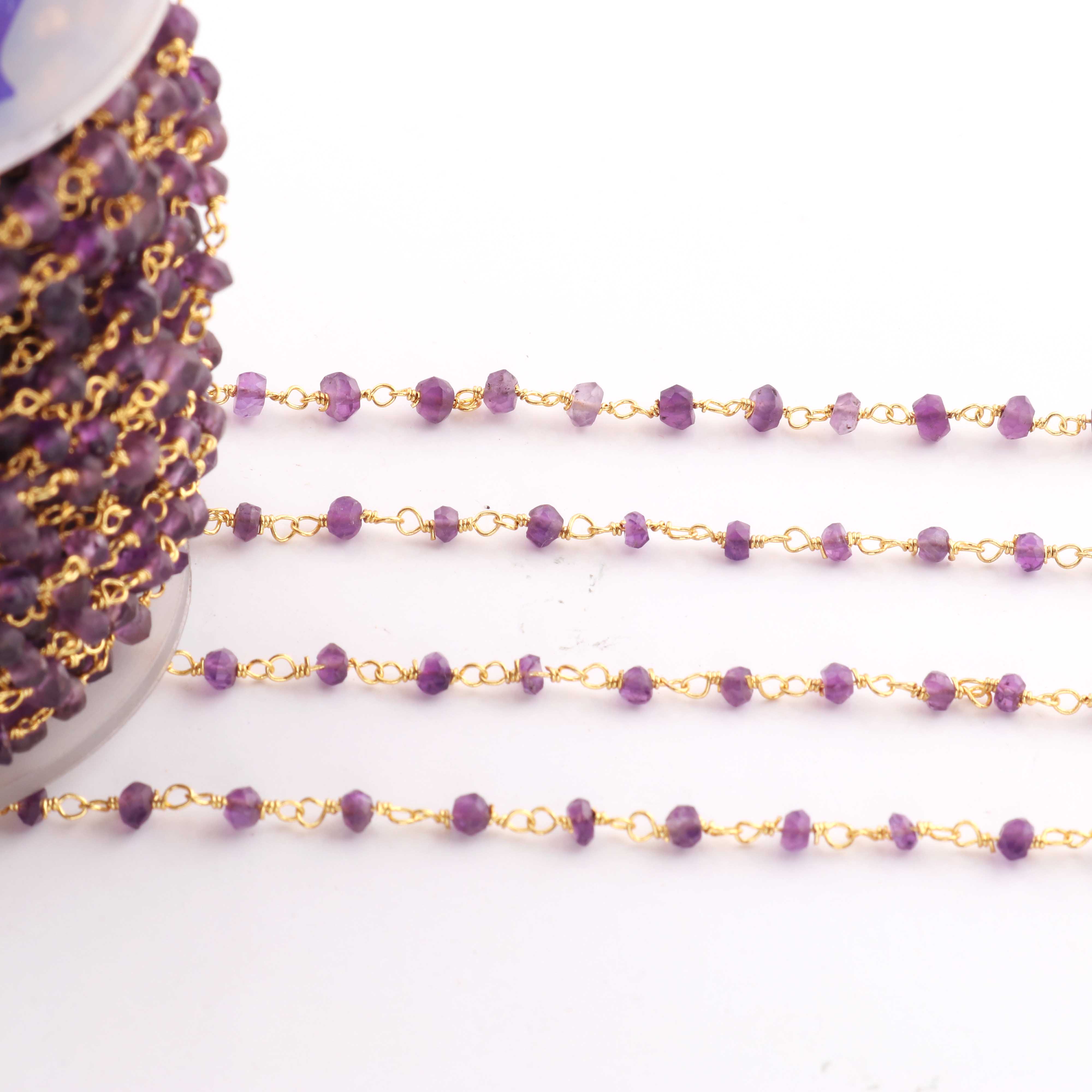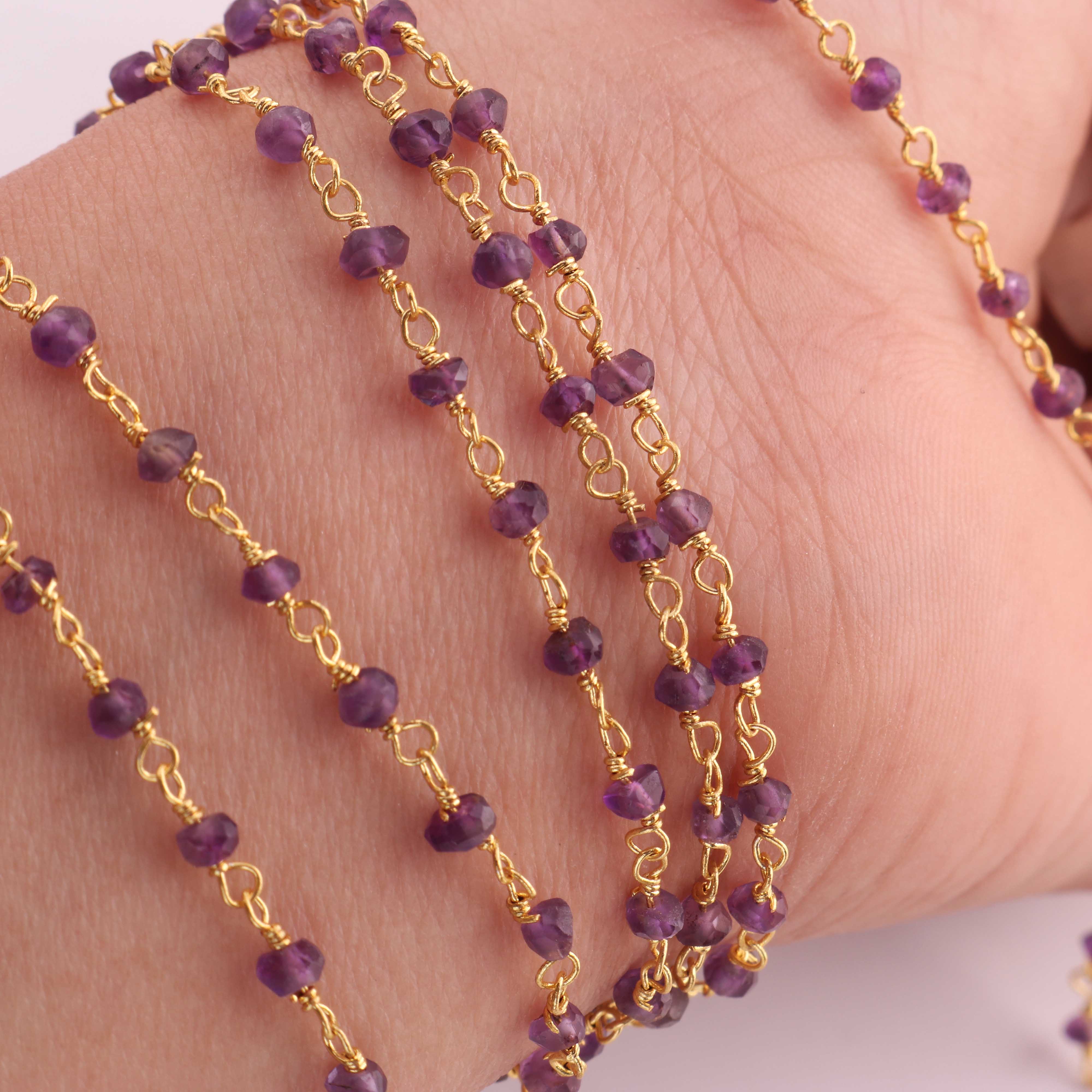 3 Feet Amethyst 3mm Faceted Rosary Beaded chain- 24 K Gold Plated Wire Wrapped Chain