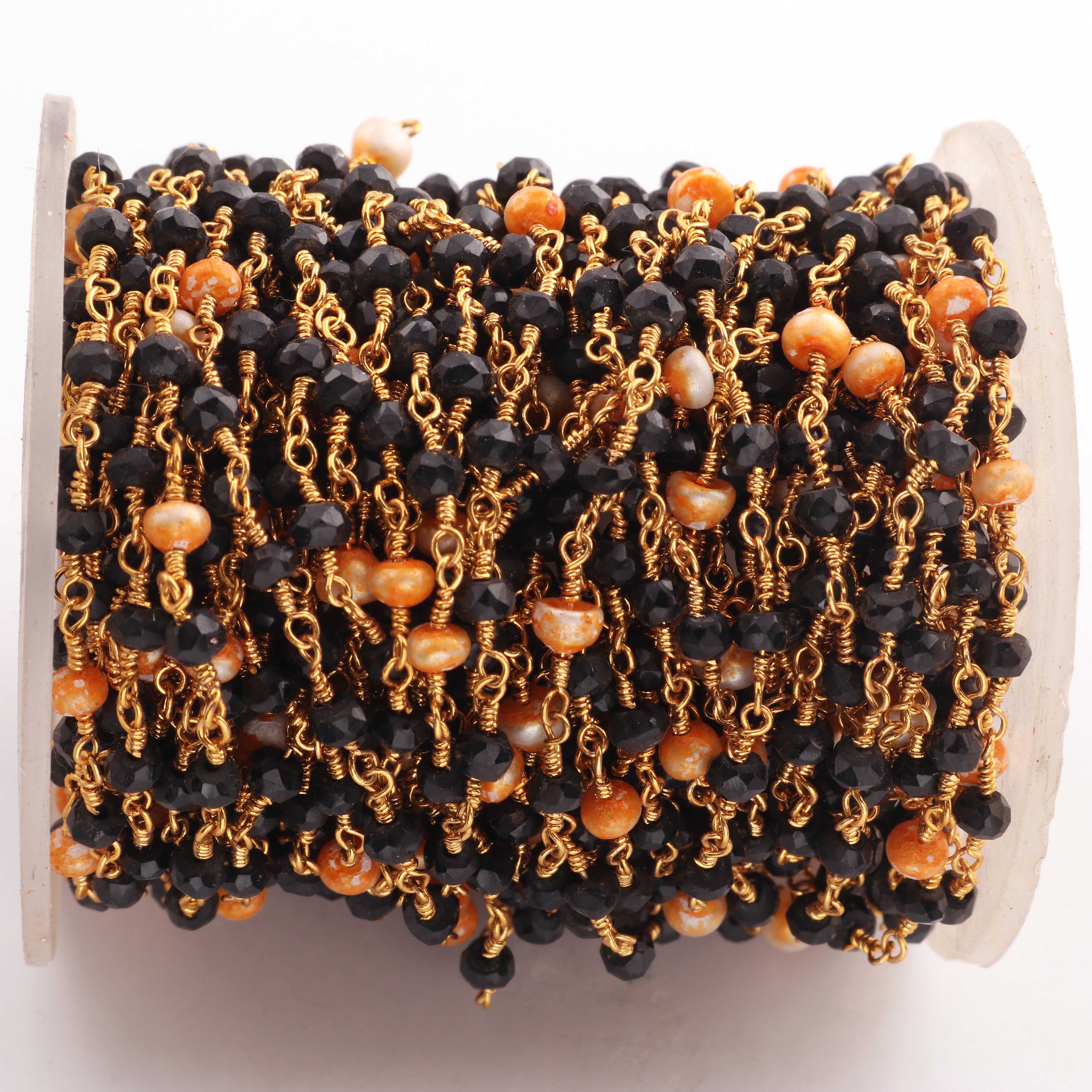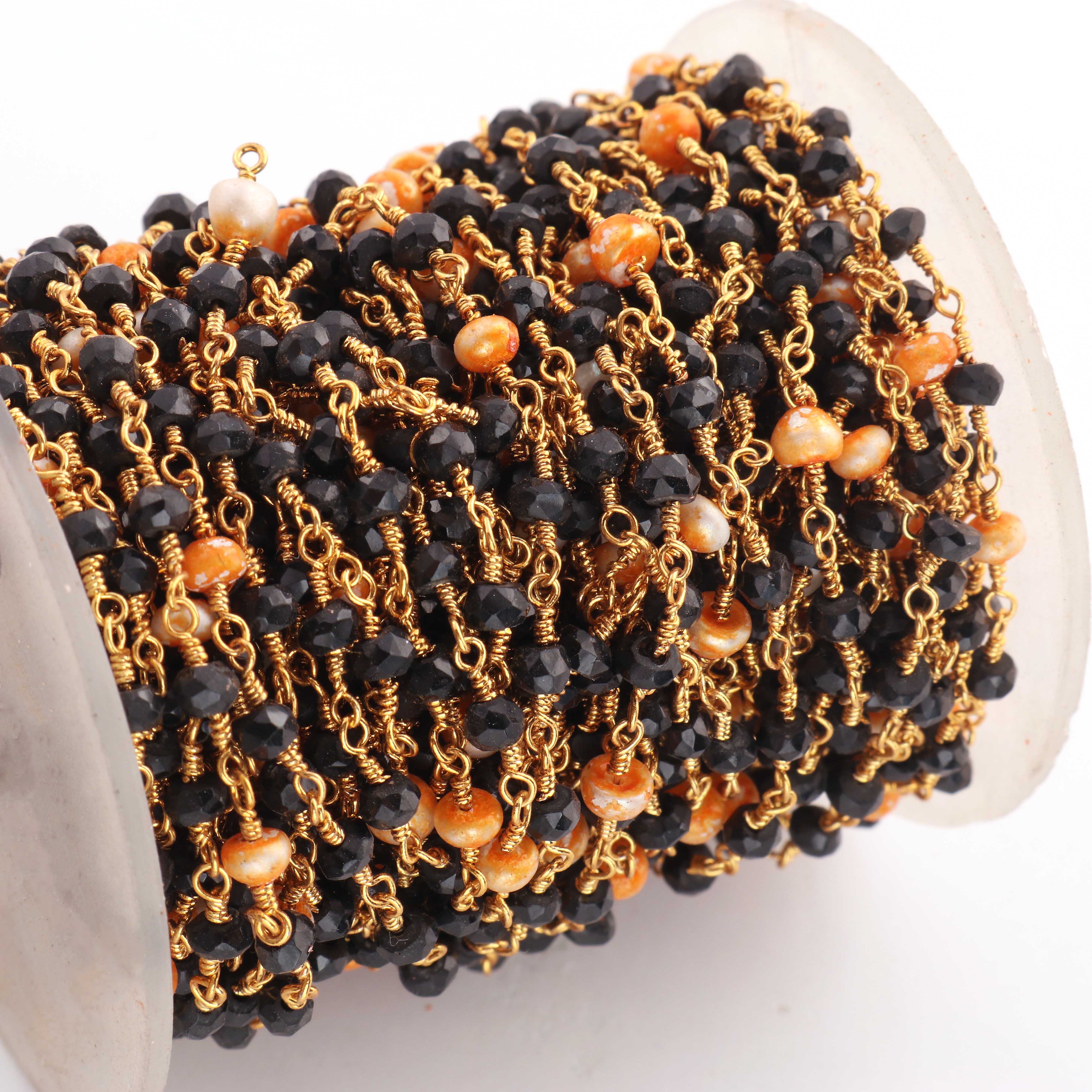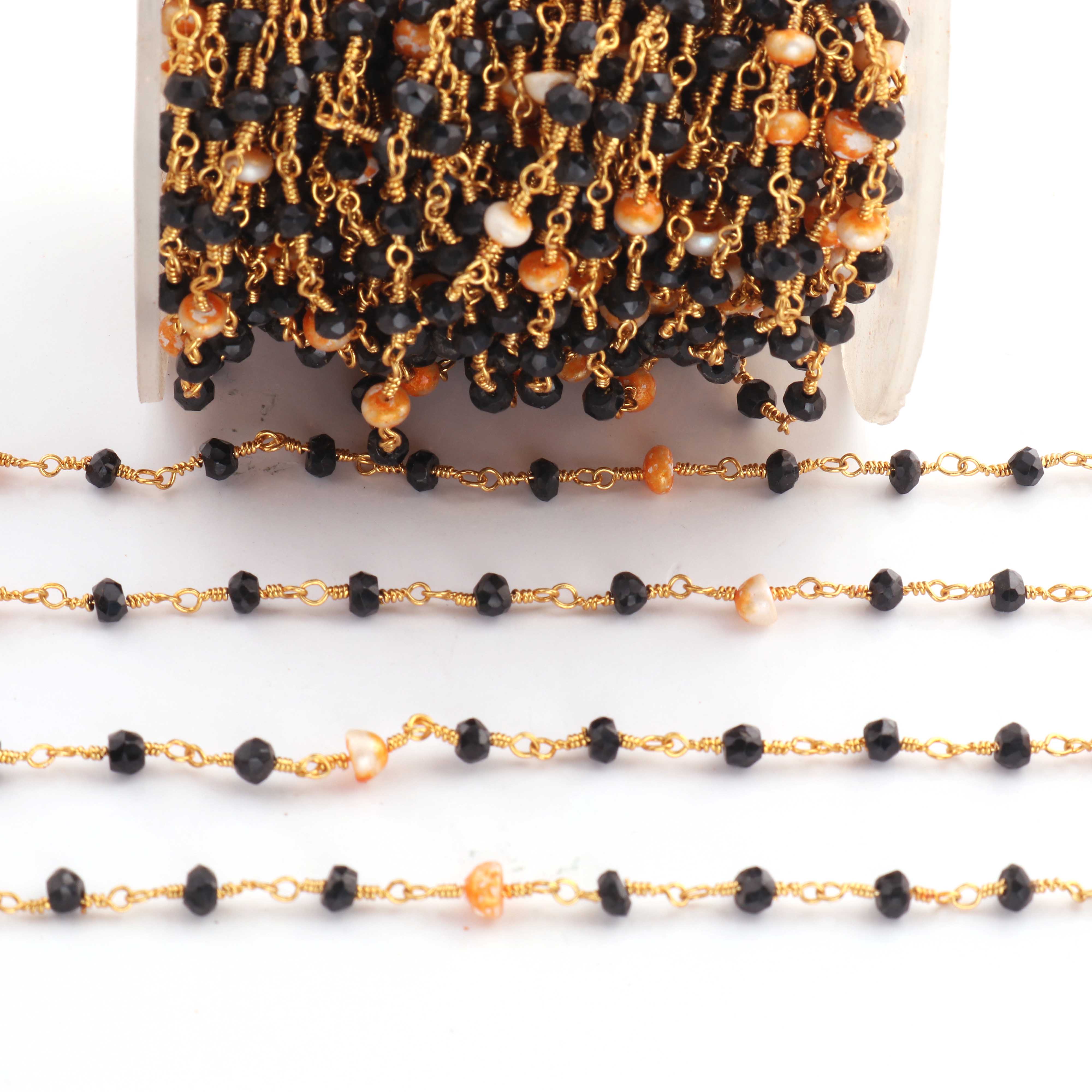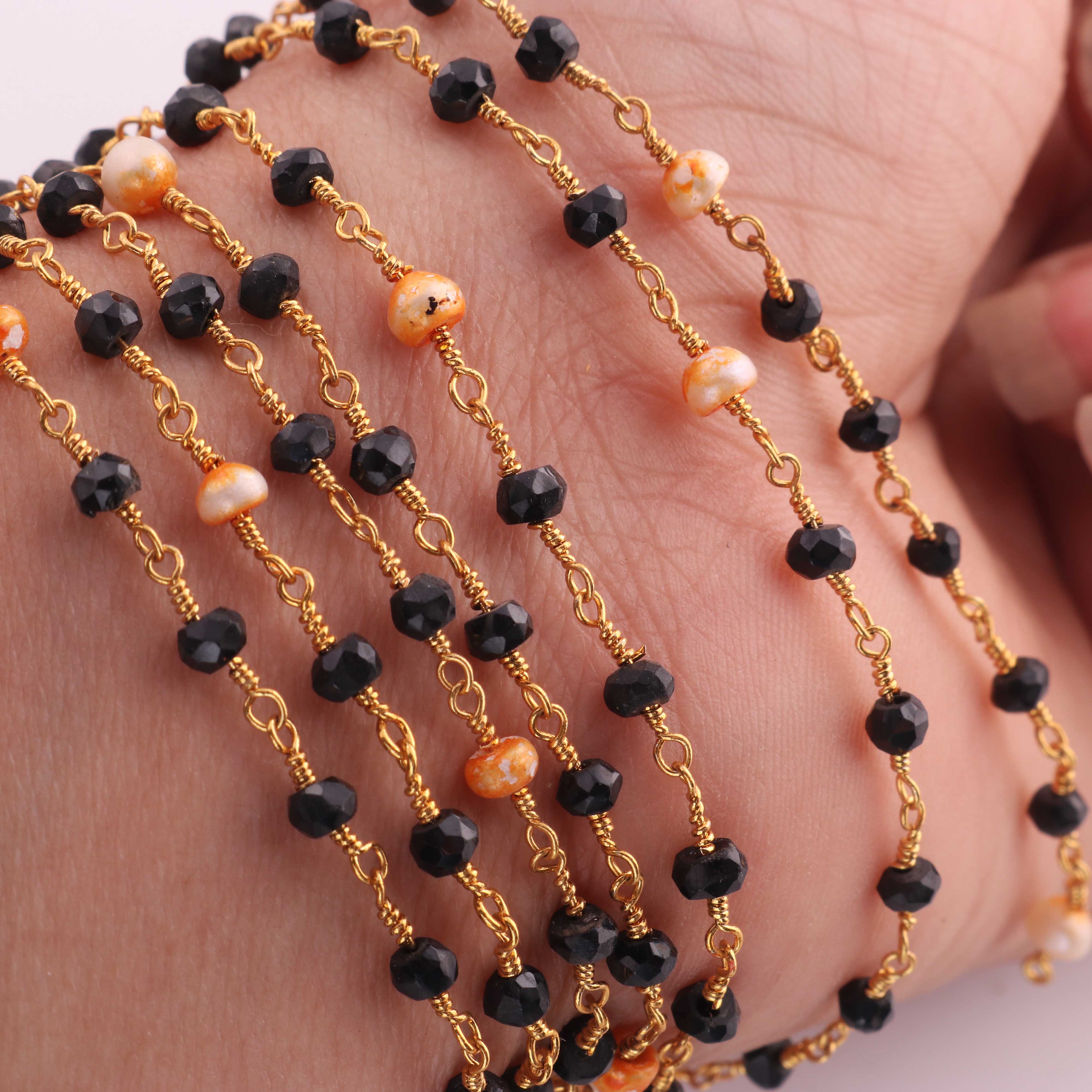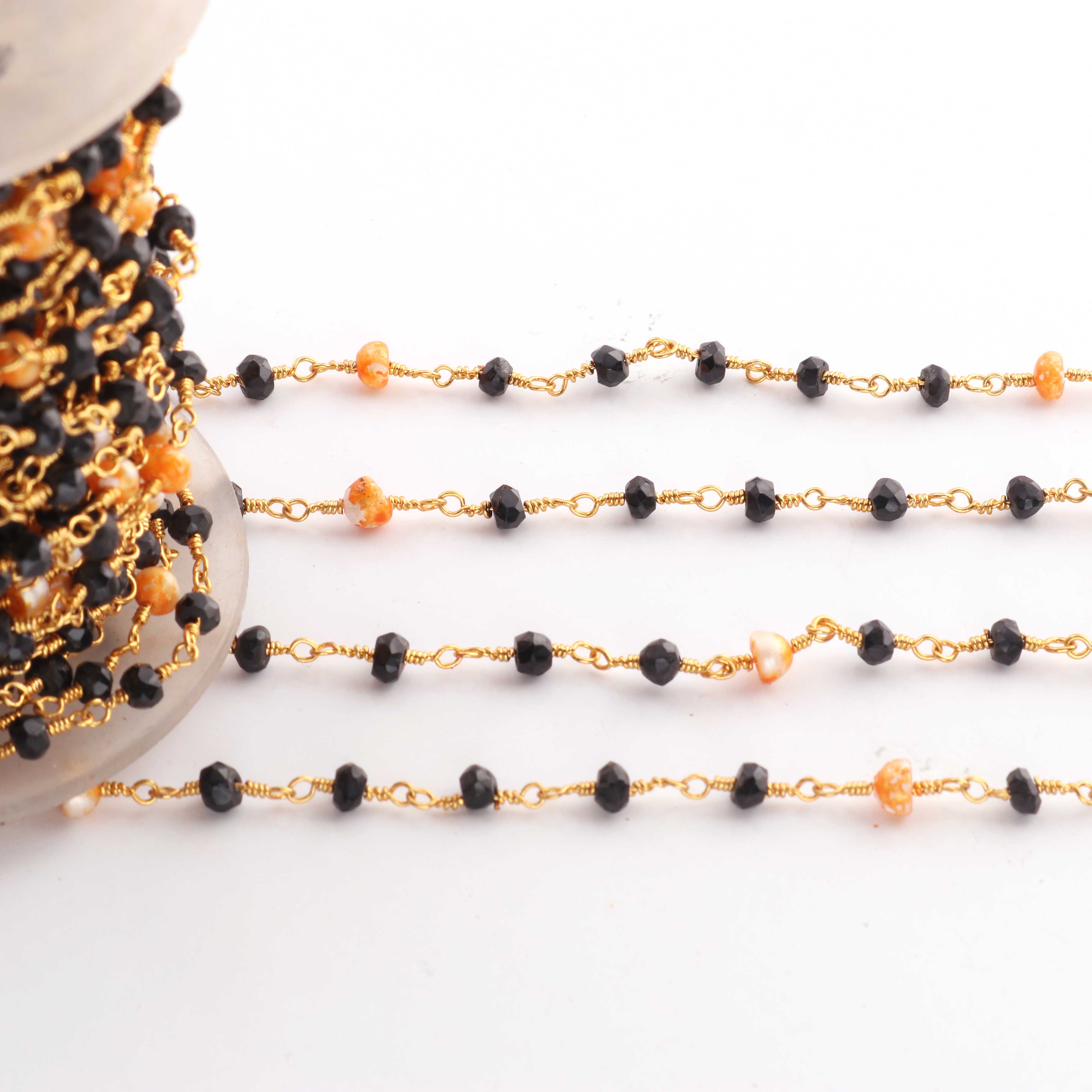 3 Feet Black Spinel with Pearl 3mm-4mm Faceted Rosary Beaded chain- 24 K Gold Plated Wire Wrapped Chain NSC0010