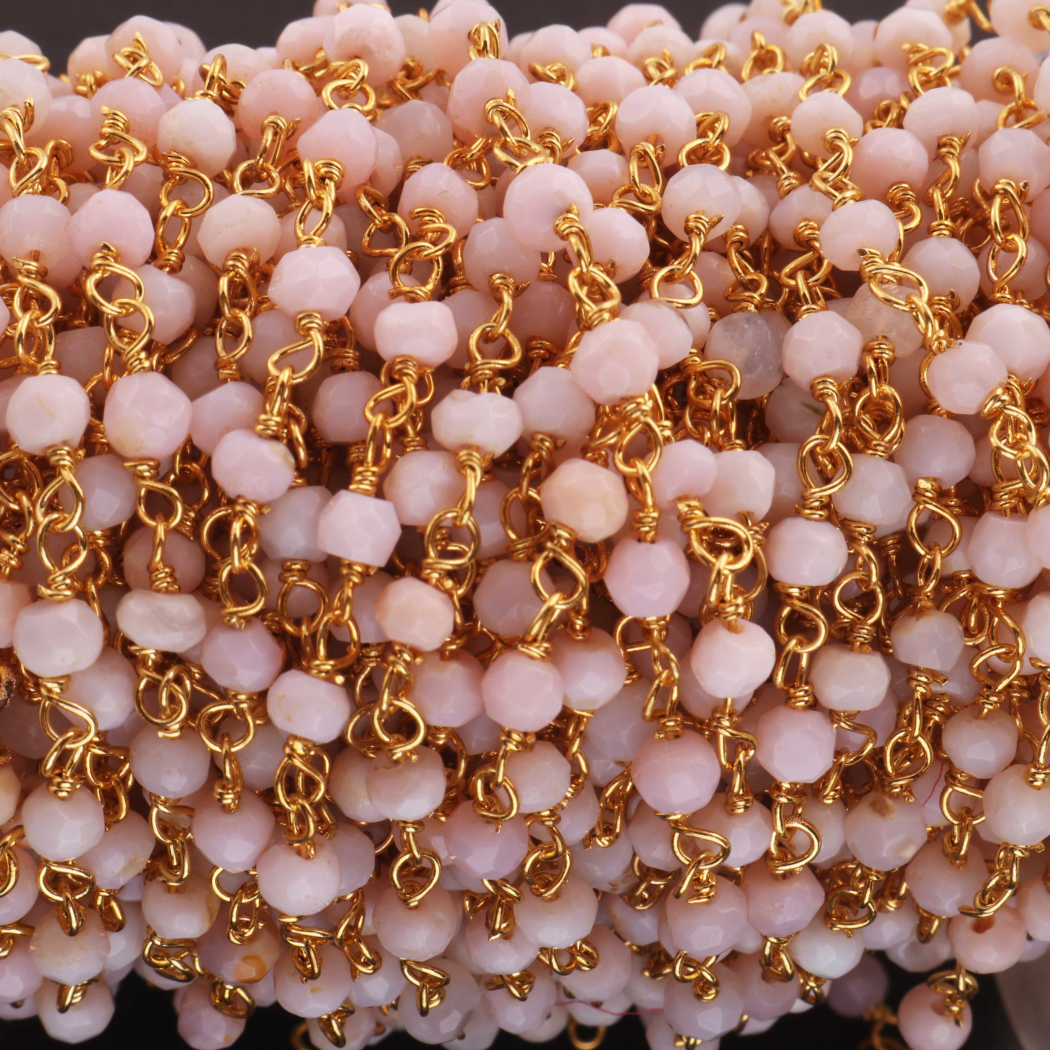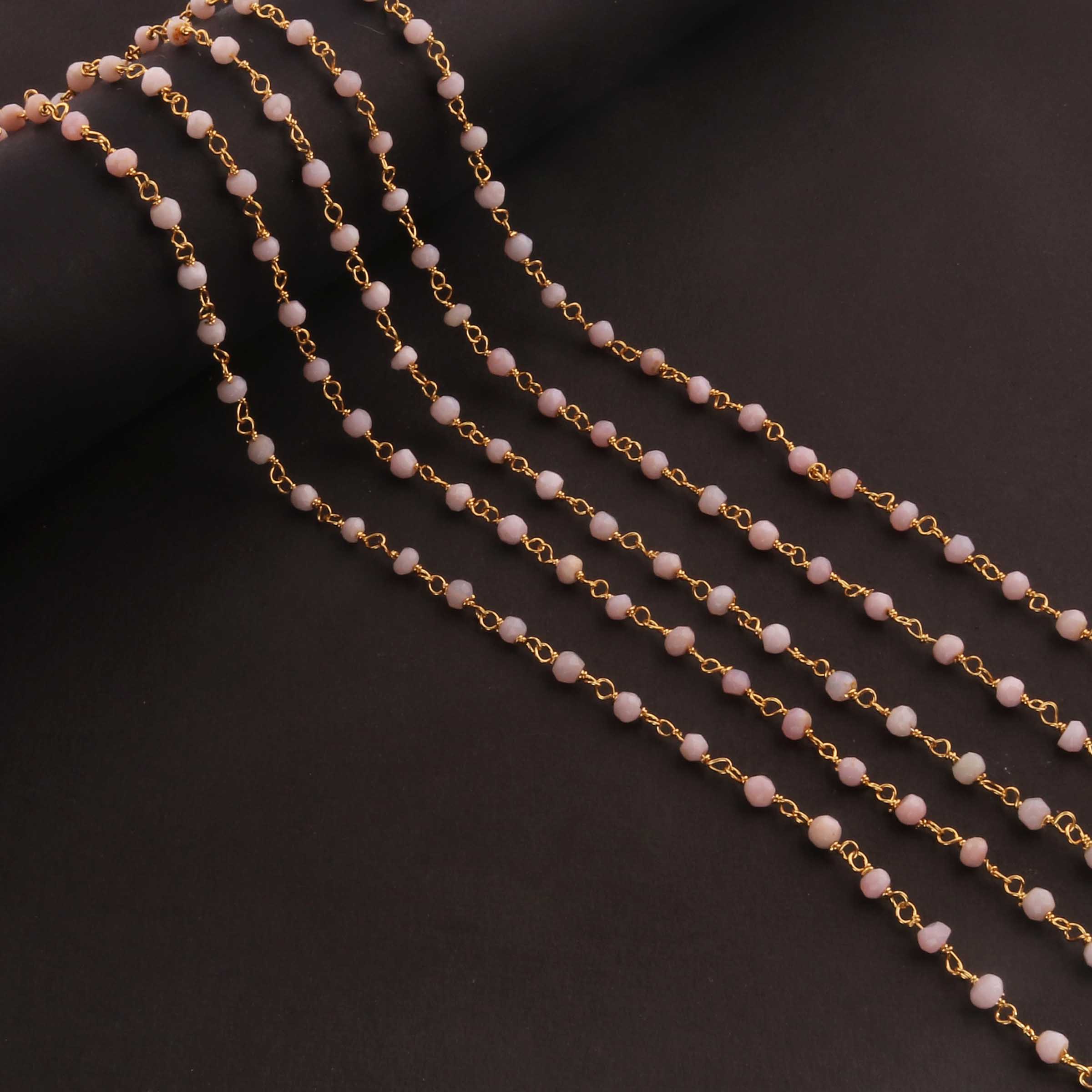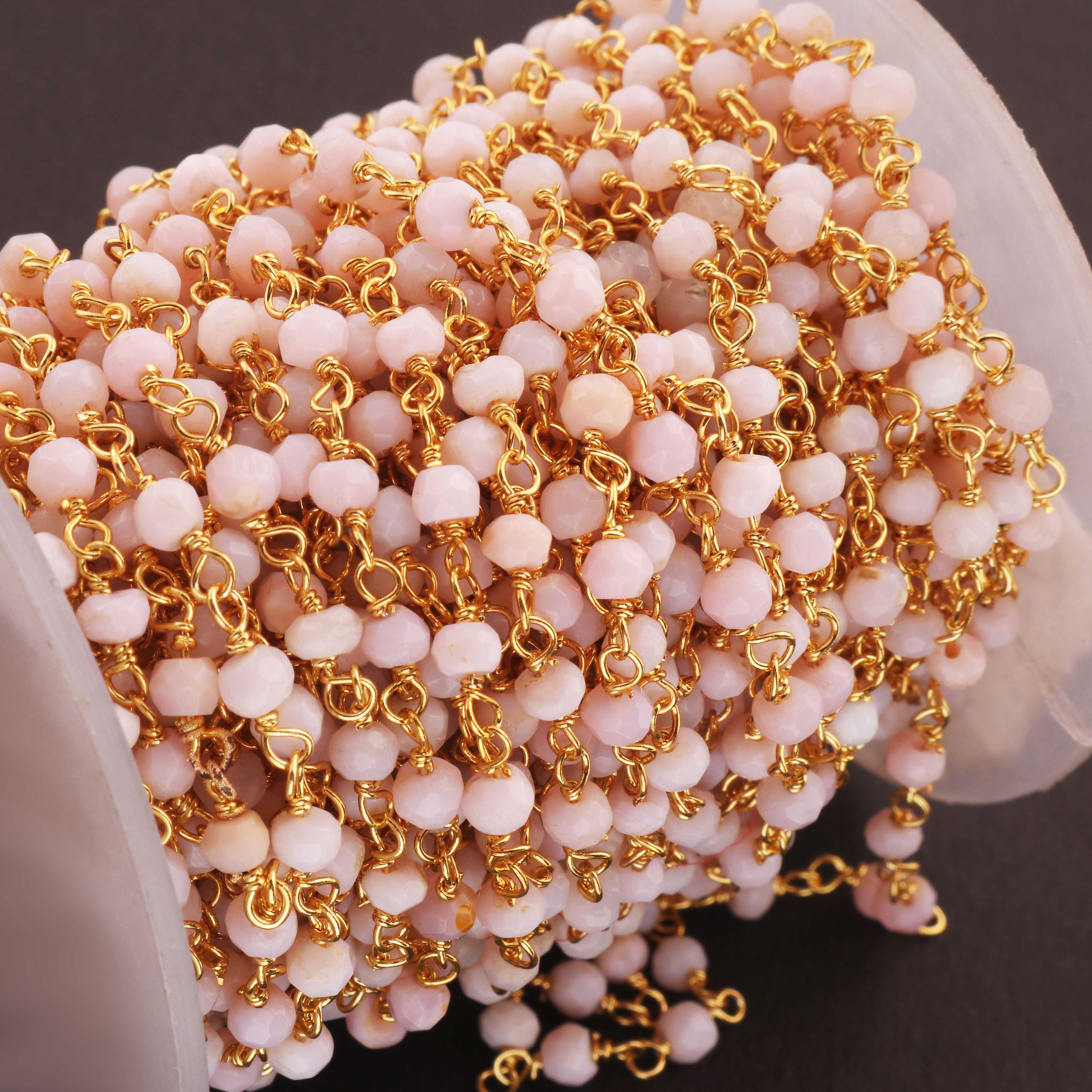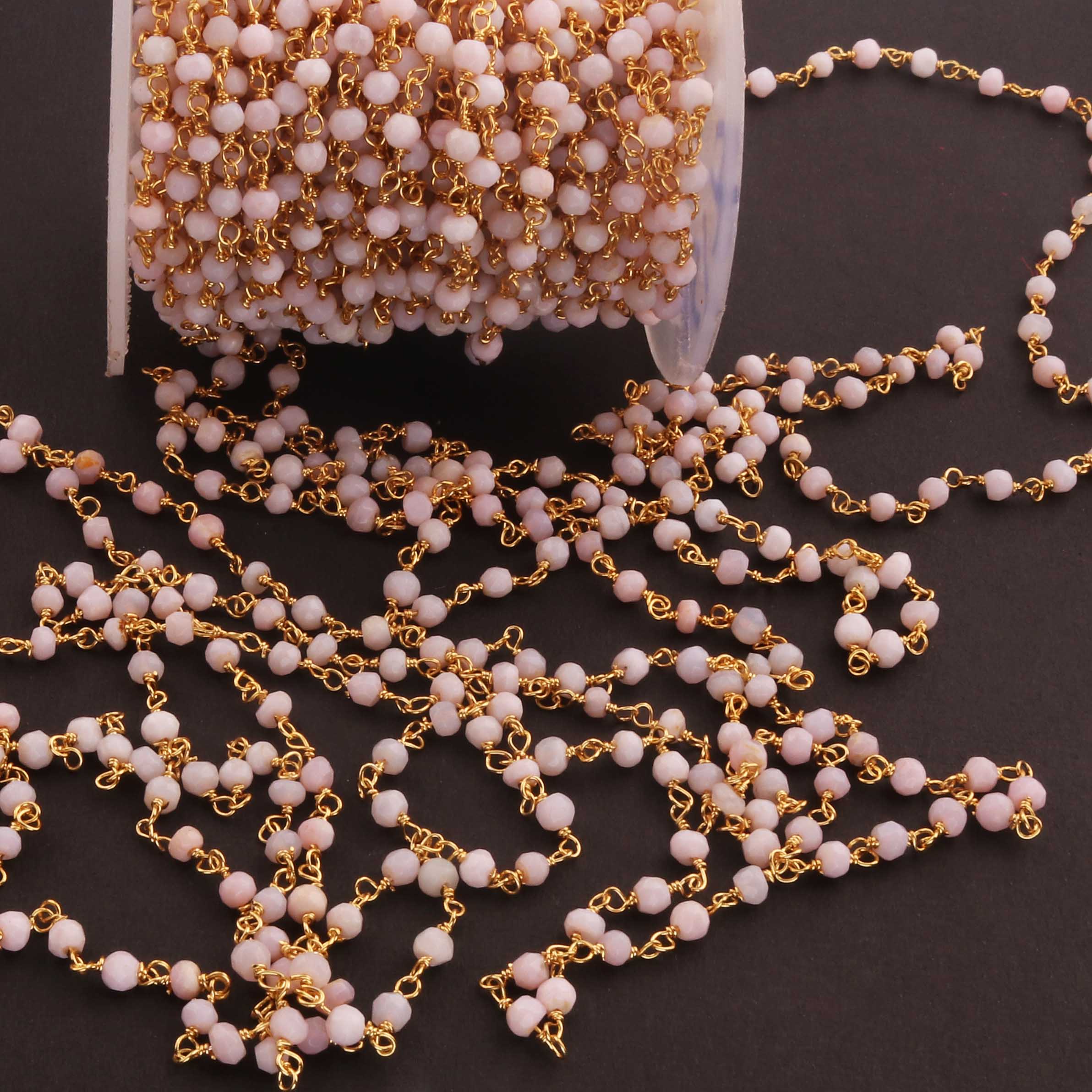 5 Feet Pink Opal Rosary Style Beaded Chain 3 mm-3.5mm Opal Beads Wire Wrapped 24K Gold Plated Chain BDG136