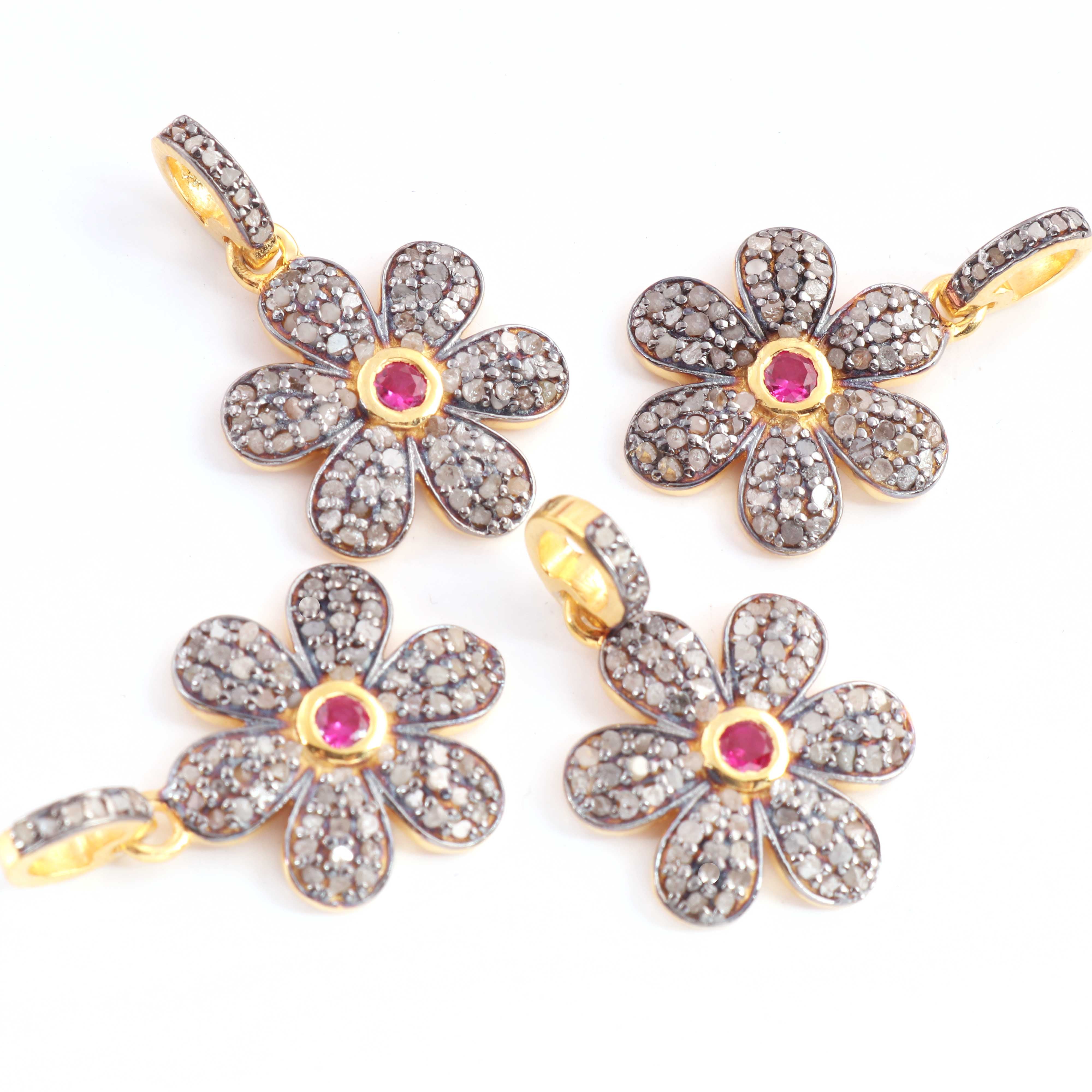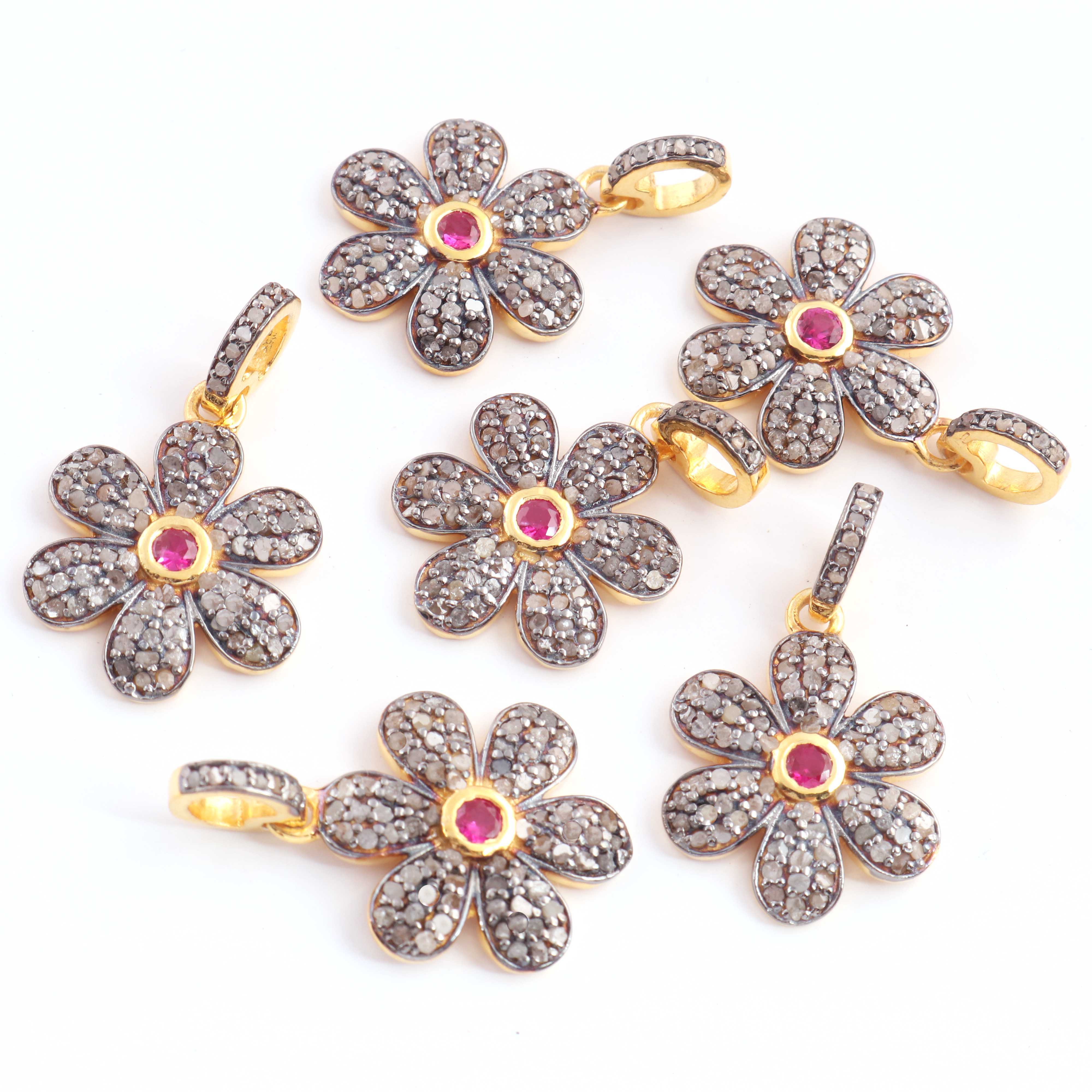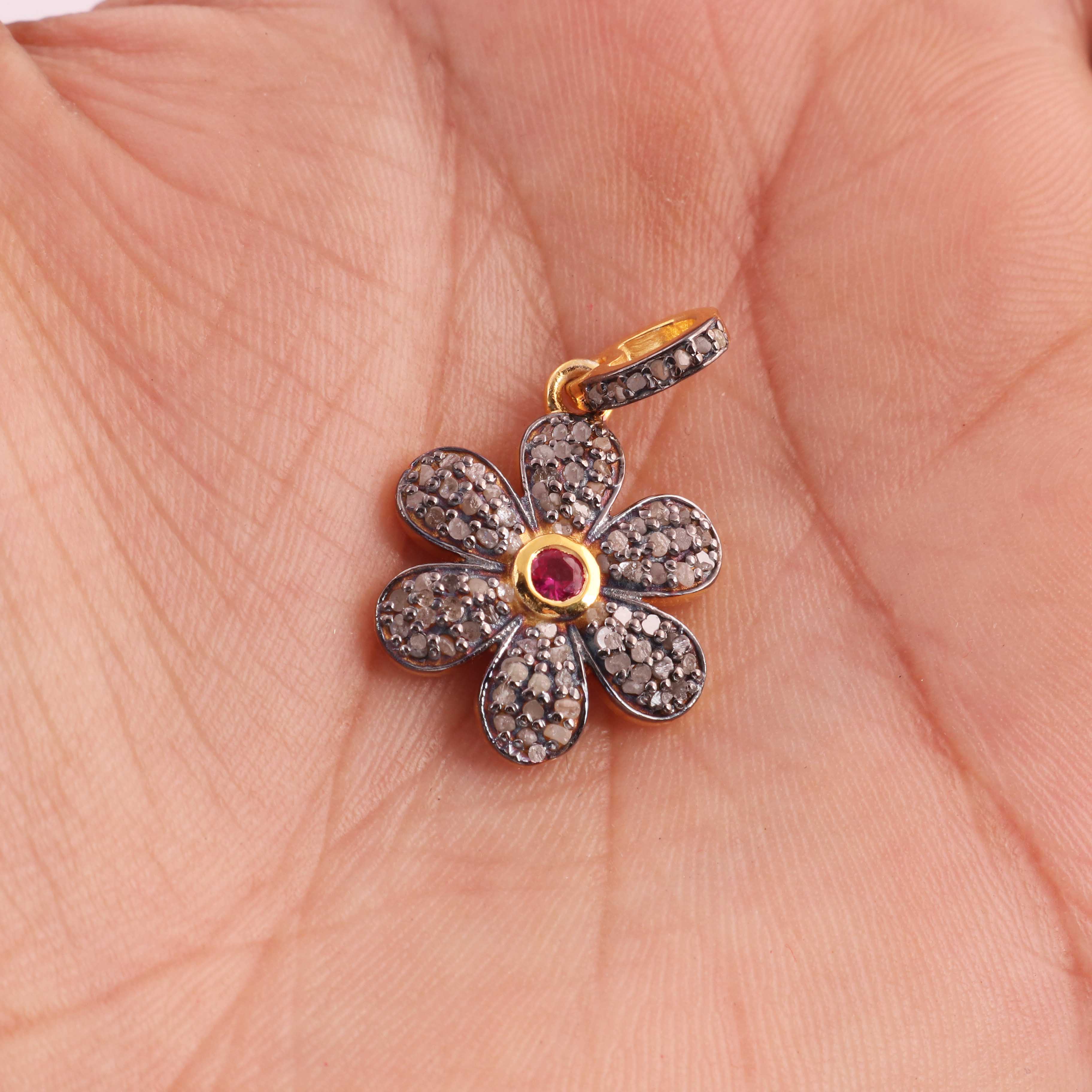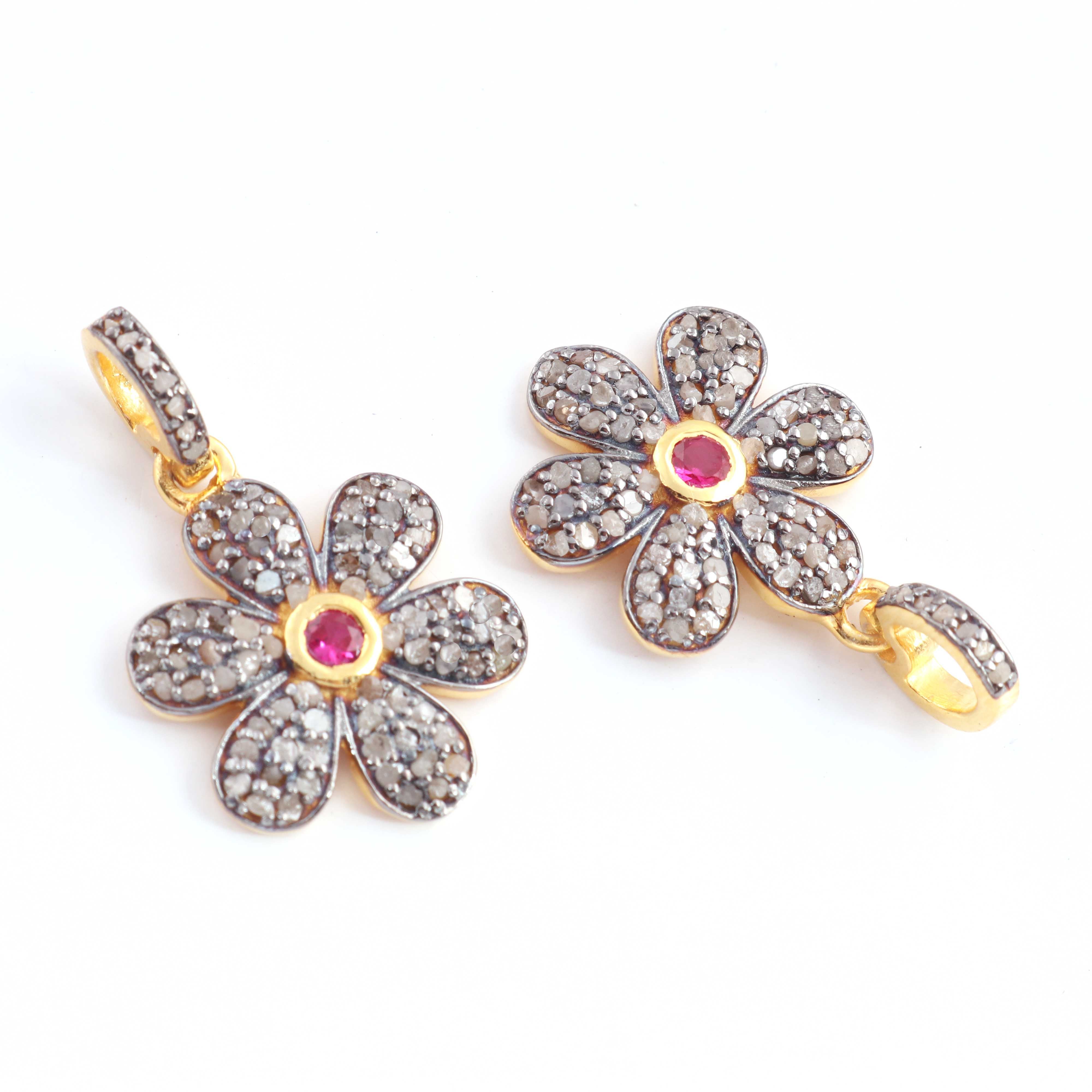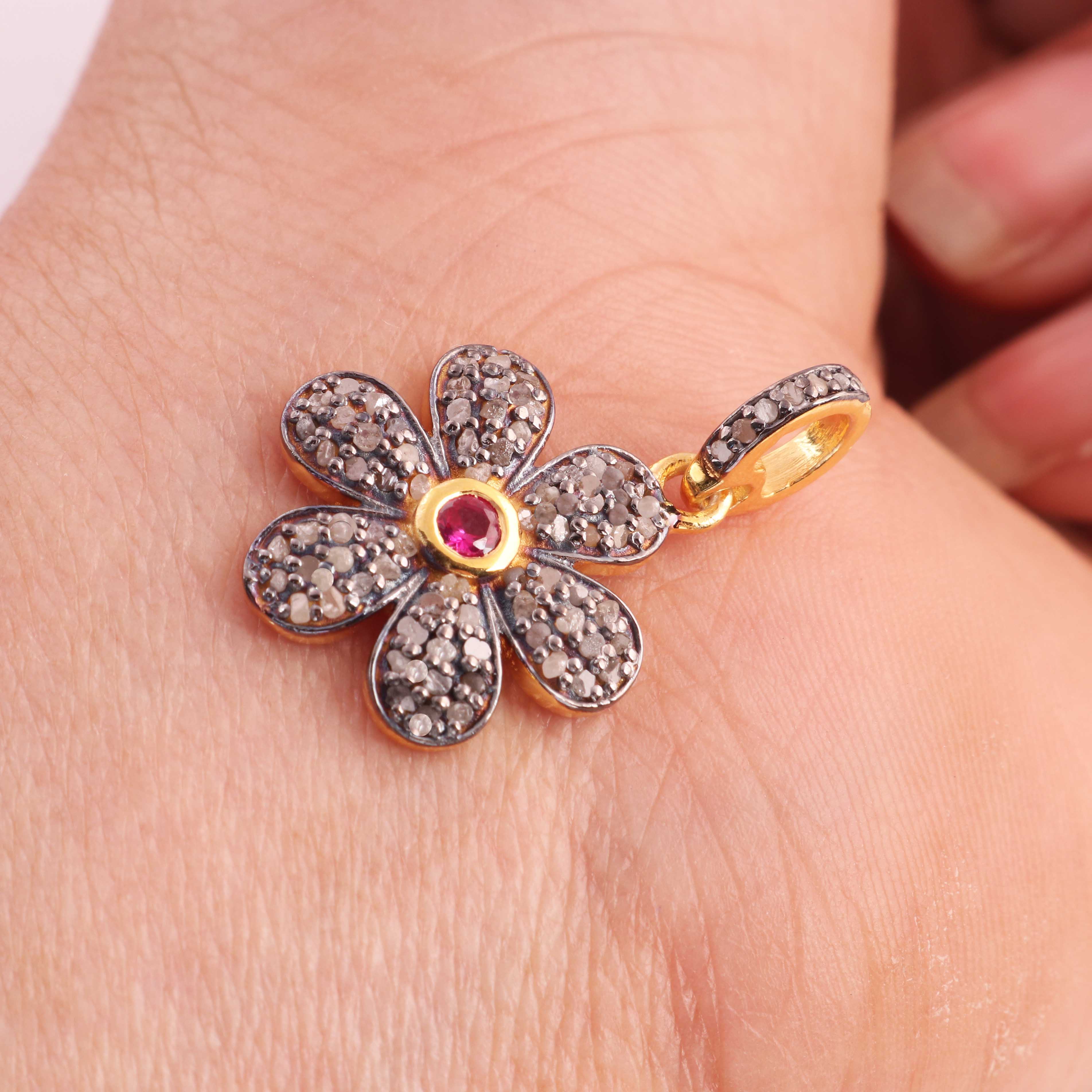 1 Pc Pave Diamond Flower, Center with Pink Hydro Stone Charm Pendant, 925 Sterling Vermeil Flower Pendant Pave Diamond Jewelry 21mmx18mm PDC000450
