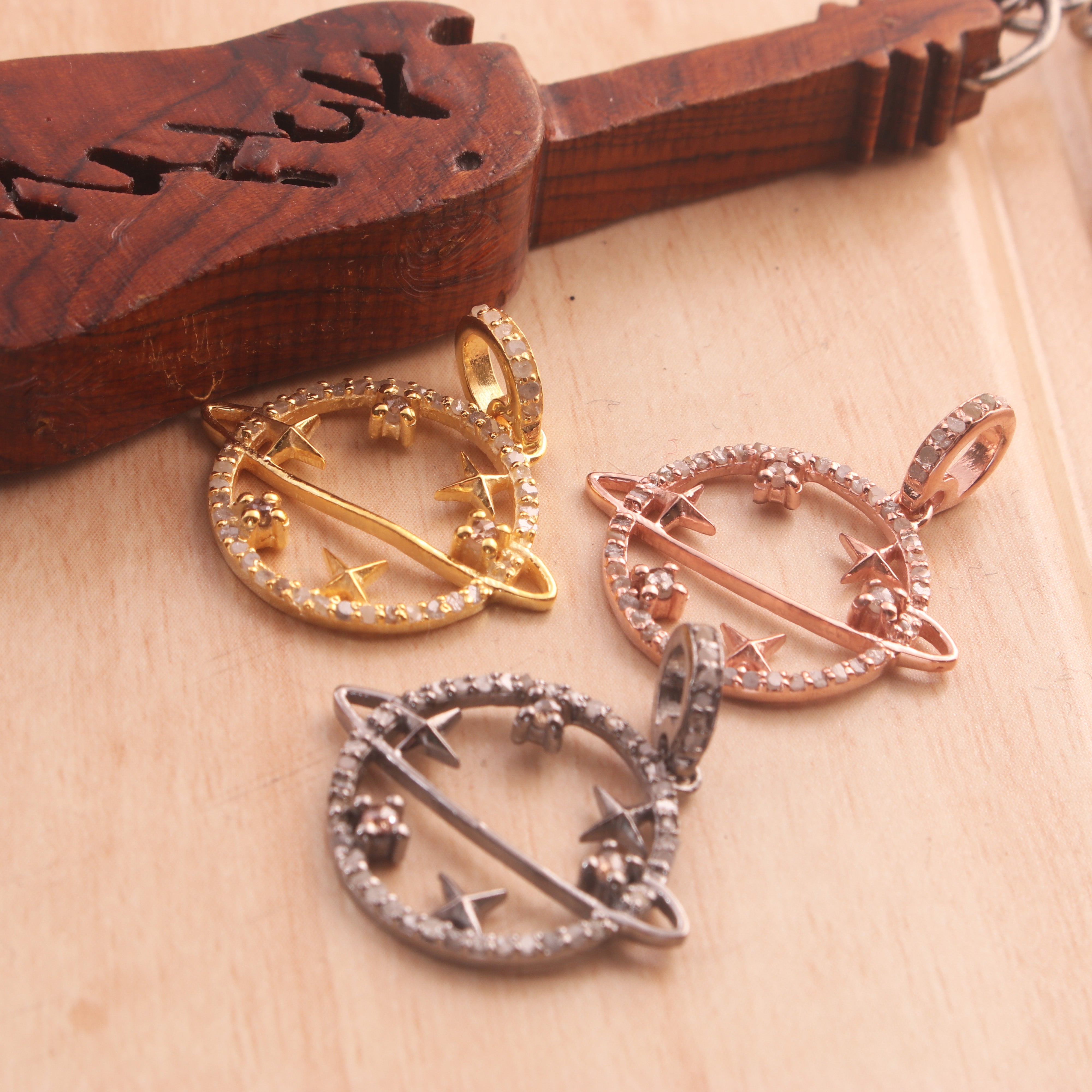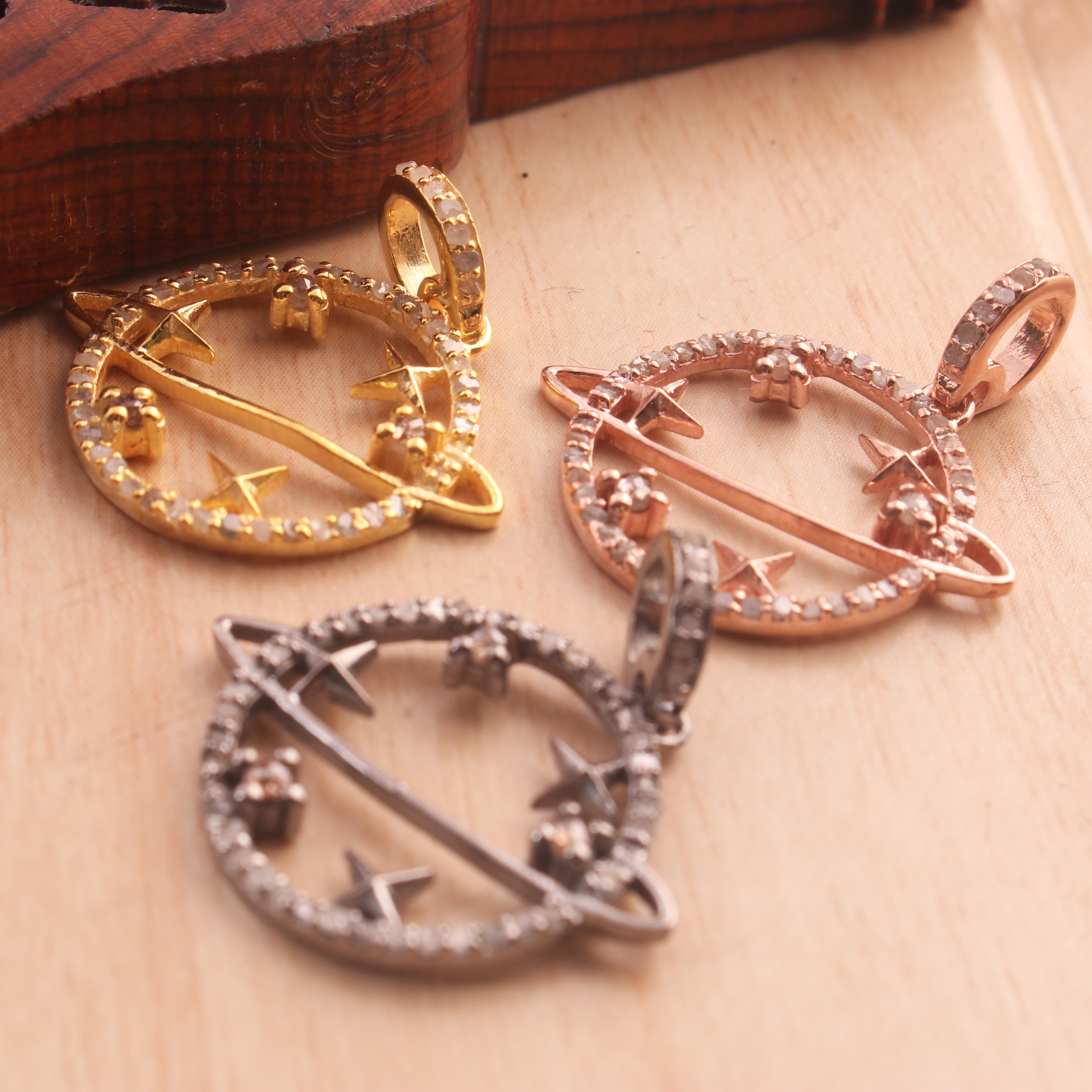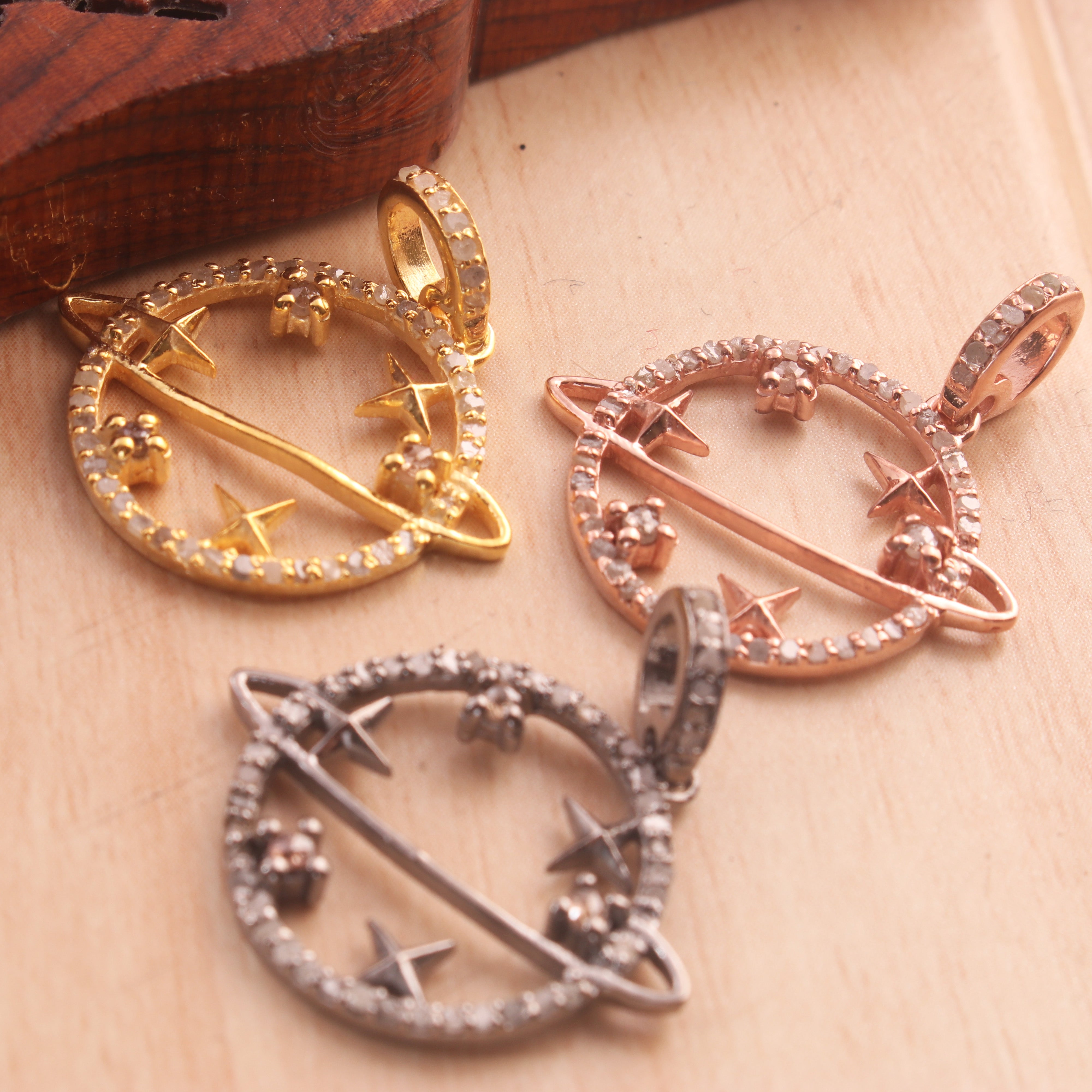 1 Pc Pave Diamond Open Star Saturn Pendant - 925 Sterling Silver, Yellow & Rose Gold Vermeil - Diamond Pendant 21mmx24mm PD1855