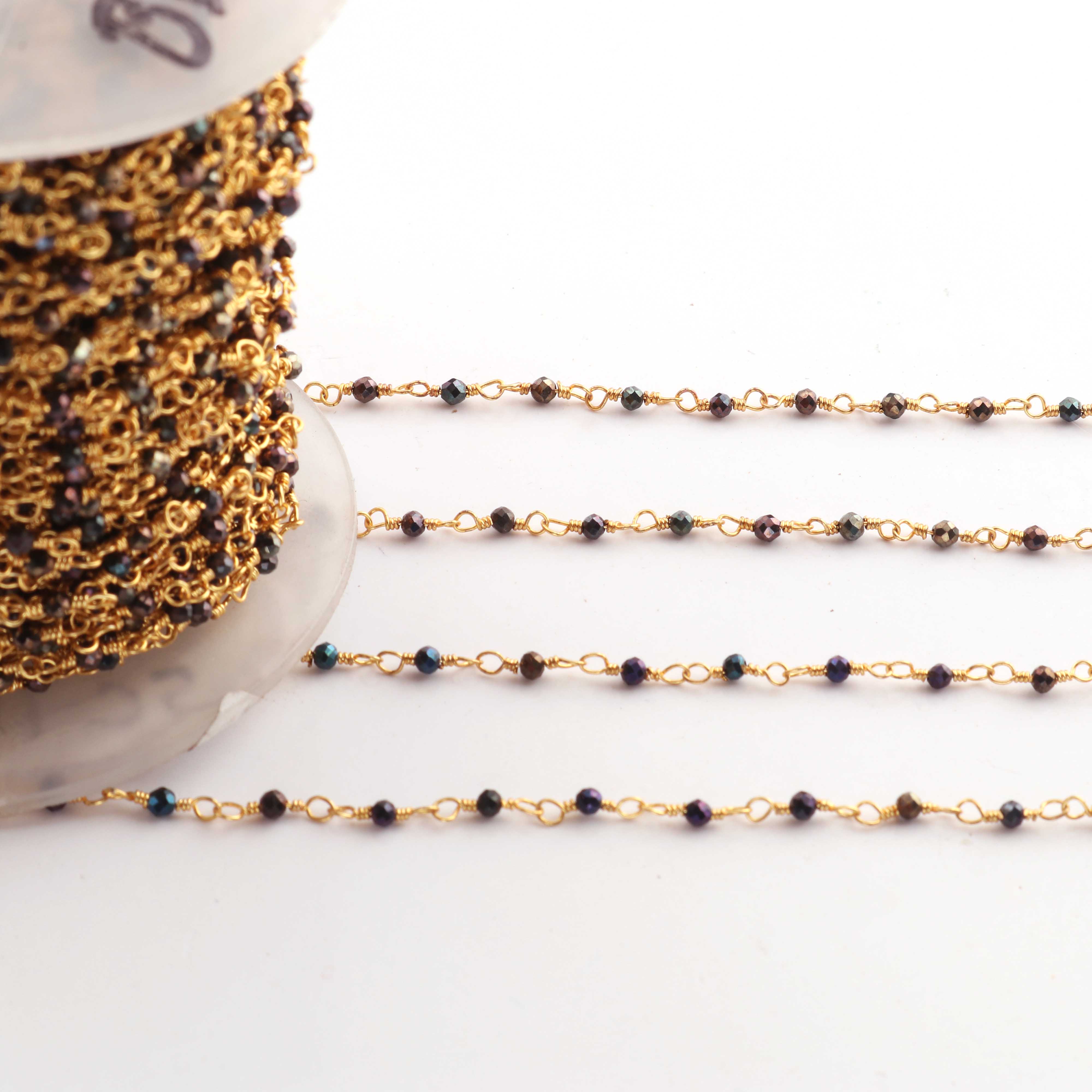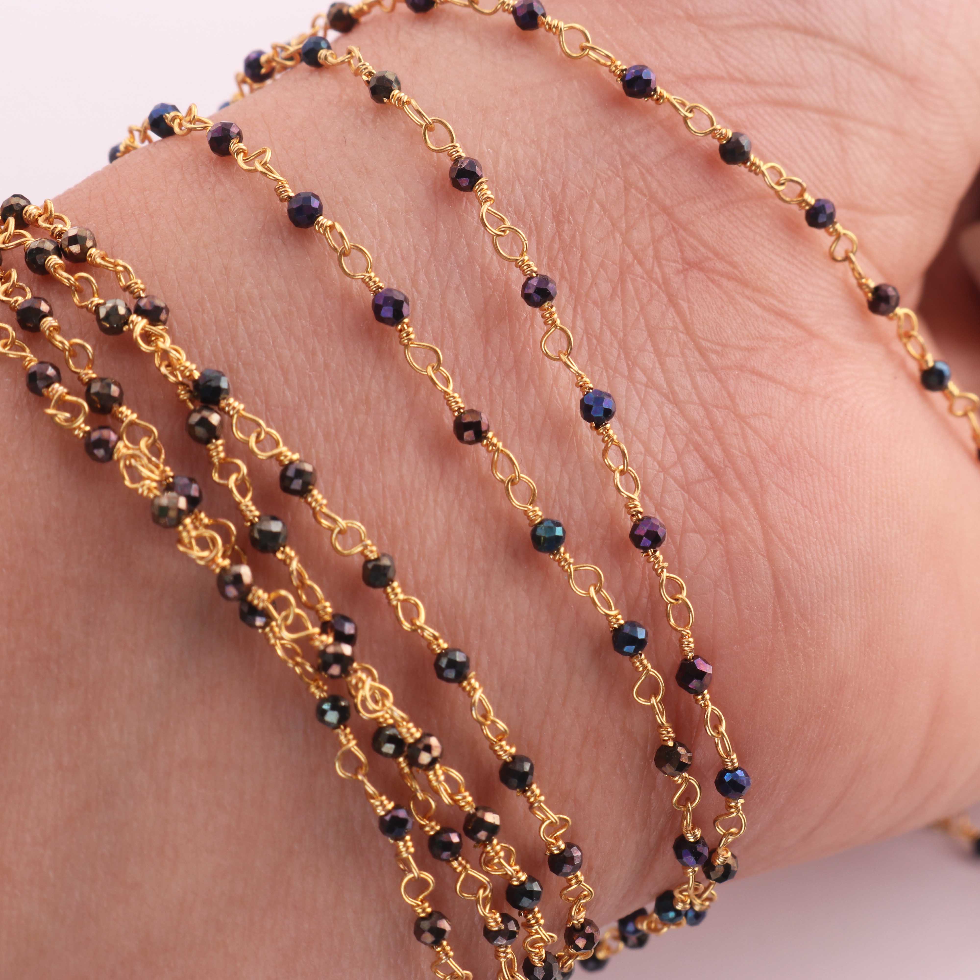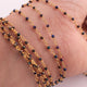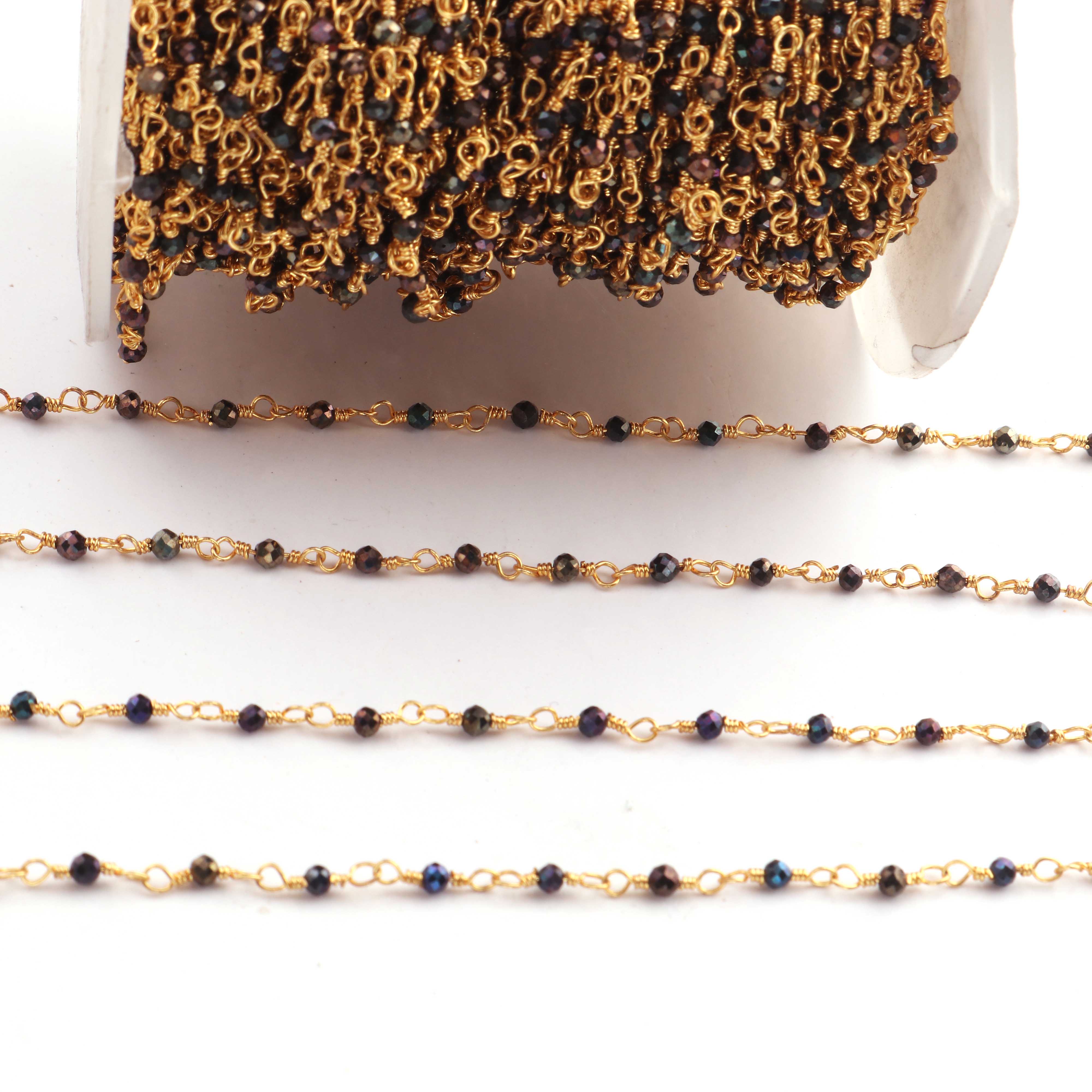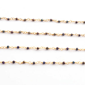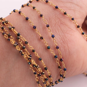 • 3 Feet Black Spinel Blue Coated Beads  2 mm Faceted Rosary Beaded chain- 24 K Gold Plated Wire Wrapped Chain