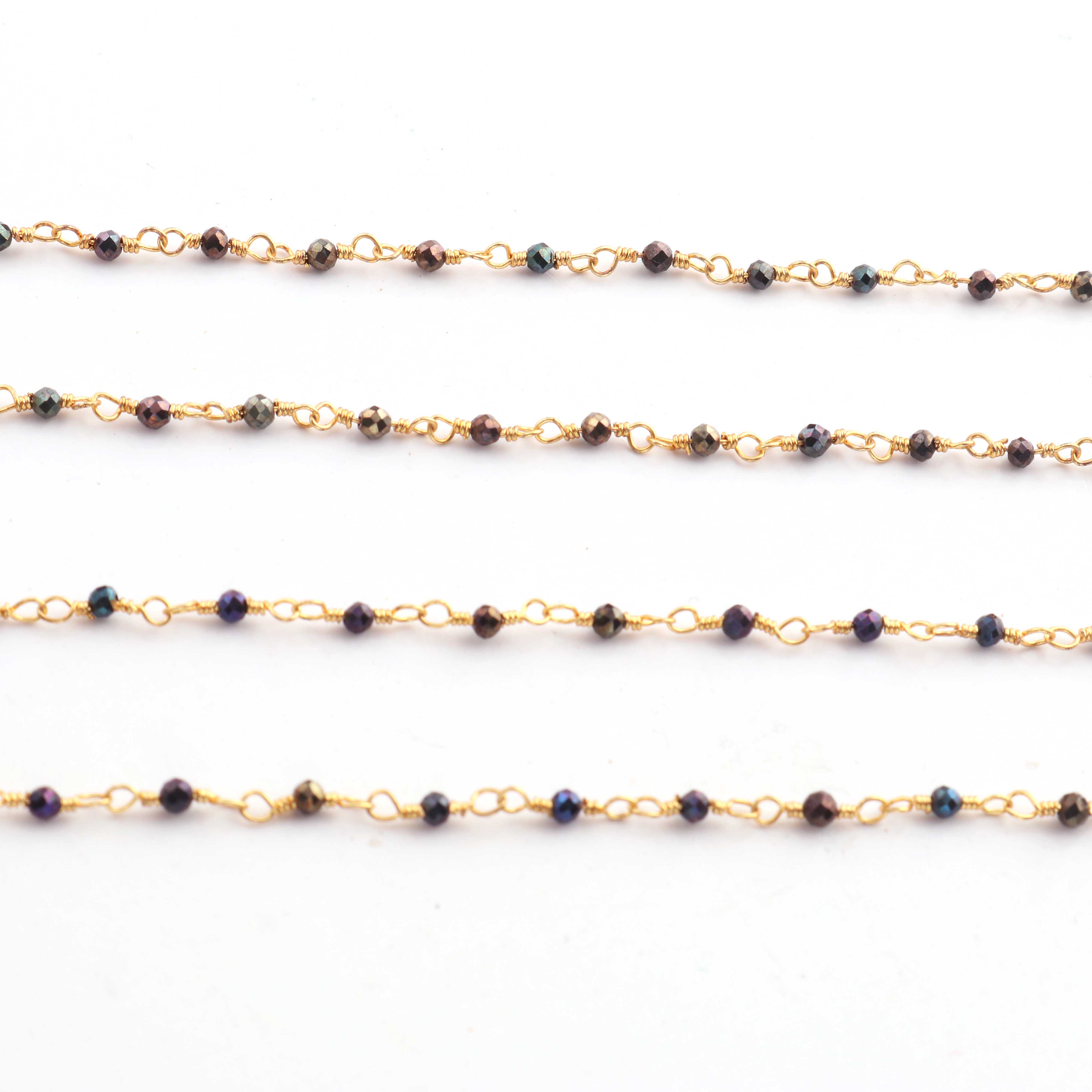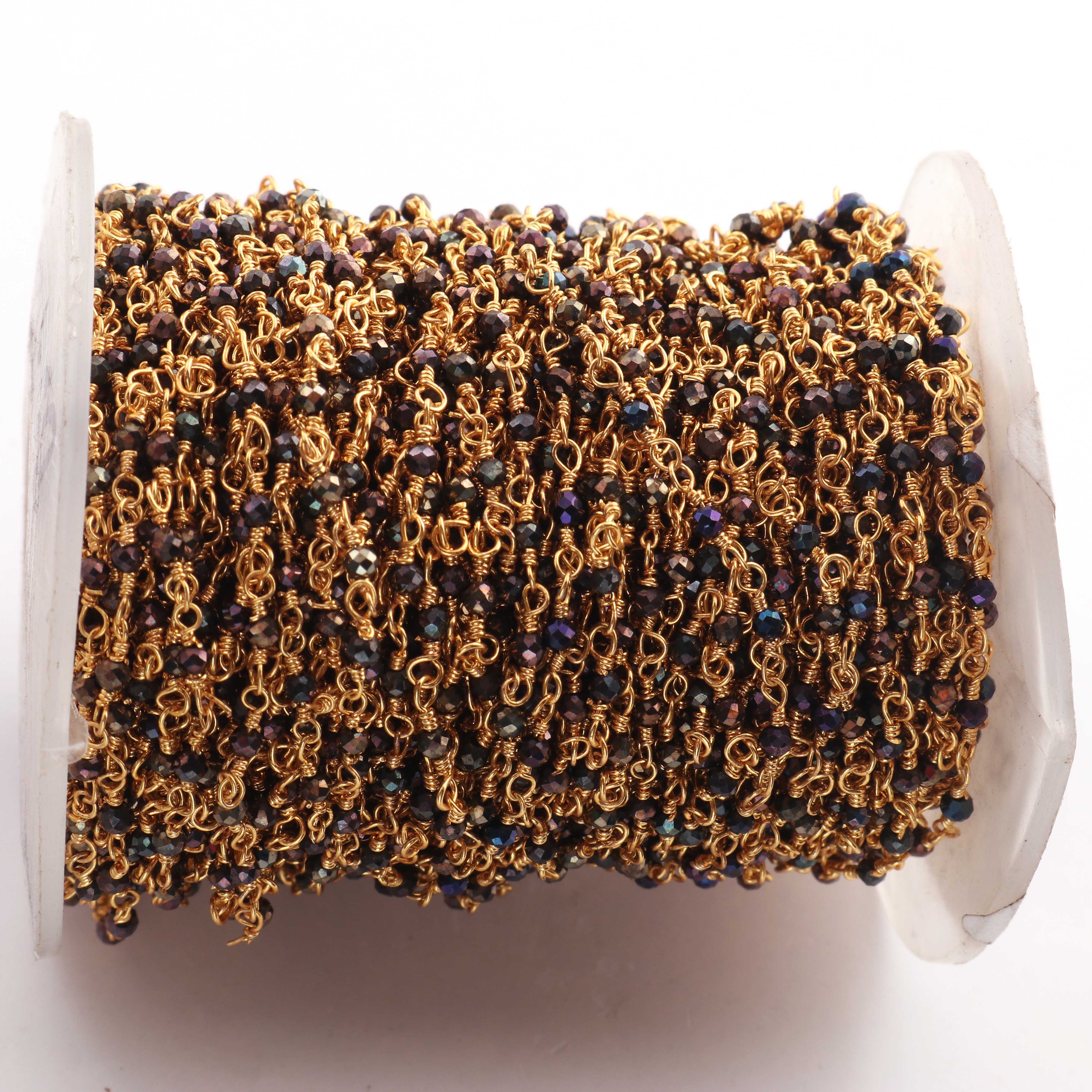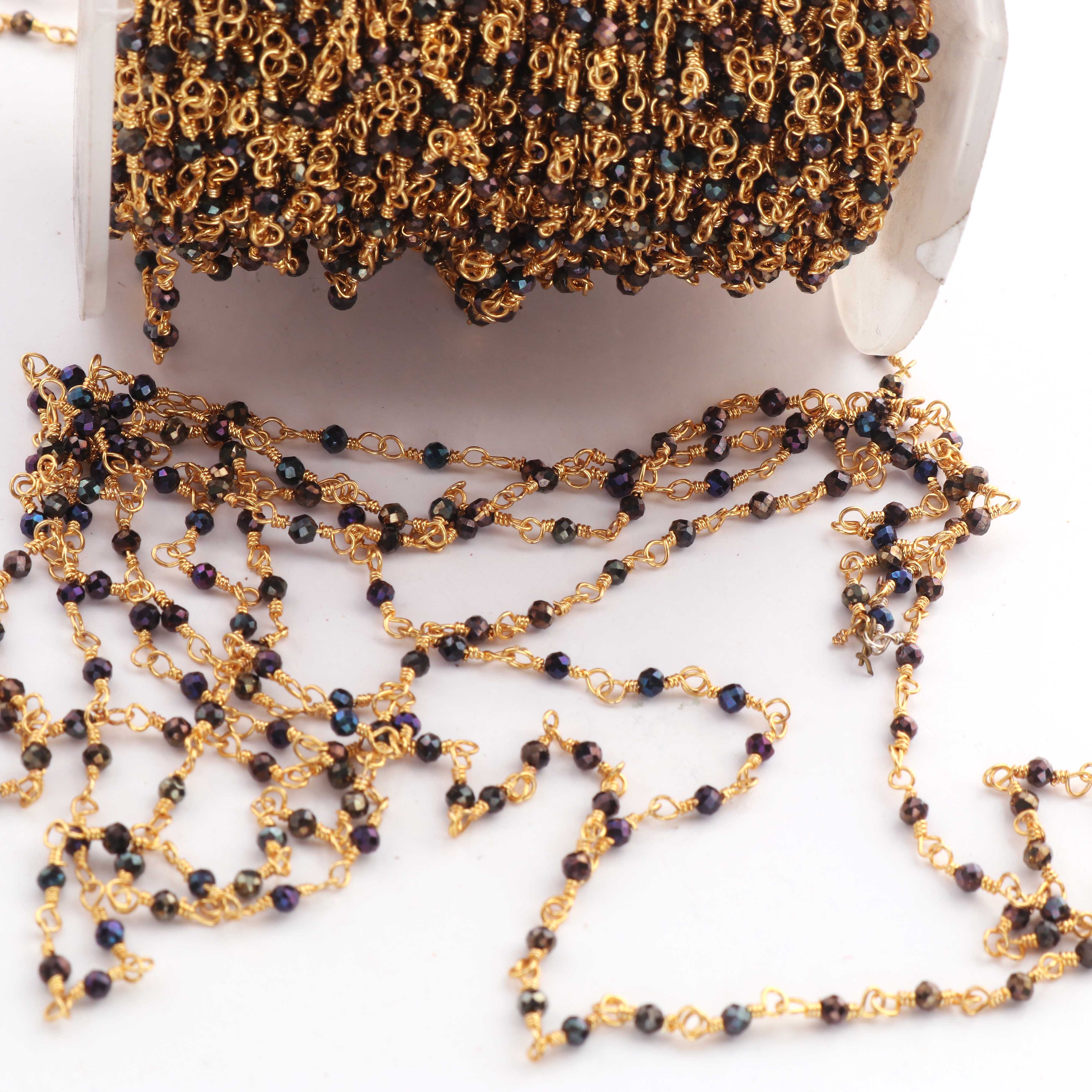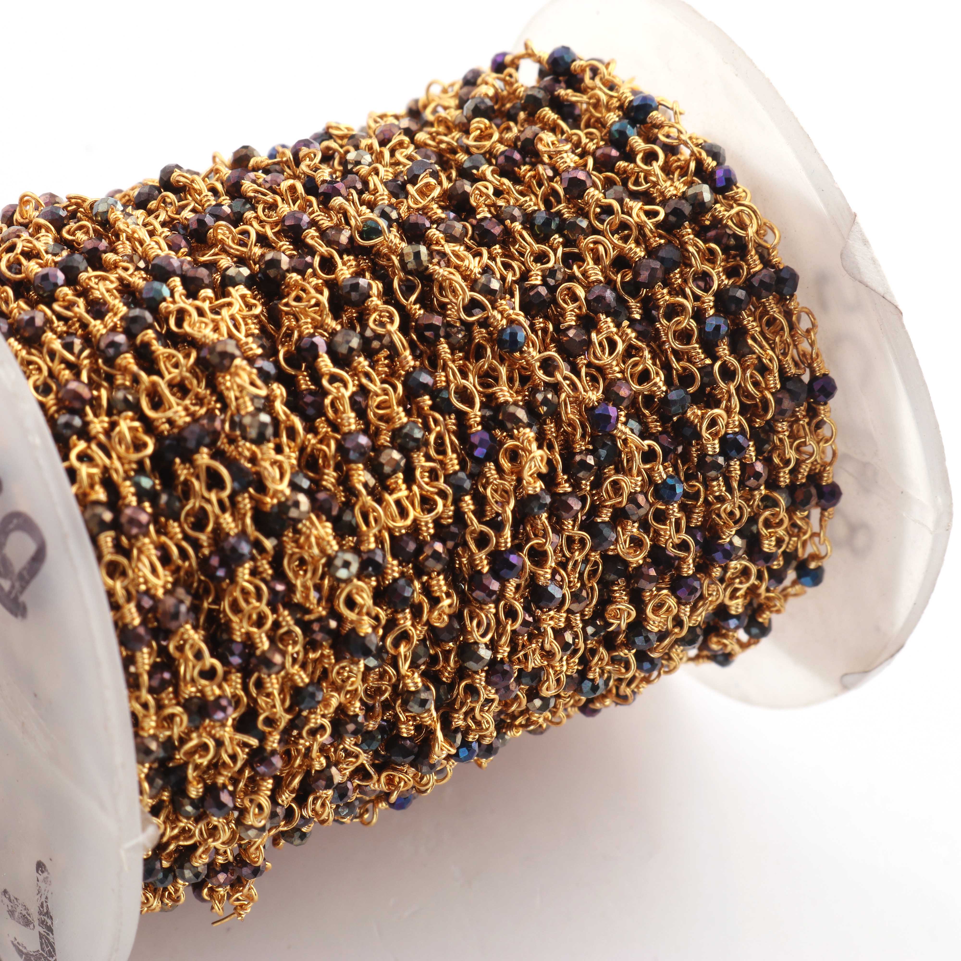 • 3 Feet Black Spinel Blue Coated Beads  2 mm Faceted Rosary Beaded chain- 24 K Gold Plated Wire Wrapped Chain