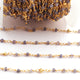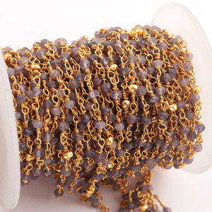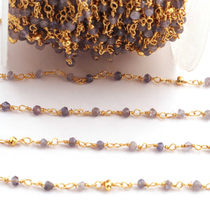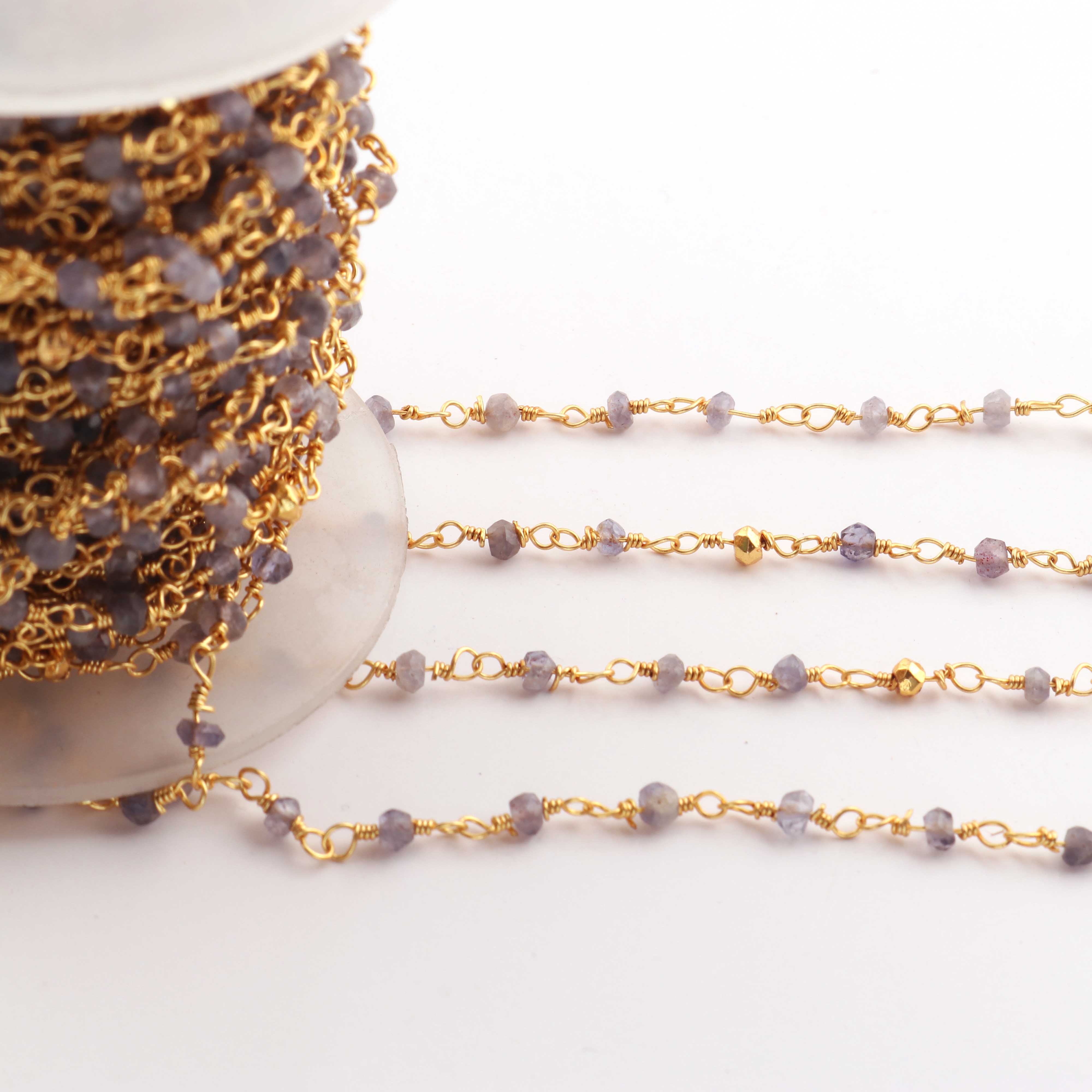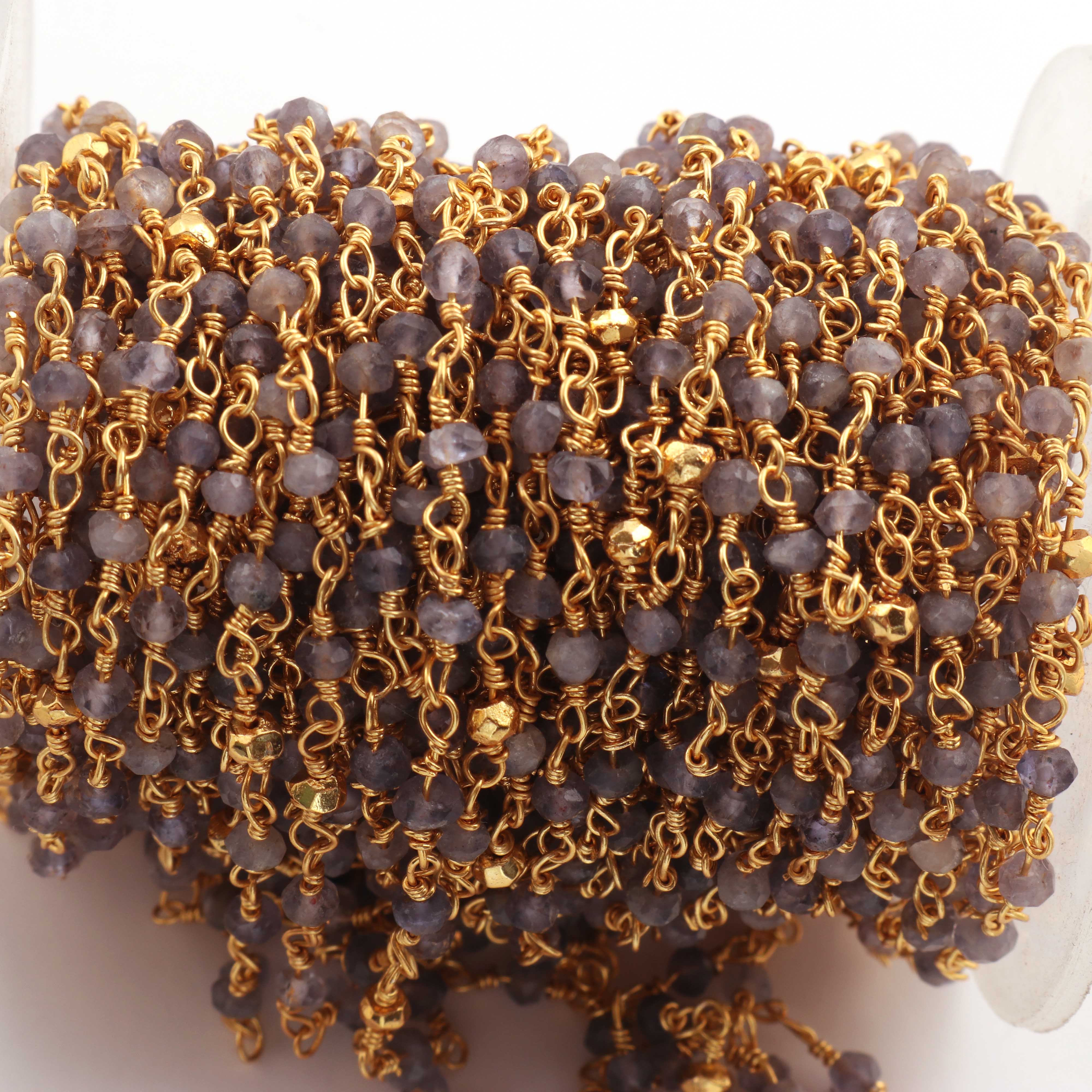 3 Feet Iolite With Gold Pyrite Glass Beads 3 mm Faceted Rosary Beaded chain- 24 K Gold Plated Wire Wrapped Chain