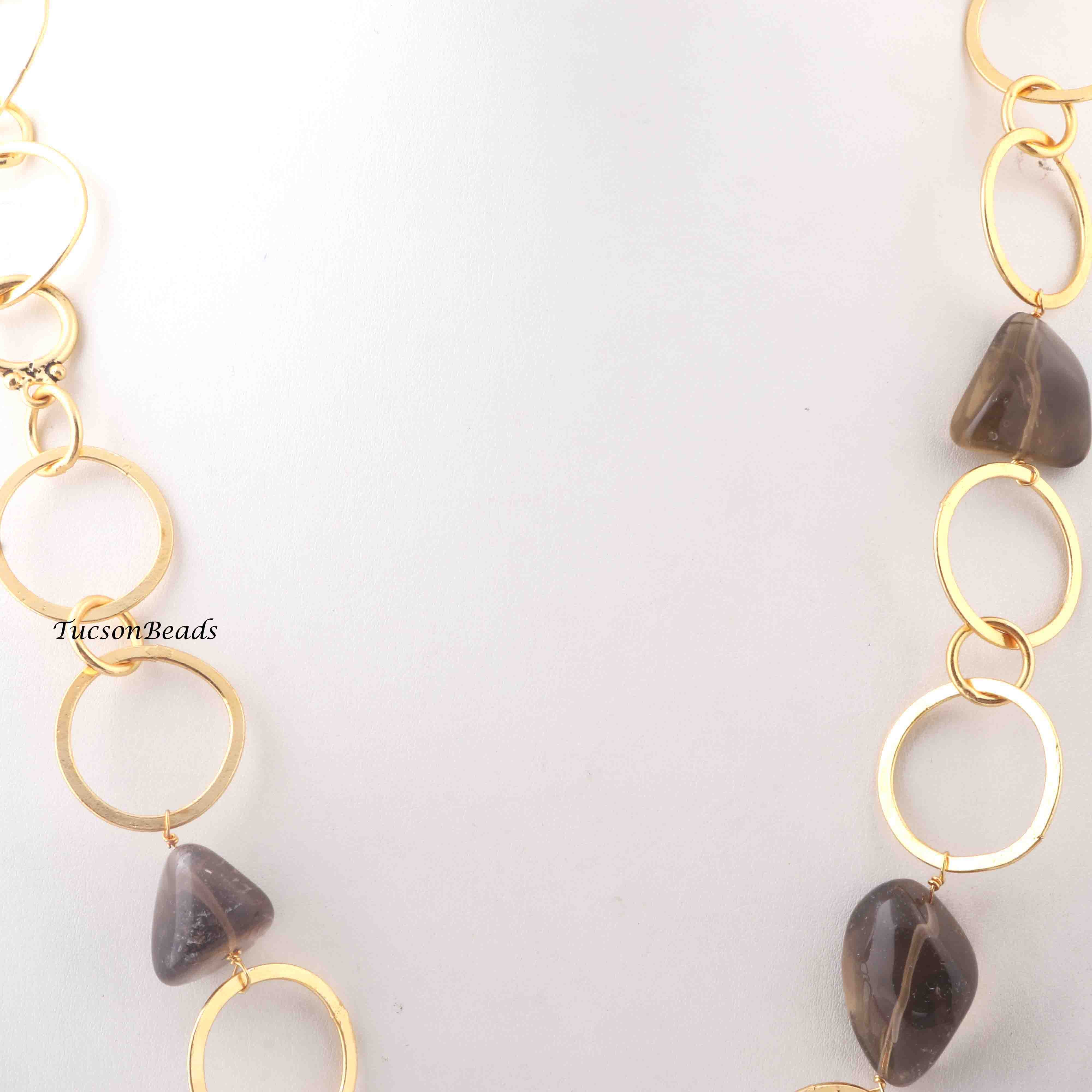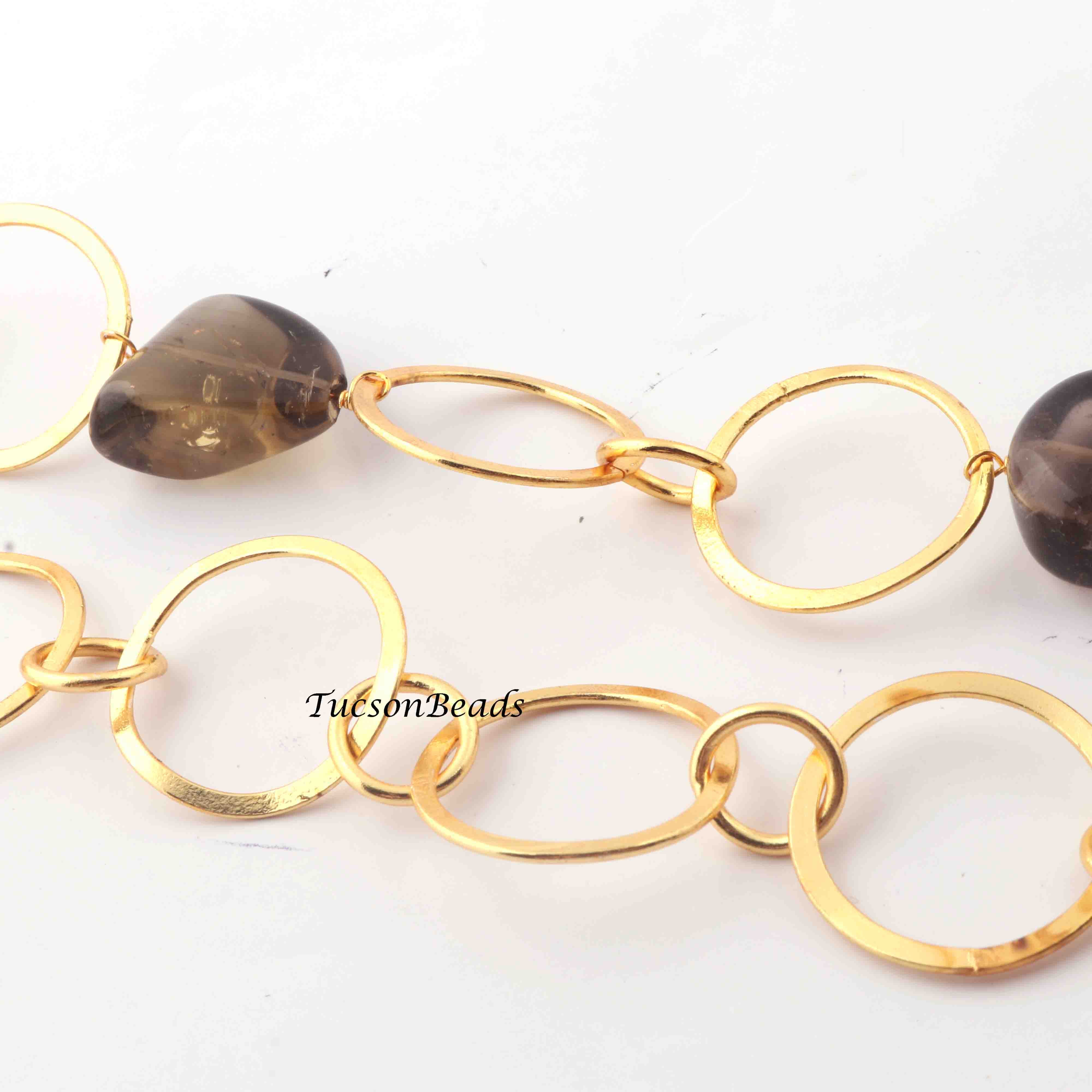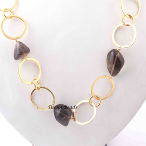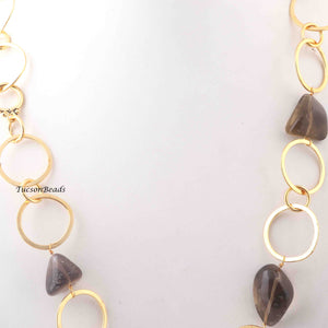 1 Necklace 24 K Gold Plated with Smoky Quartz Gemstone Copper Link Chain, Round Ring Chain, -19mmx18mm-26mmx16mm- 26 Inches, GPC1227