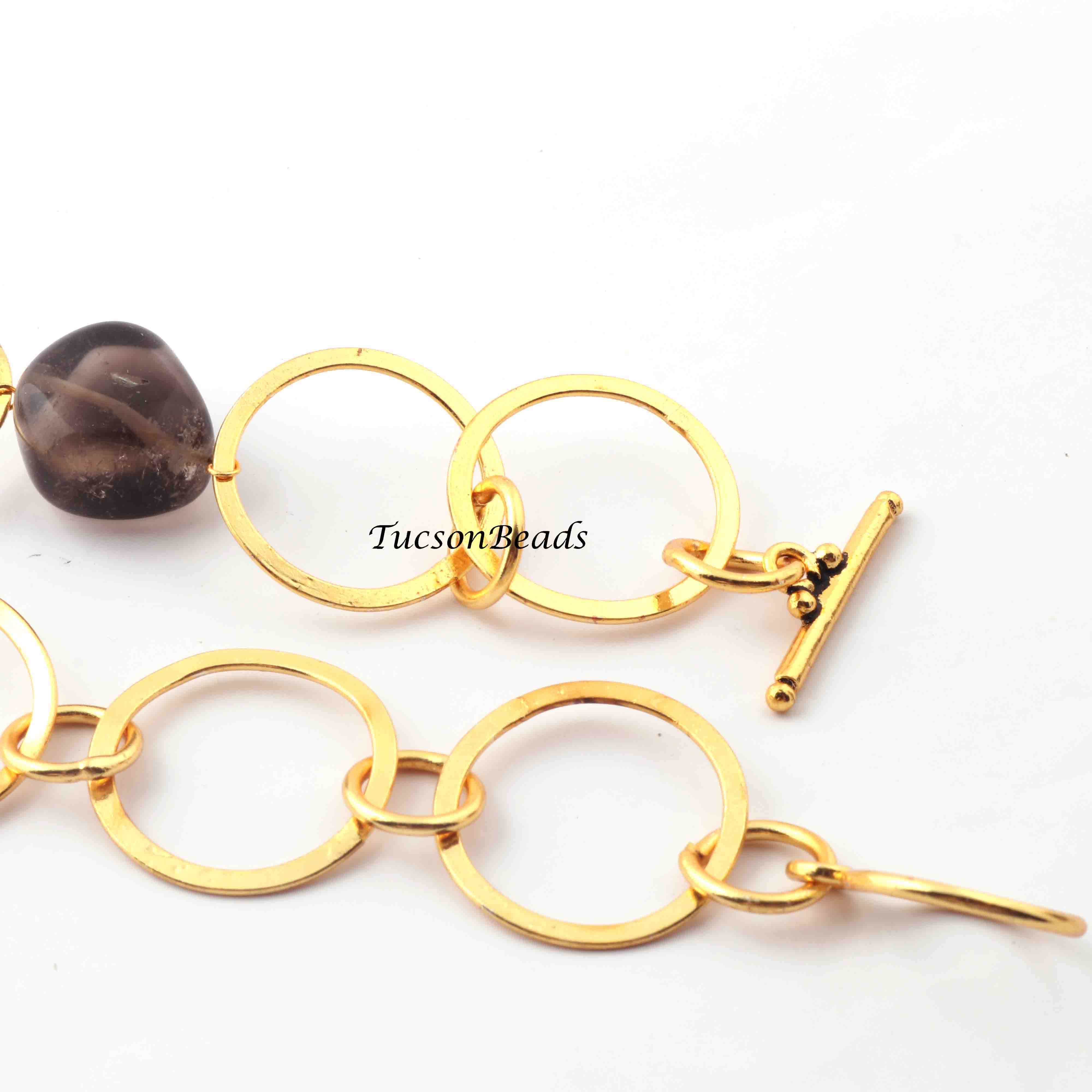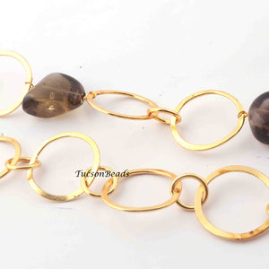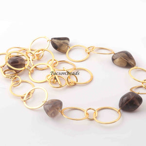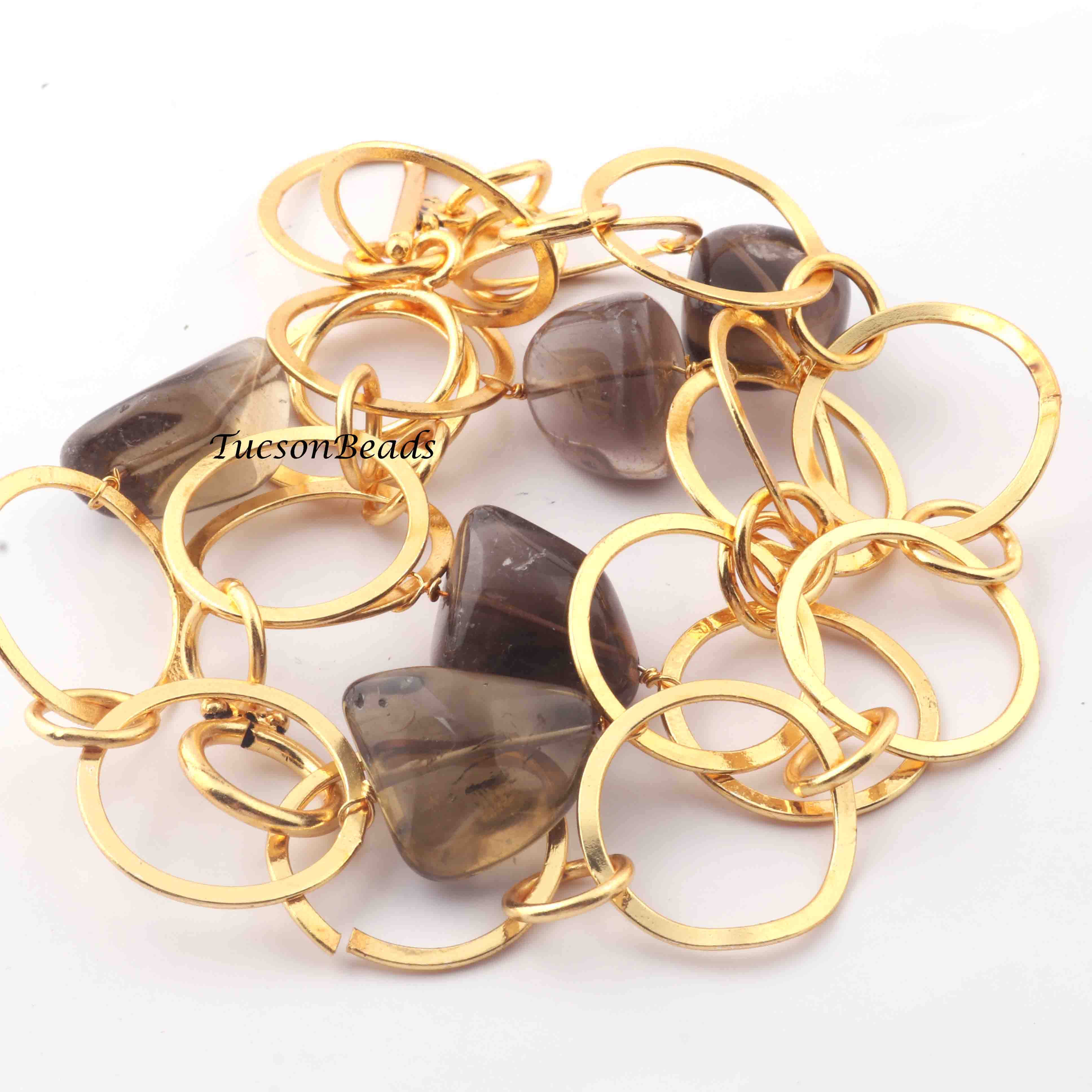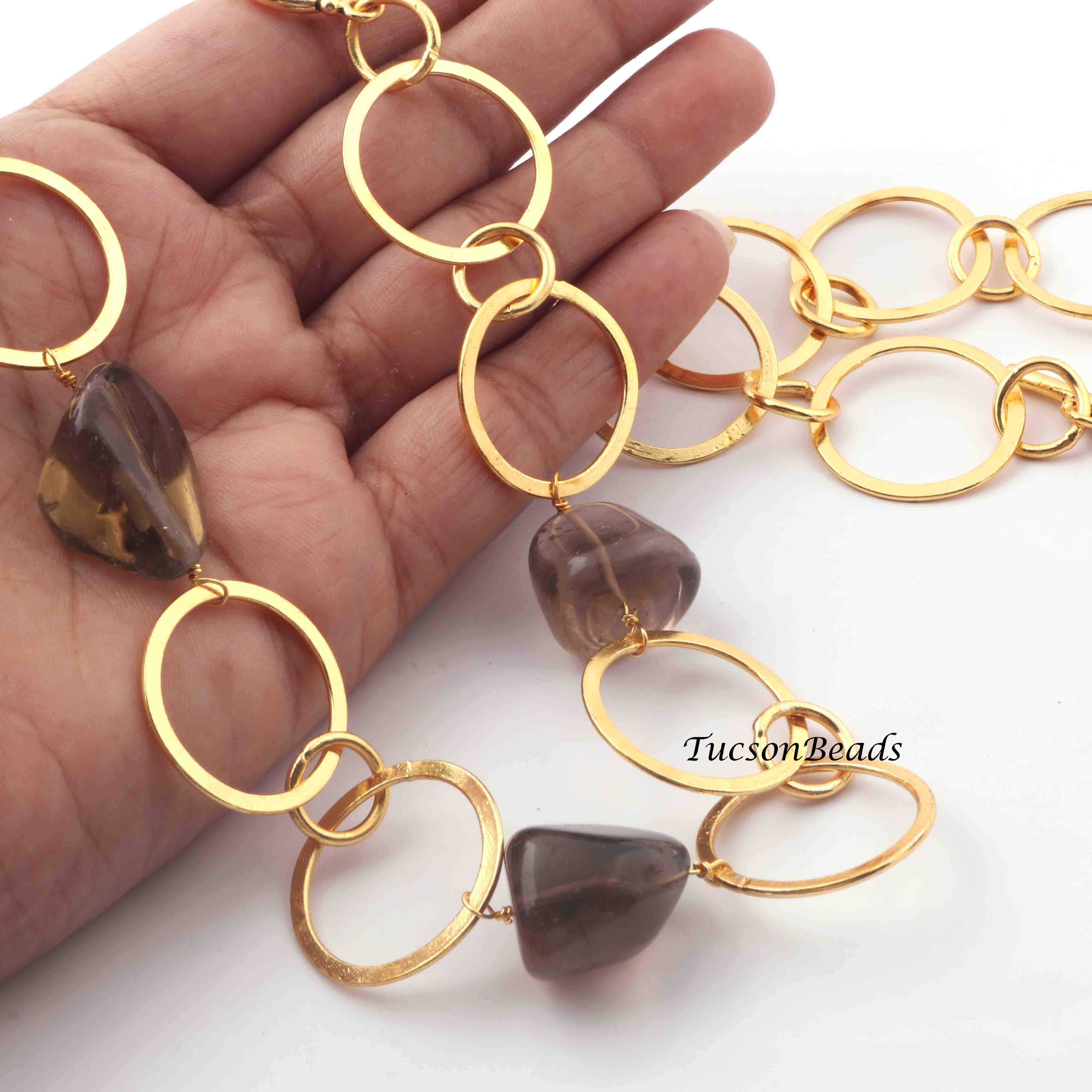 1 Necklace 24 K Gold Plated with Smoky Quartz Gemstone Copper Link Chain, Round Ring Chain, -19mmx18mm-26mmx16mm- 26 Inches, GPC1227