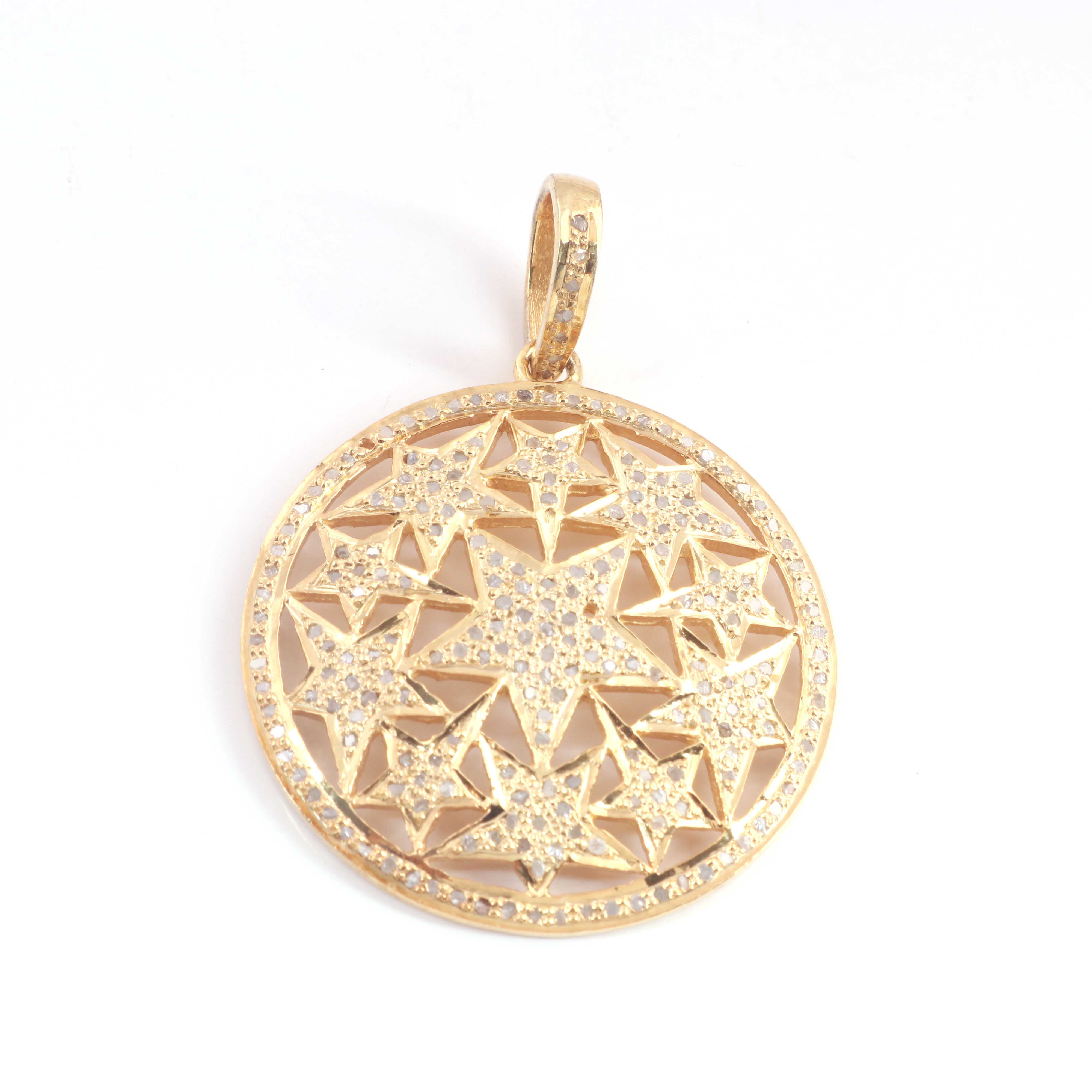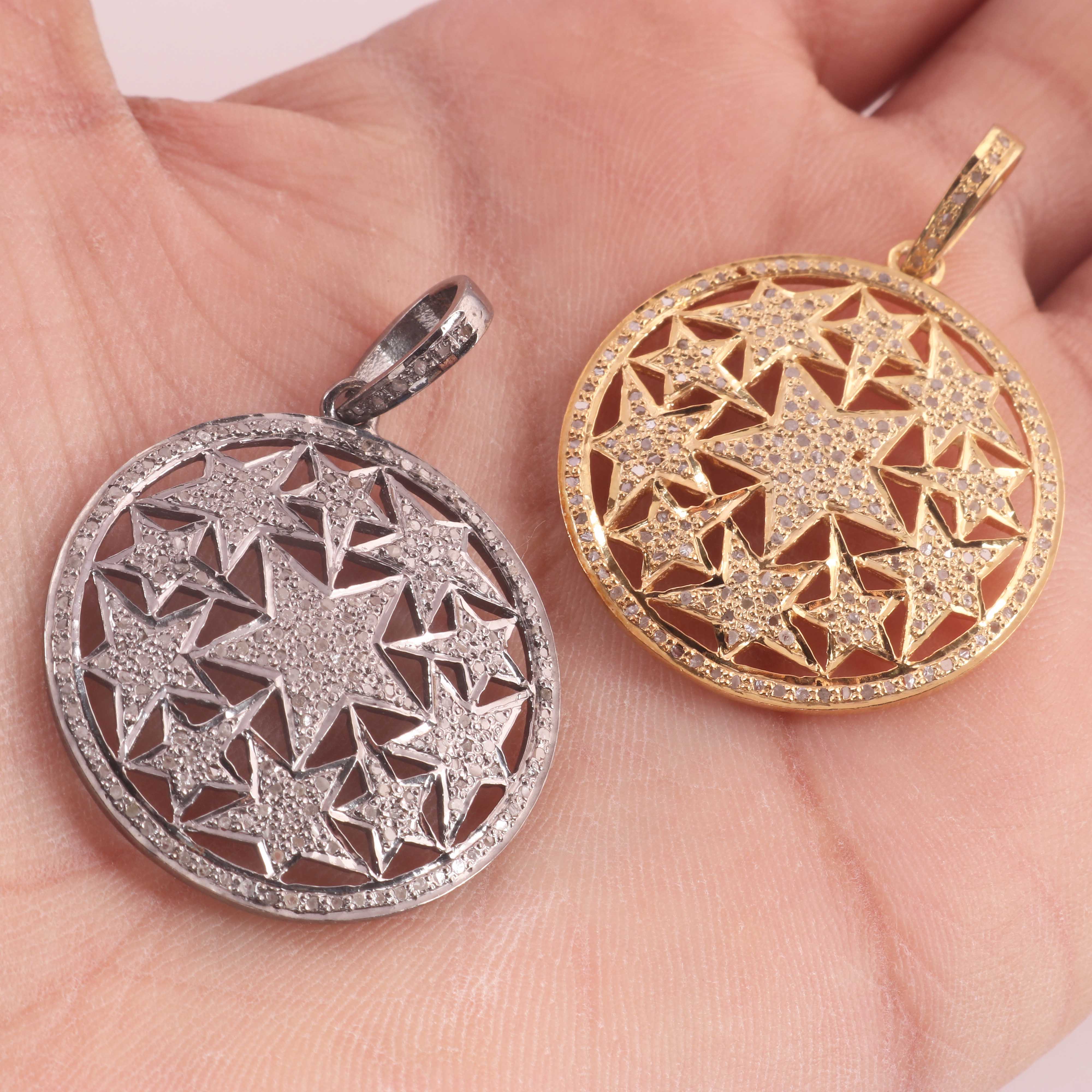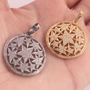 1 PC Pave Diamond Designer Round With Star Pendant - 925 Sterling Silver- Yellow Gold Vermeil Diamond Pendant 30mmx34mm PD1884