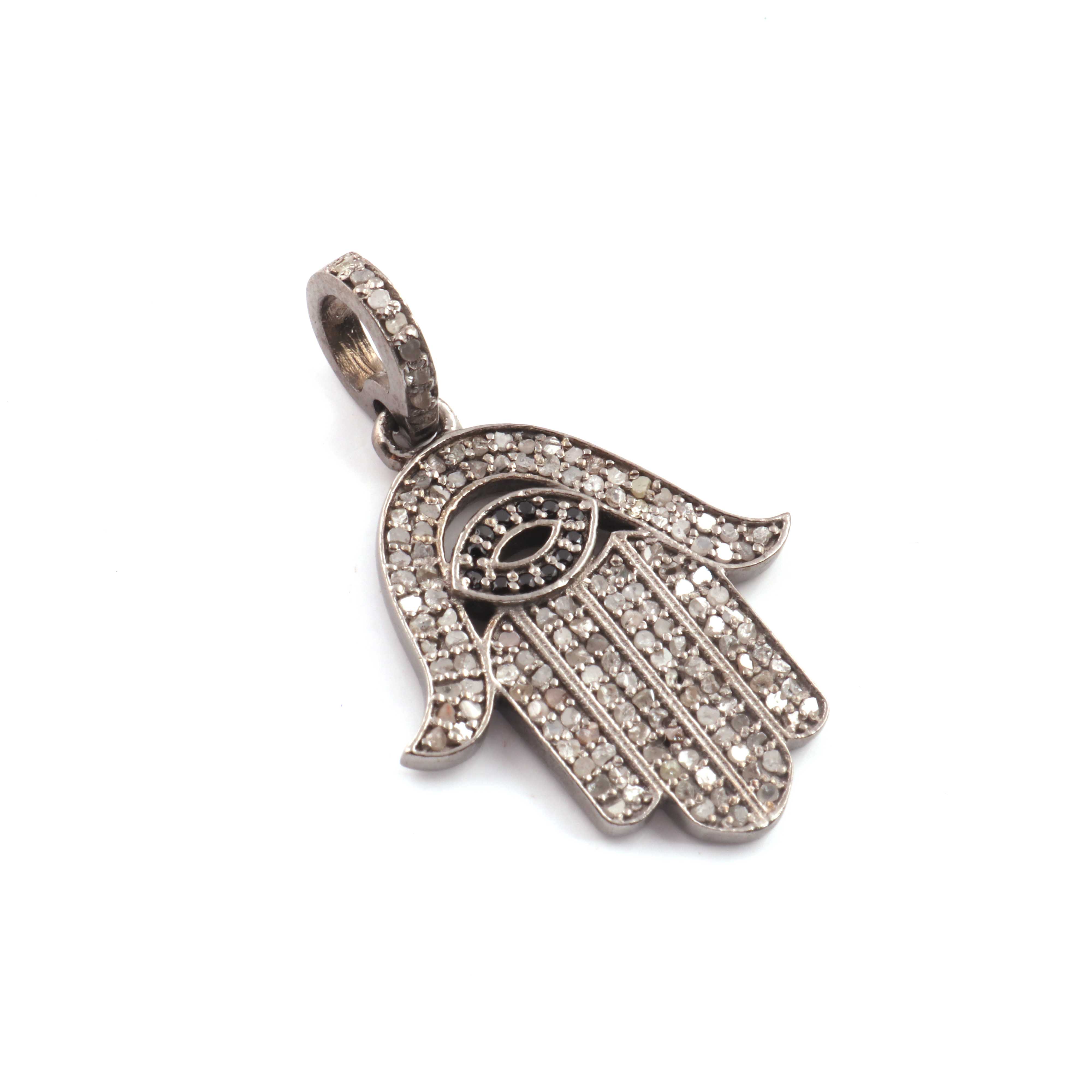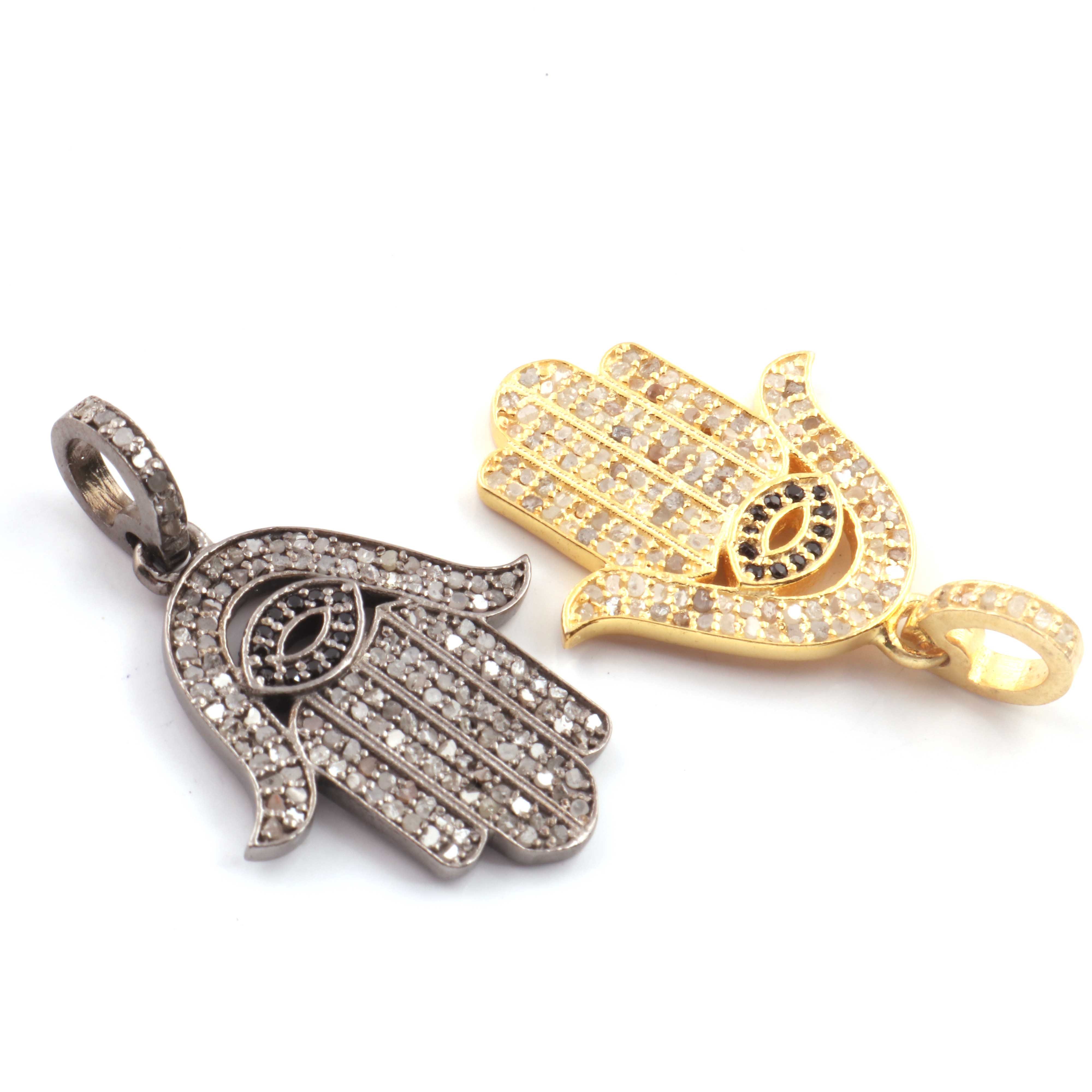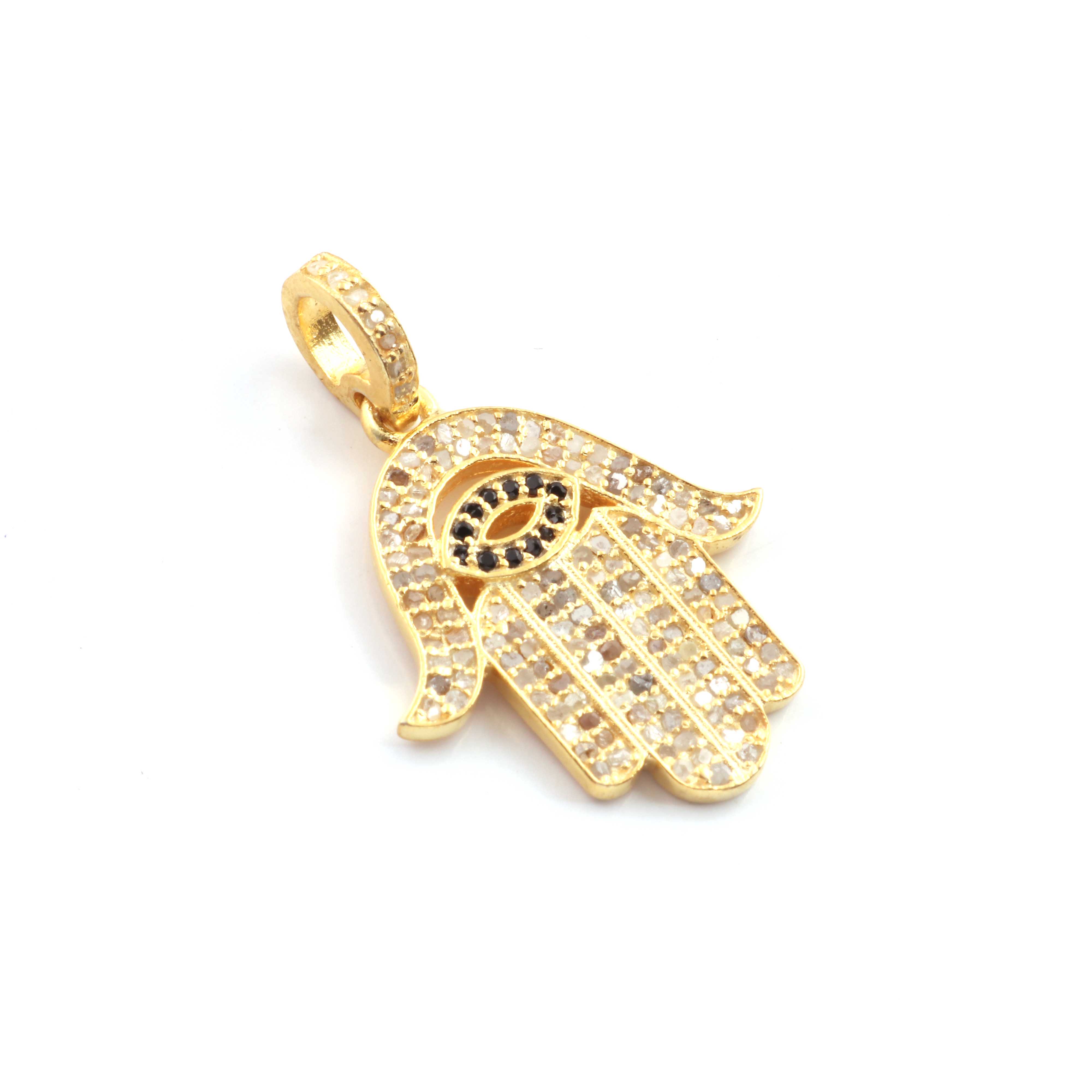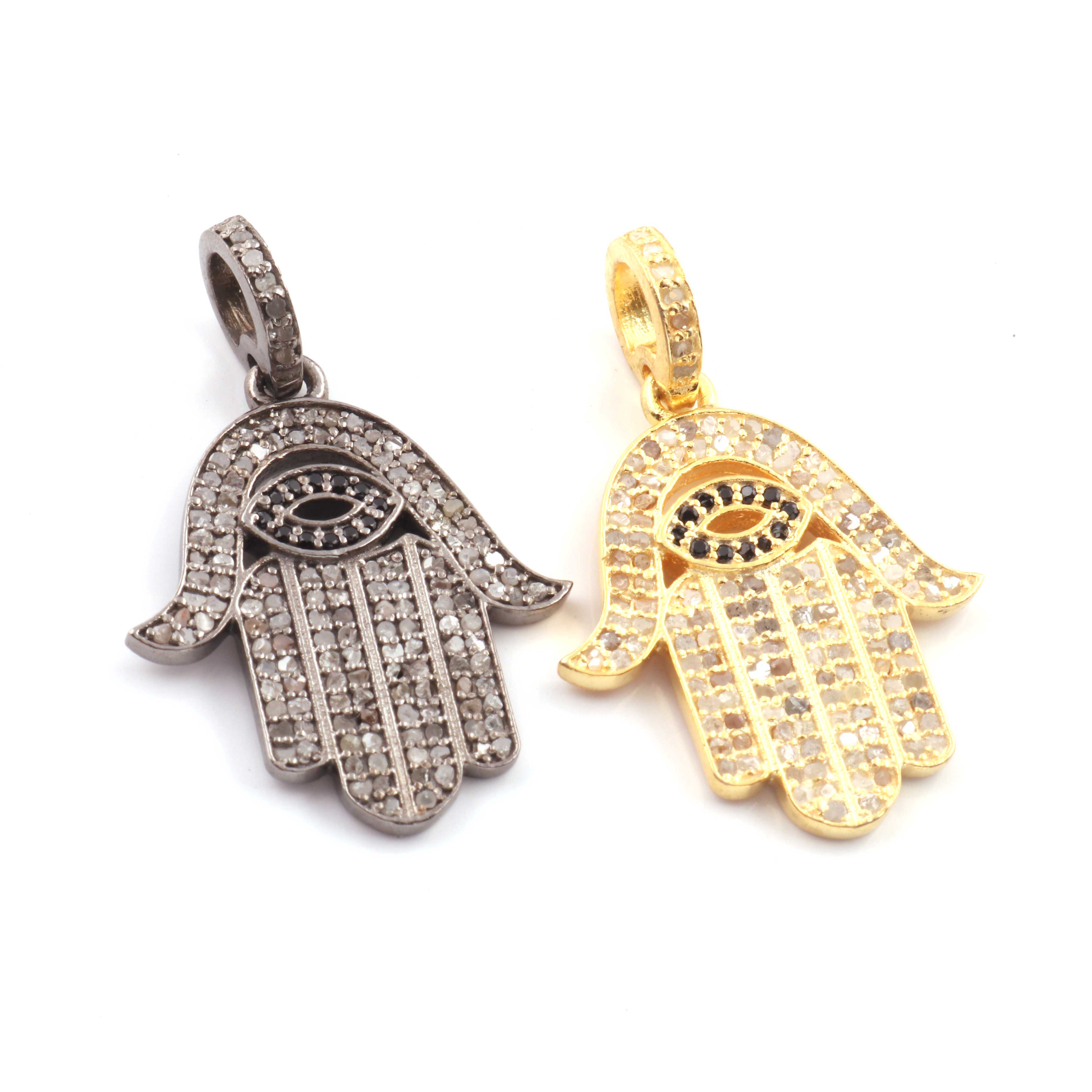 1 Pc Pave Diamond With Black Spinel Hamsa 925 Sterling Silver & Yellow Gold Vermeil Pendant- 21mmx25mm PDC00367
