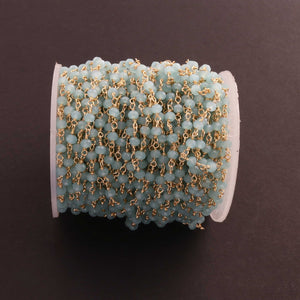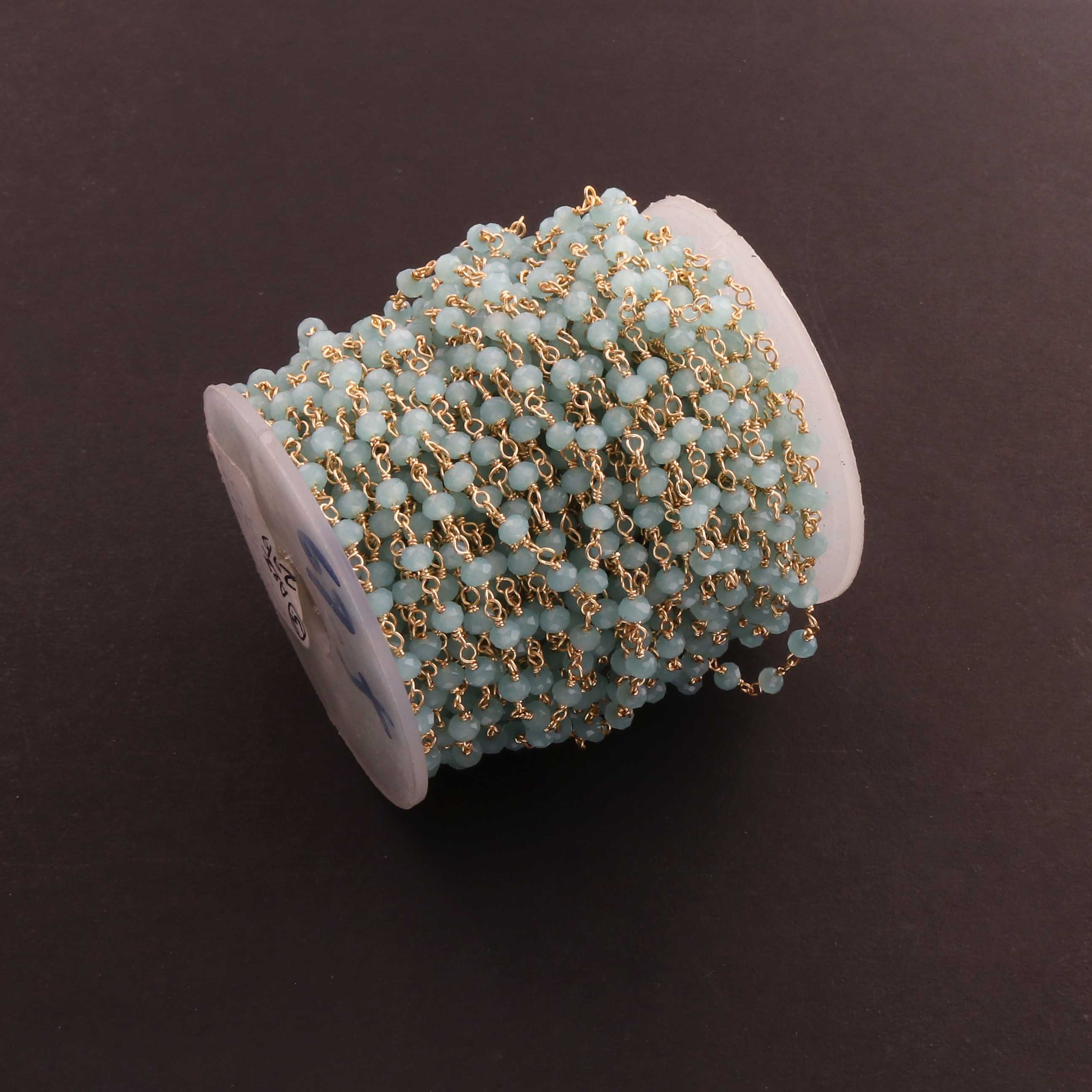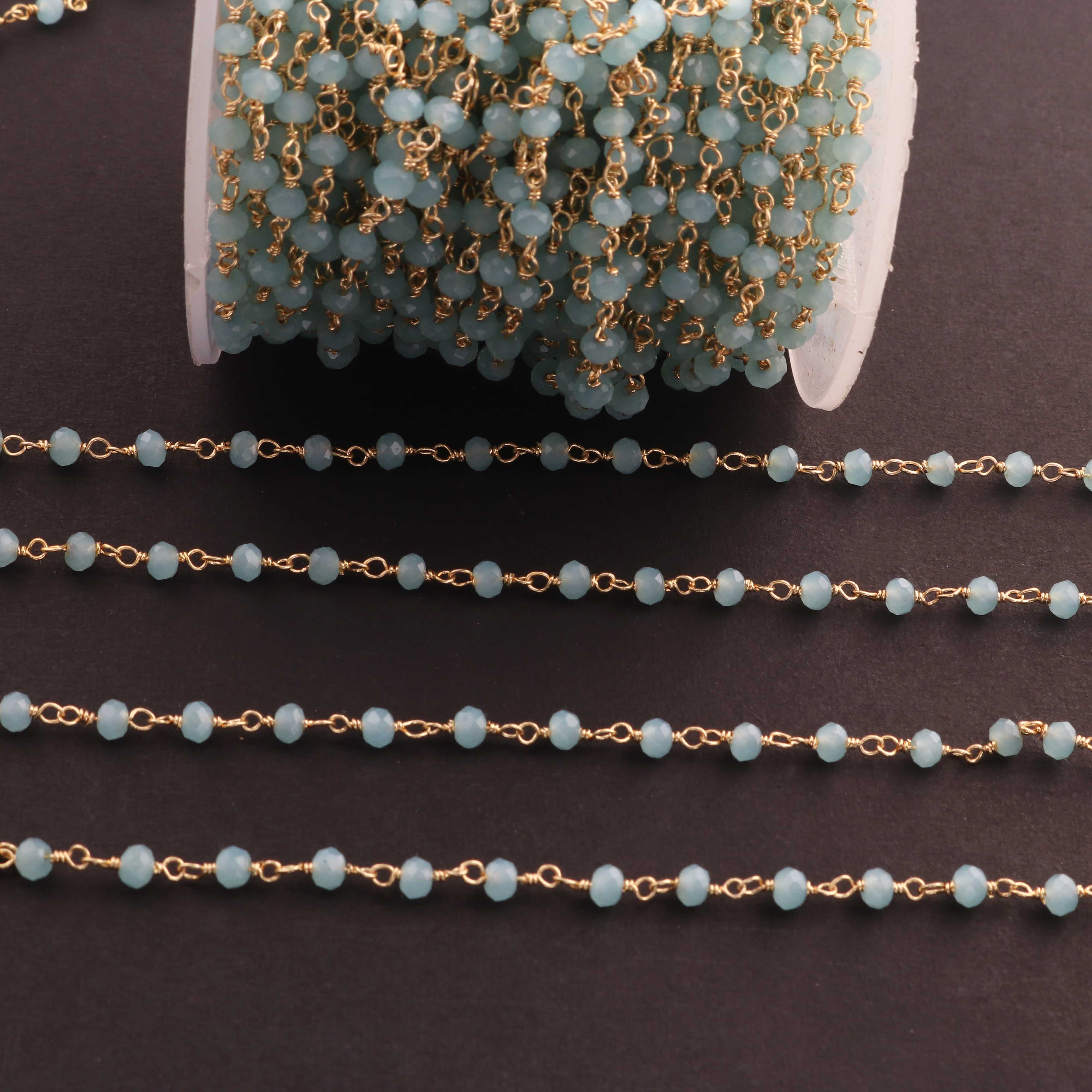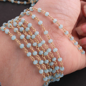 - 3 Feet Blue Aqua Glass Beads 3mm Faceted Rosary Beaded chain- 24 K Gold Plated Wire Wrapped Chain