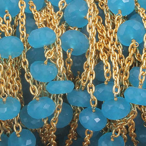 LISTING IS FOR 3 FEETS Blue Chalcedony Rondelles wire wrapped with 24k gold Plated chain. BD459
