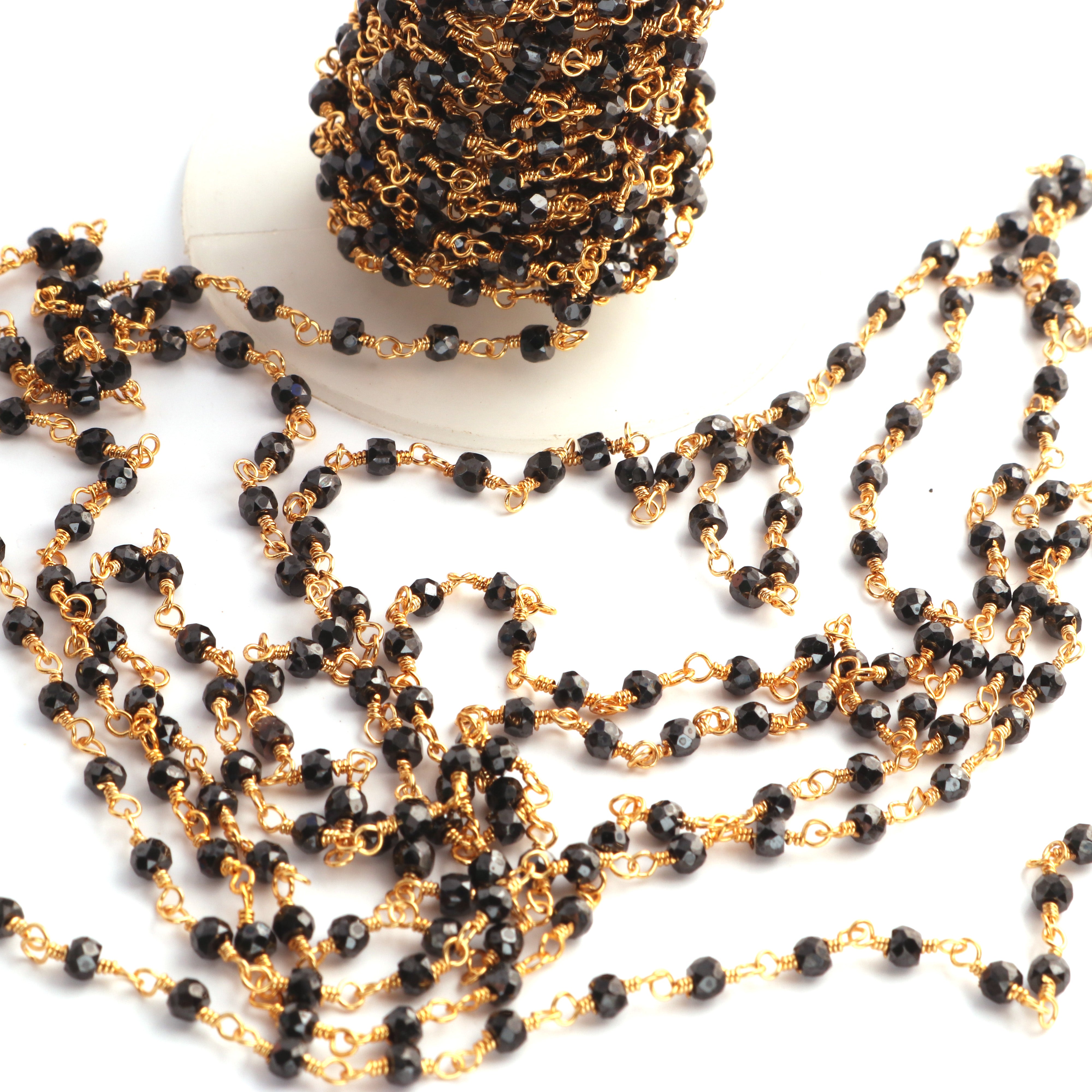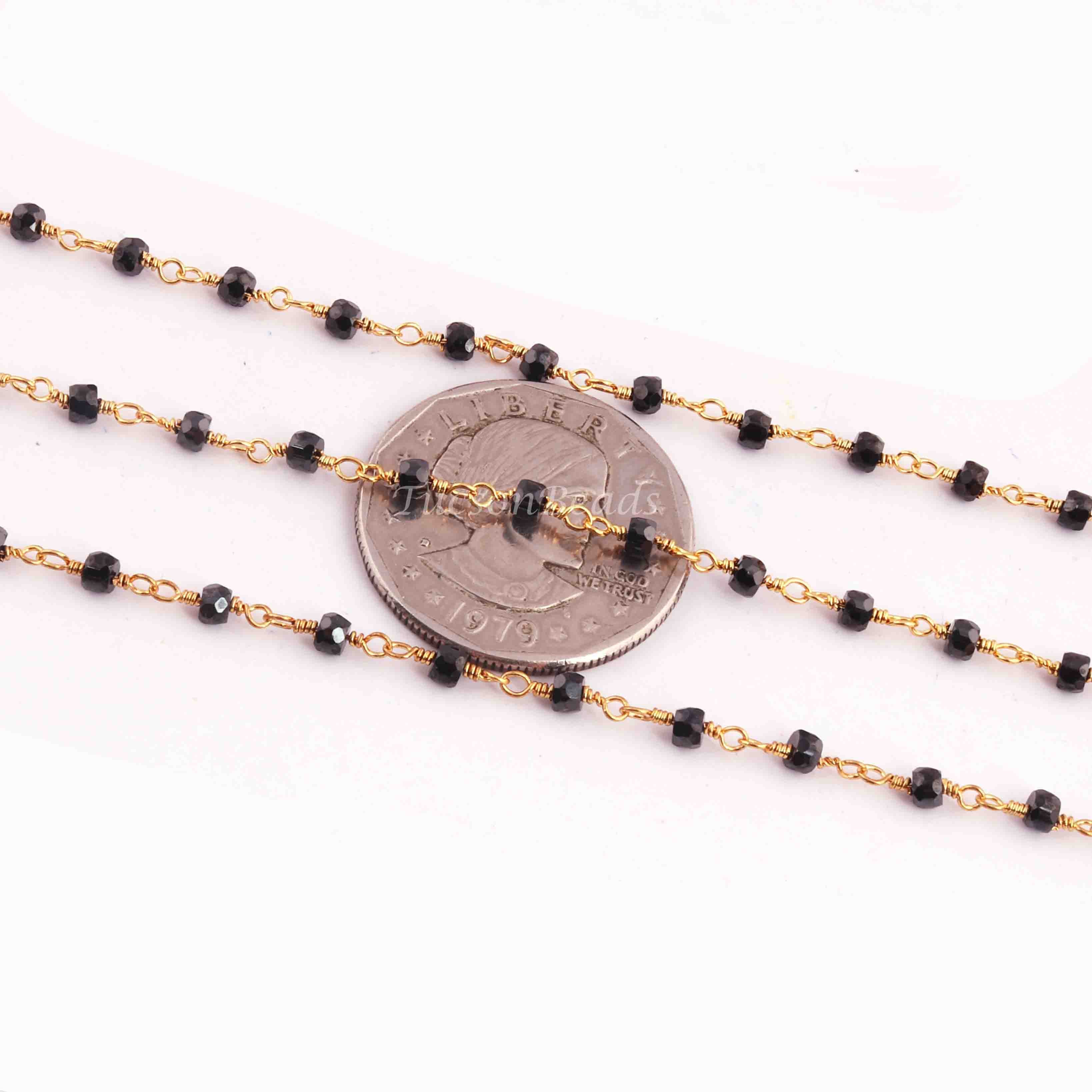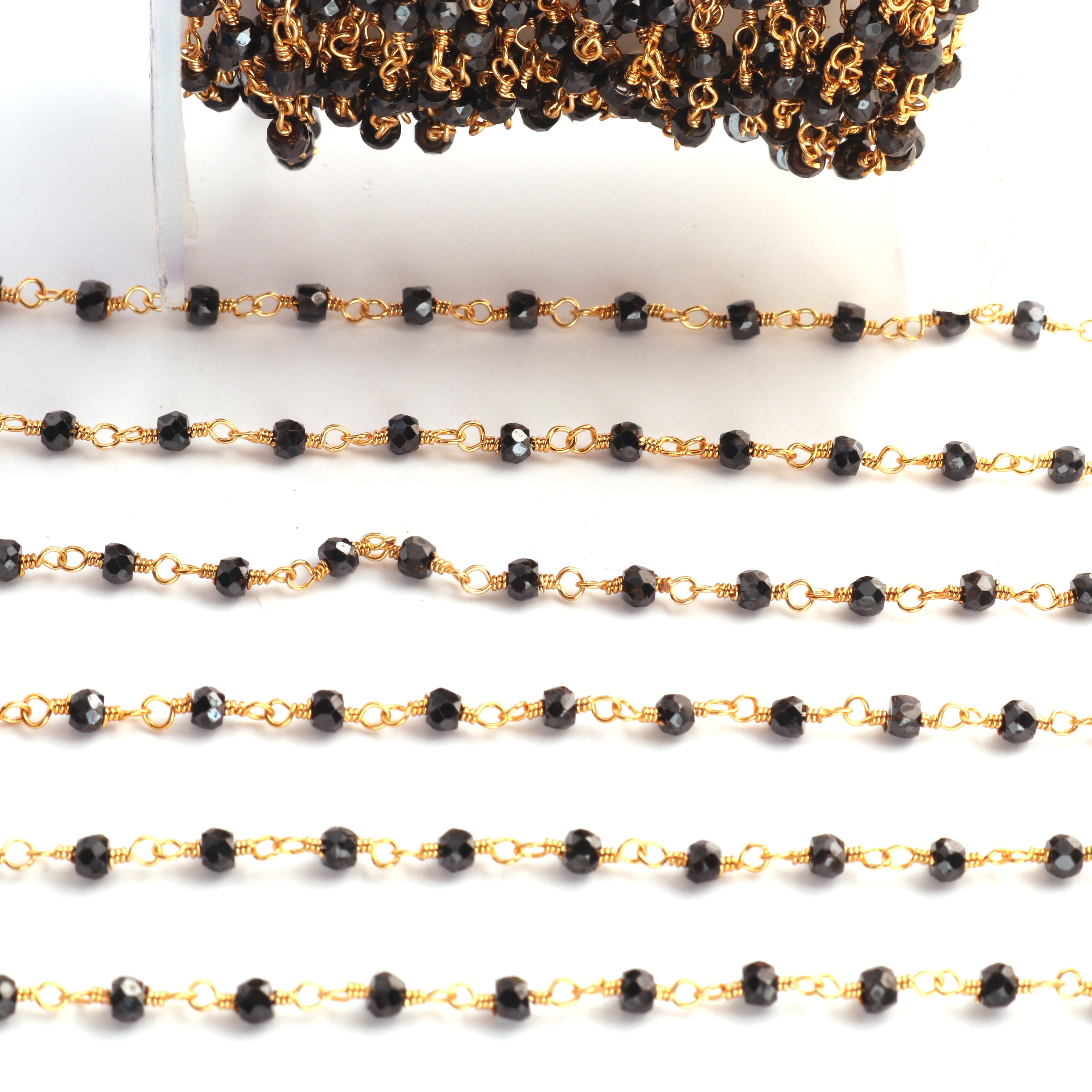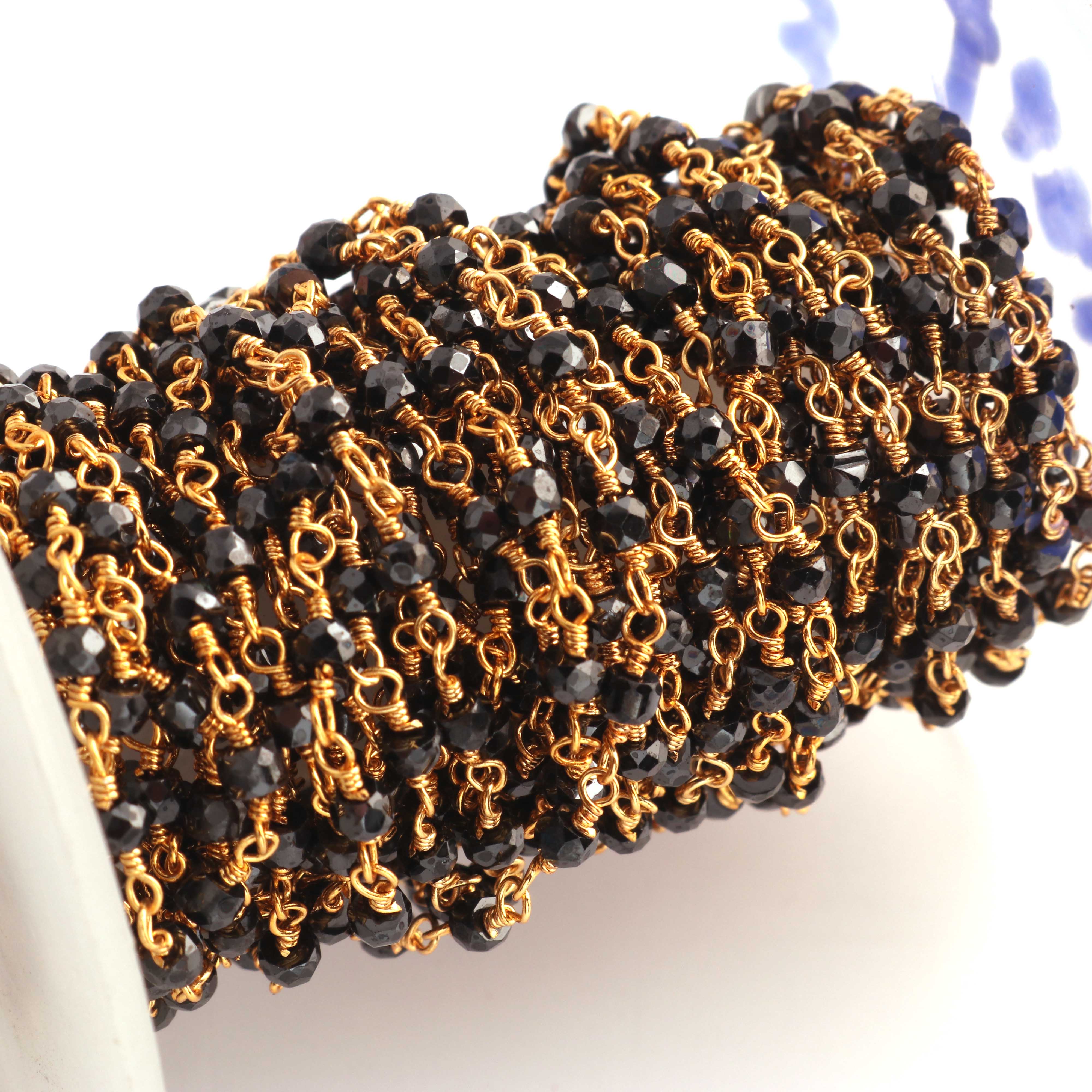 5 FEET Black Zircon 3mm Rosary Style Beaded Chain - Zircon Beads wire wrapped 24k Gold Plated chain SC330