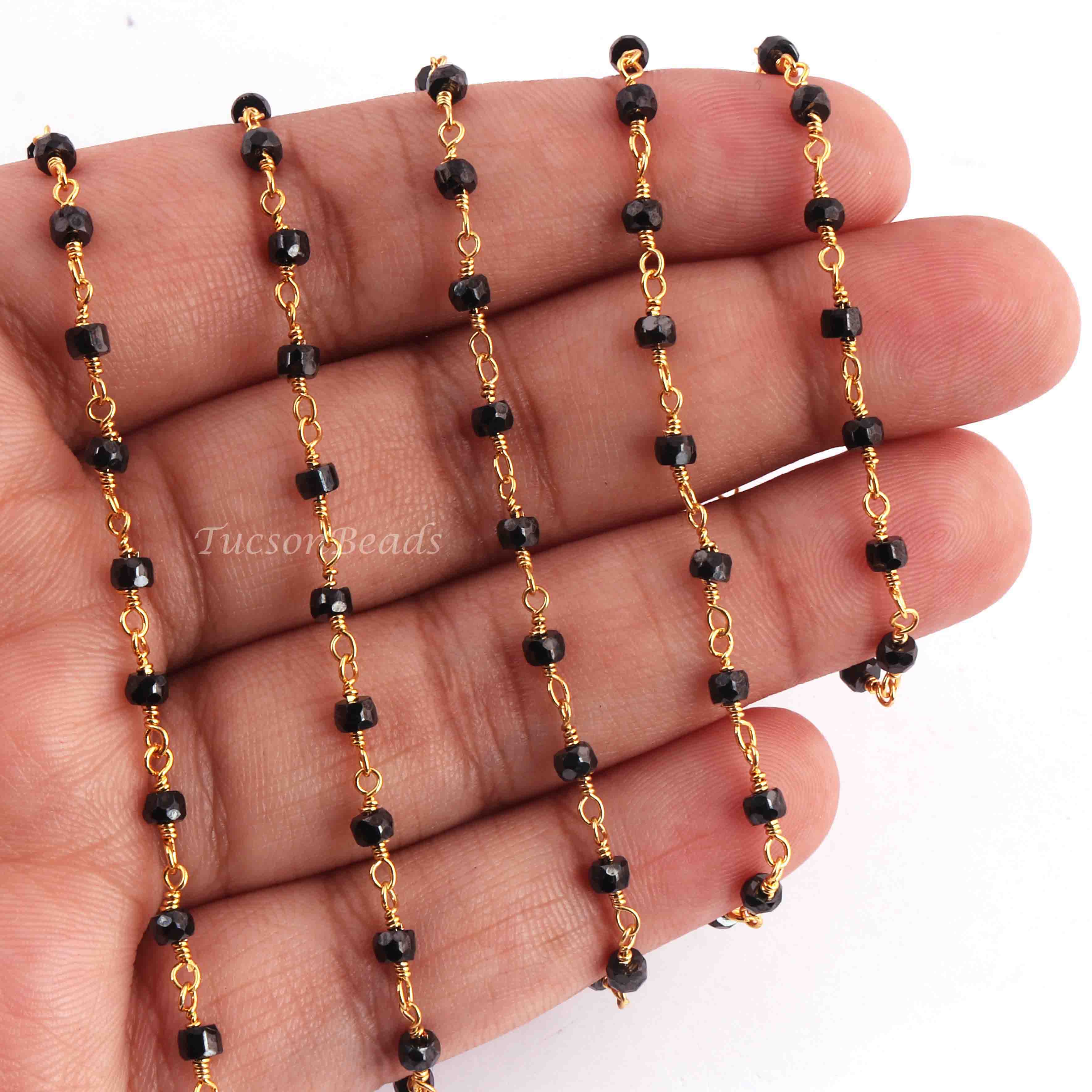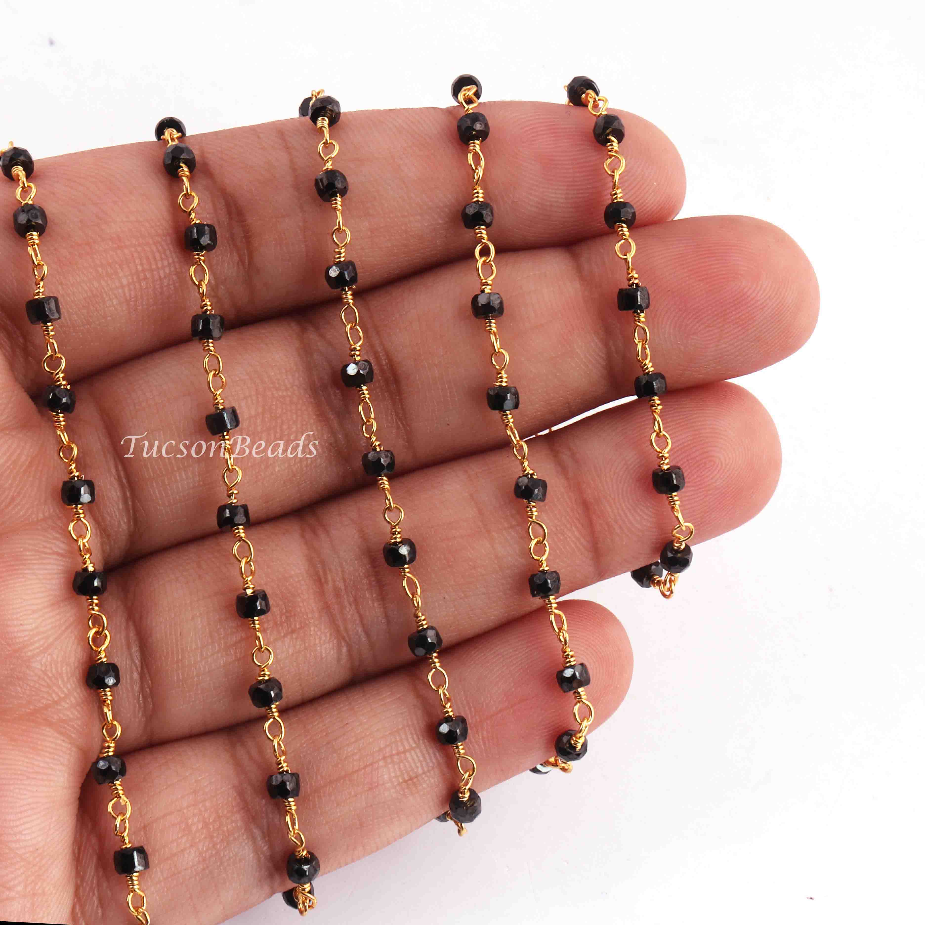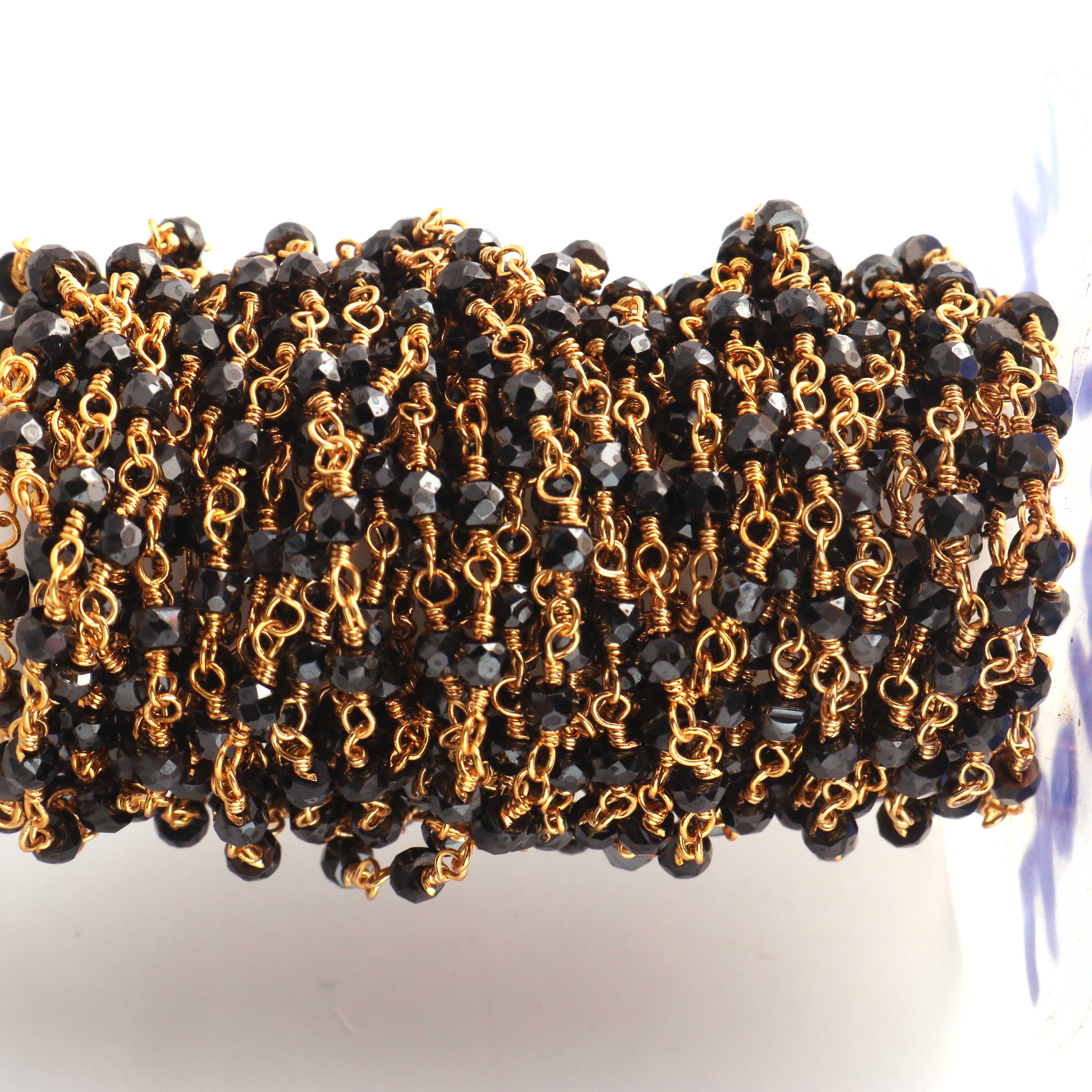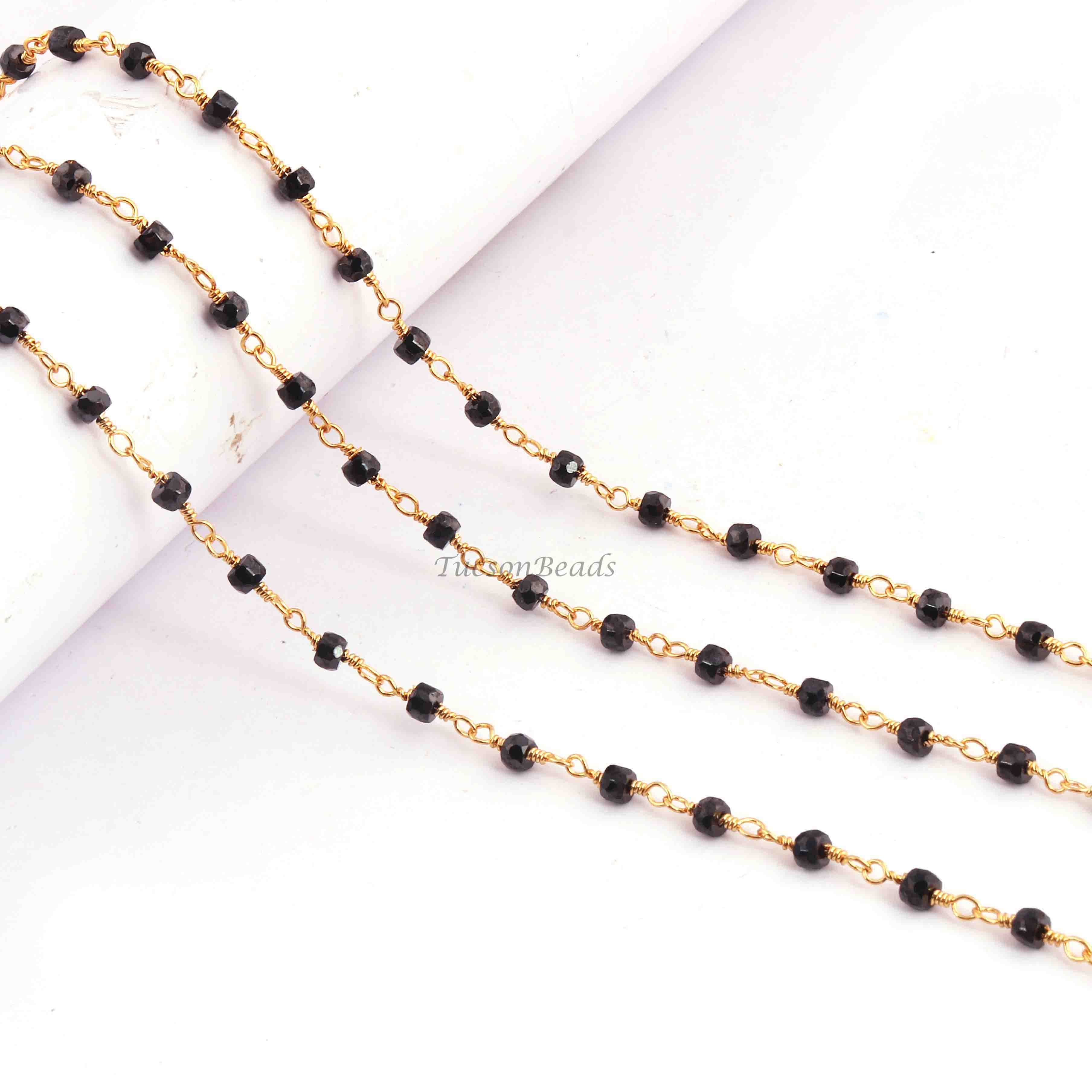 5 FEET Black Zircon 3mm Rosary Style Beaded Chain - Zircon Beads wire wrapped 24k Gold Plated chain SC330