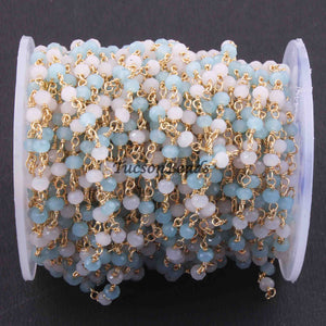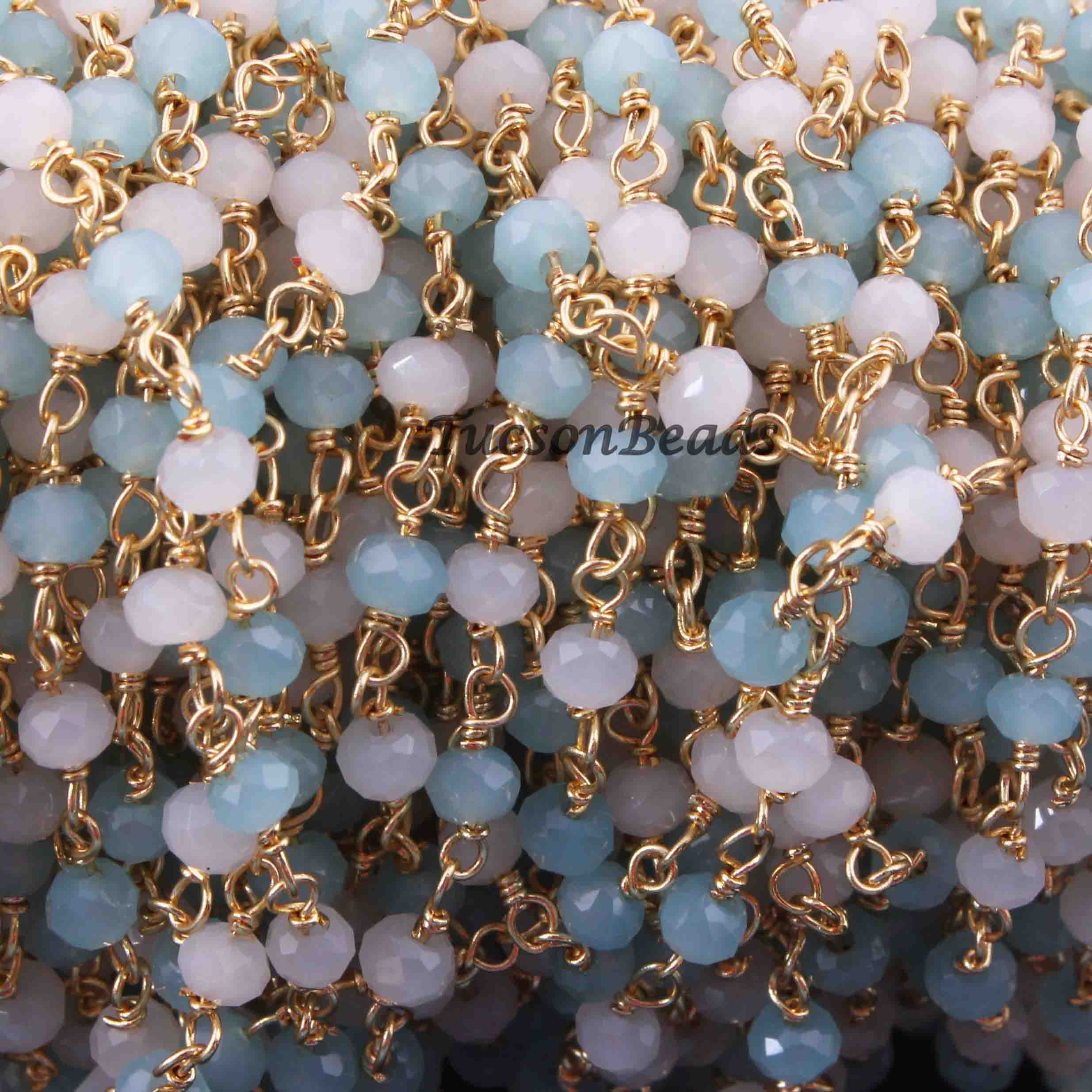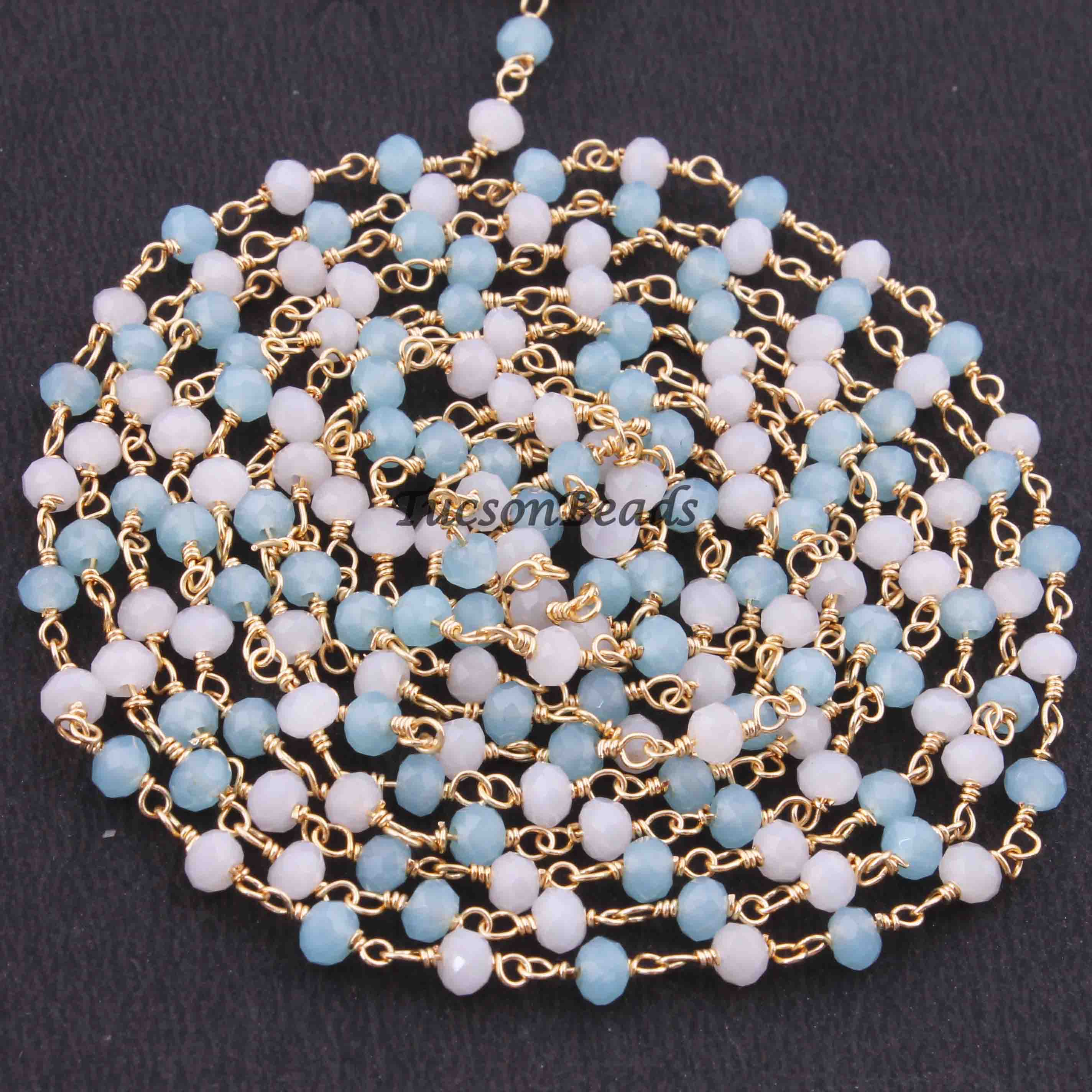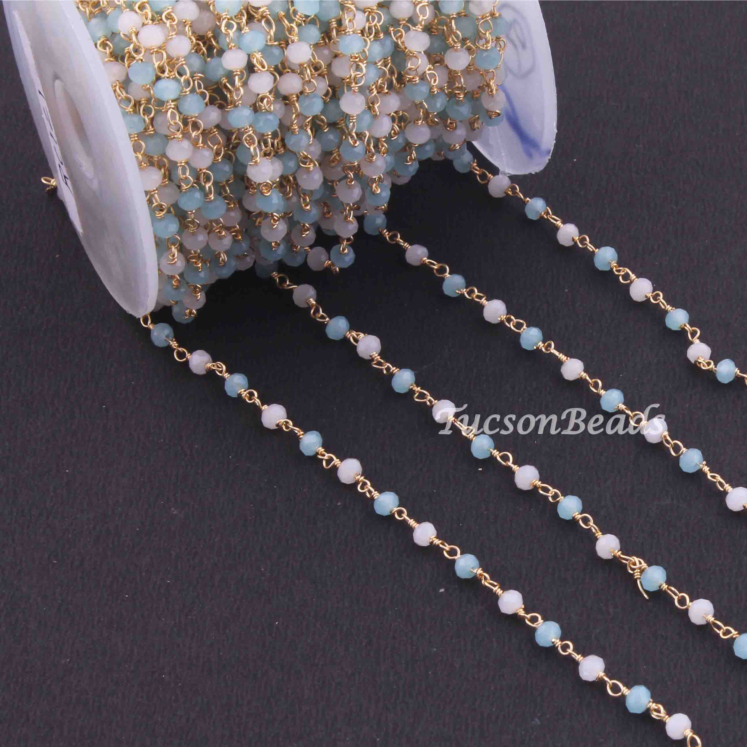 5 Feet Mix Glass Hydro Rosary Beaded Chain, 3mm Faceted Beads, 24k Gold Plated Wire Wrapped Chain, Designer Chain Jewelry