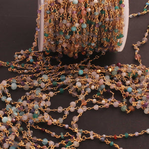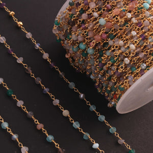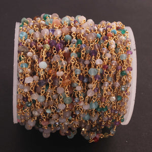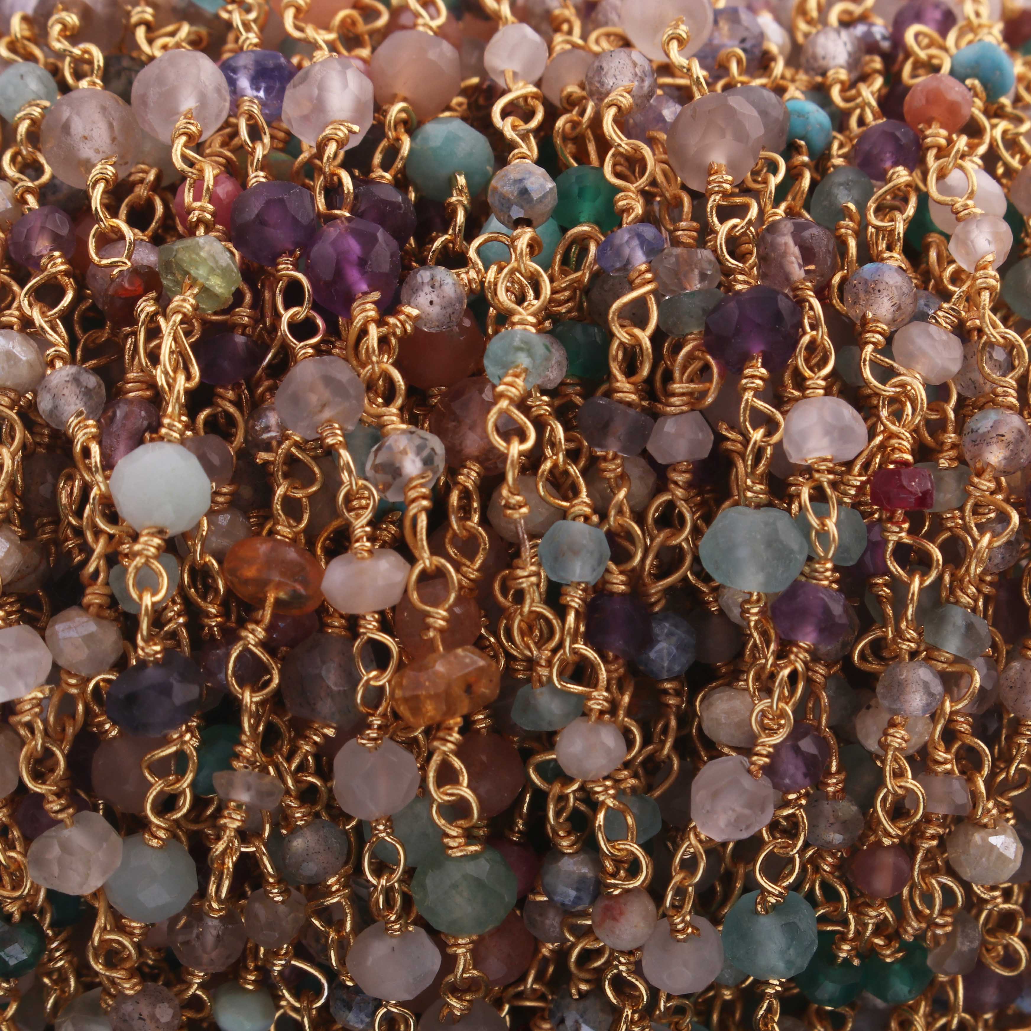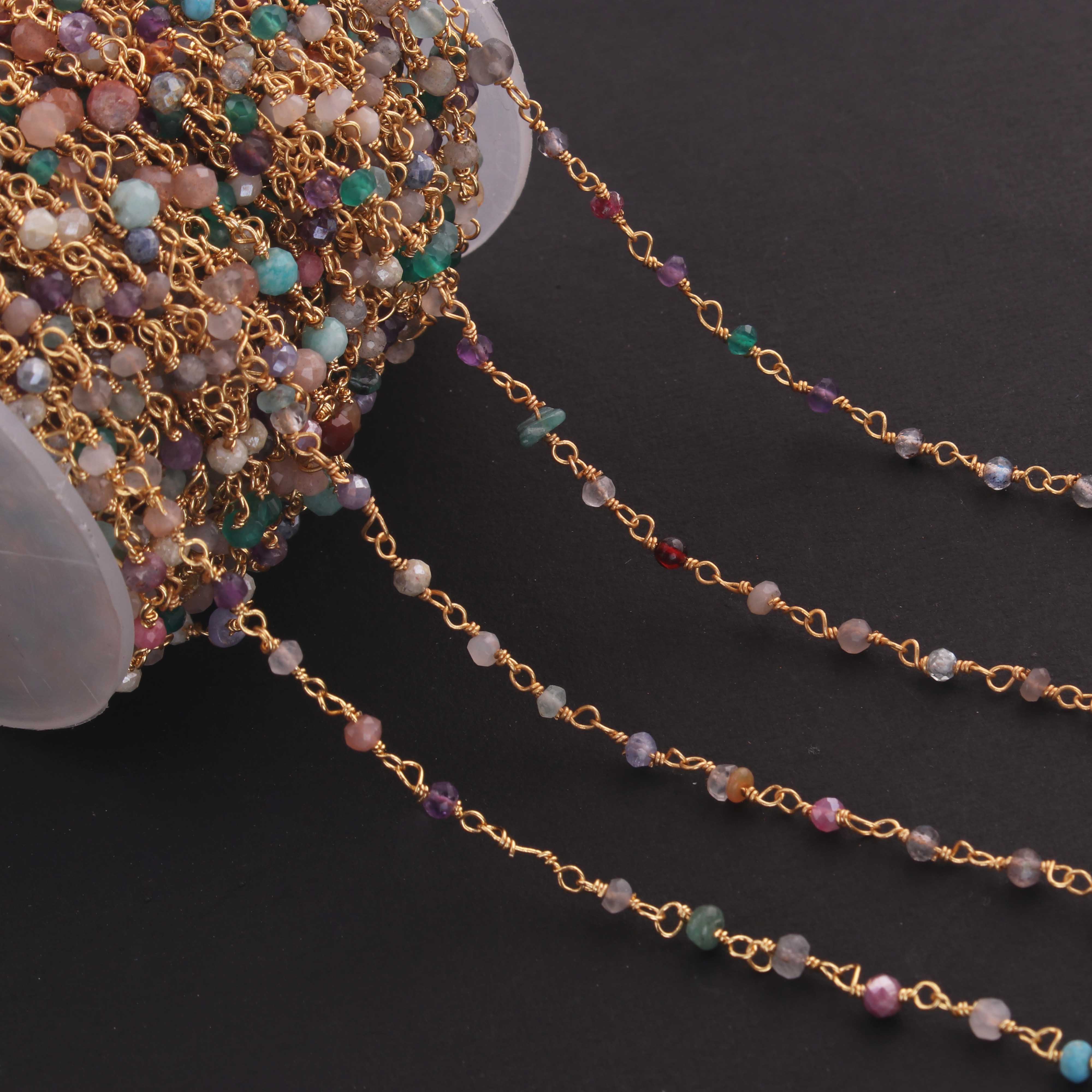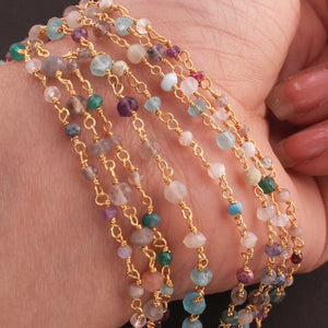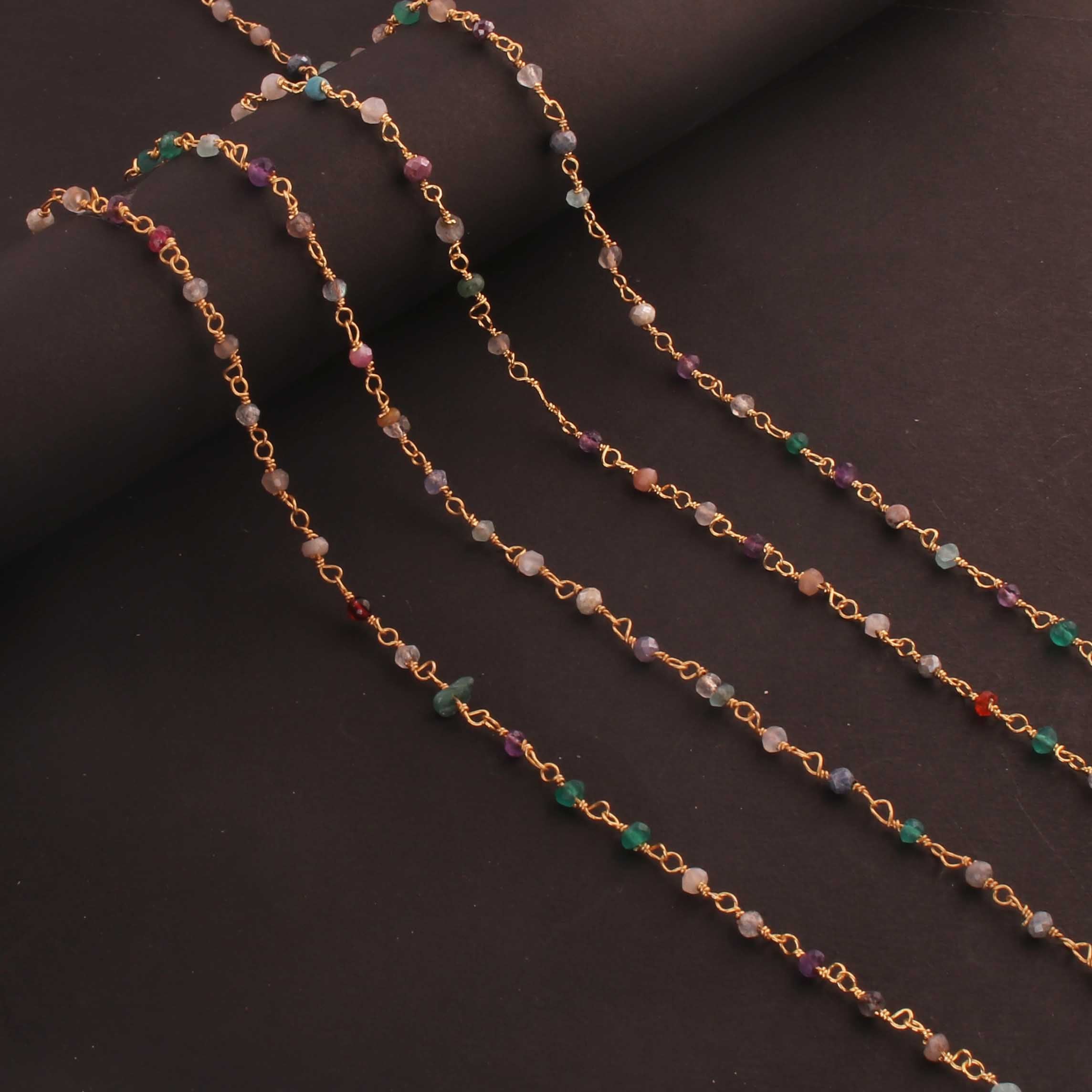 5 Feet Mix Stone 3mm 24k Gold Plated Rosary Beaded Chain- Mix Stone Beaded Chain- BD002