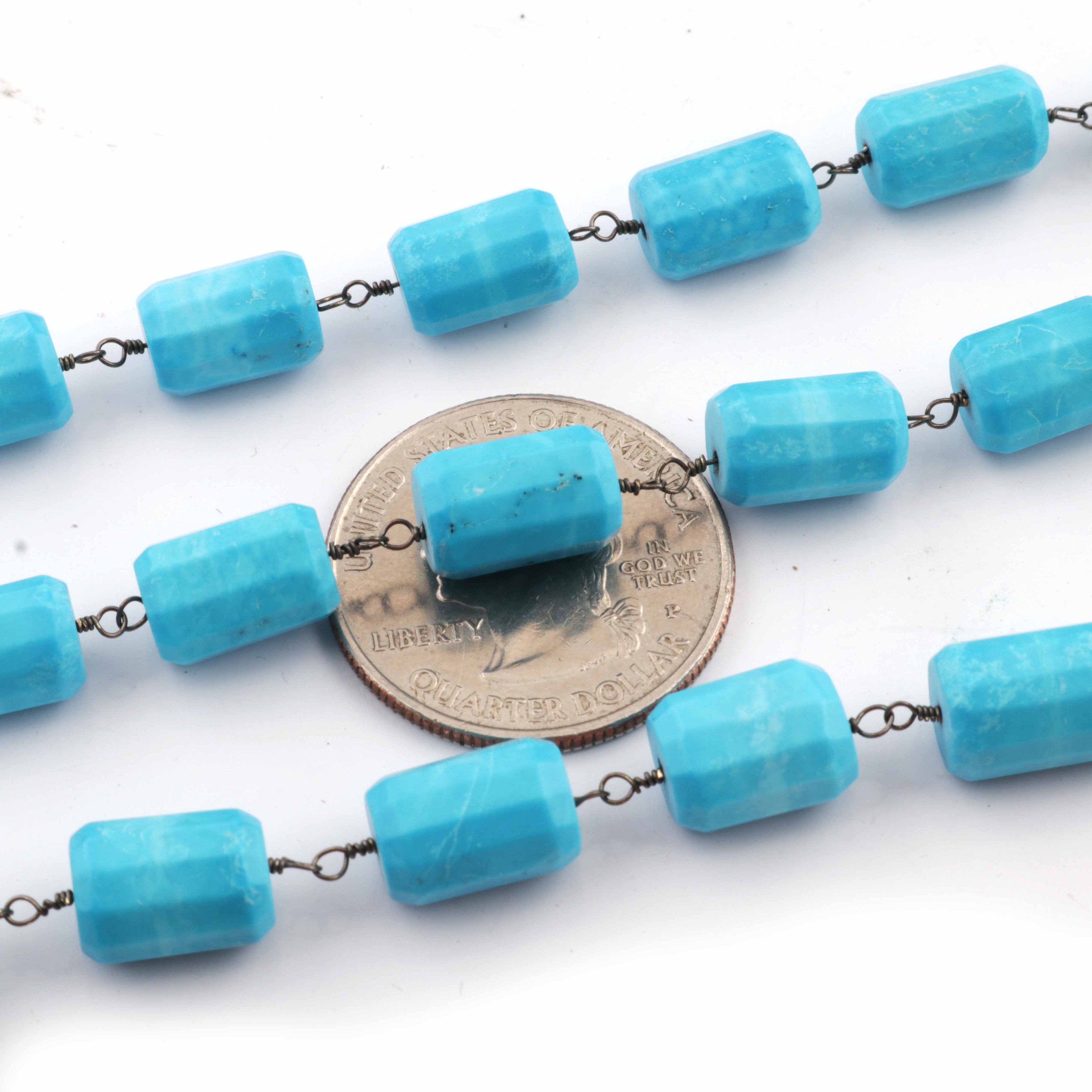 This chain isTurquoise Stablized wire wrapped with Oxidized Silver Plated chain .