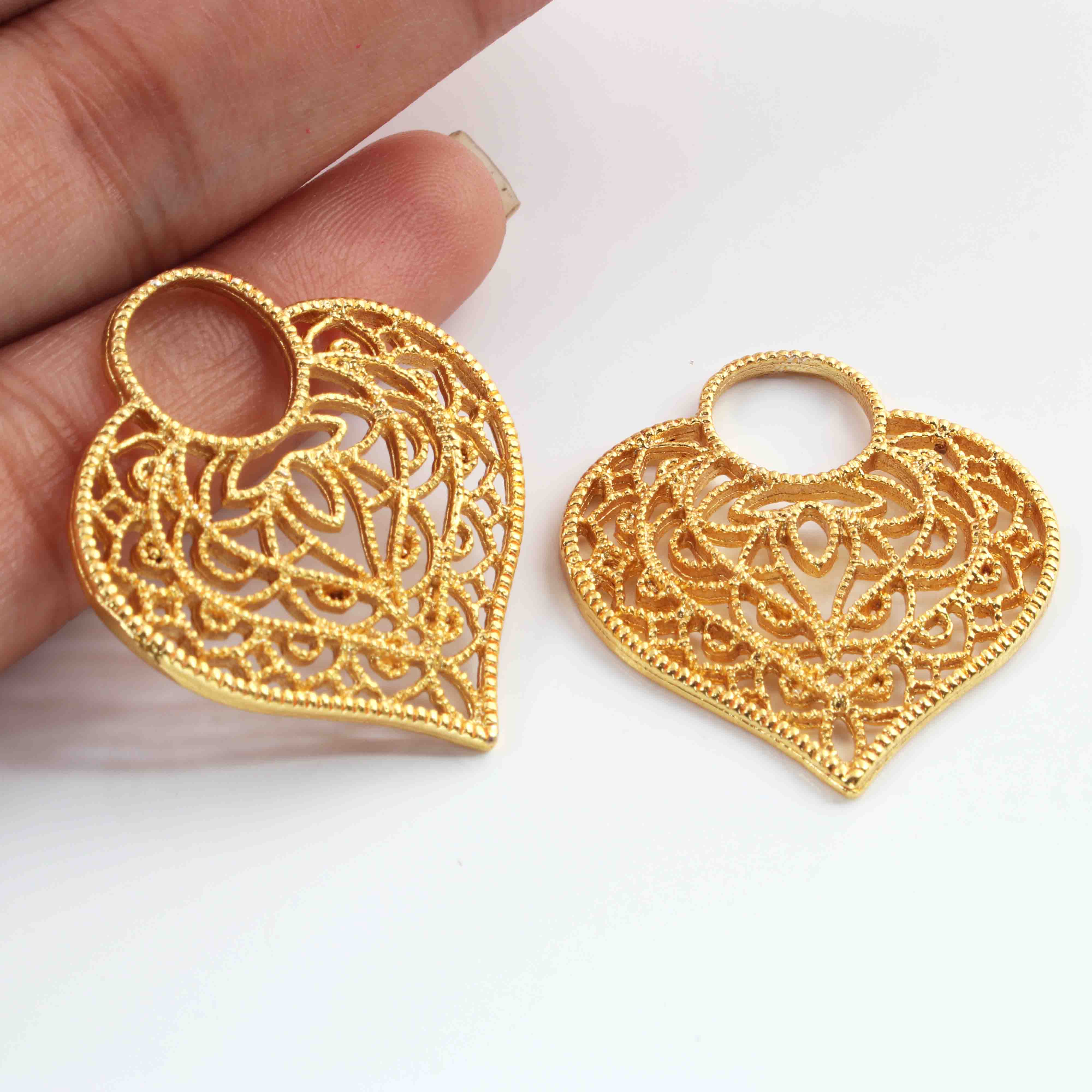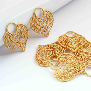 5 Pcs Gold Heart Charm - 24k Matte Gold Plated Heart - Brass Gold Heart With Filigree Design Pendant 33mmx30mm GPC394