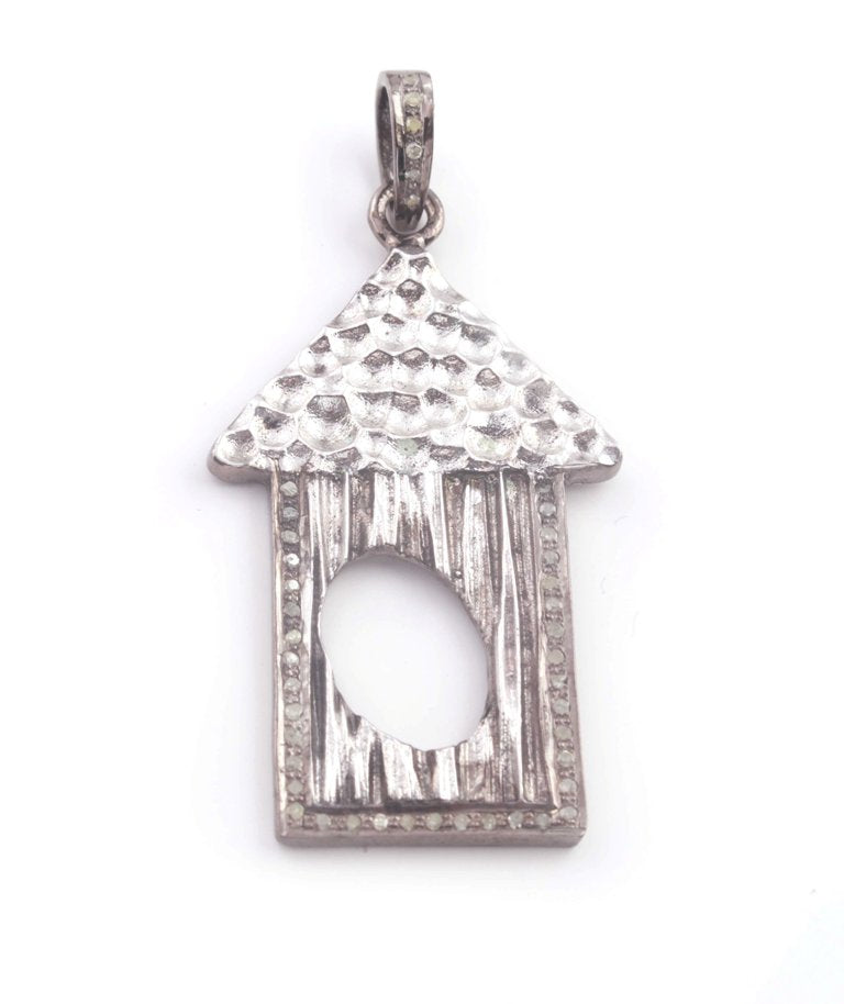 1 Pc Antique Finish Pave Diamond Designer Hut & Center Oval Pendant - 925 Sterling Silver- Necklace Pendant 47mmx26mm PDC277
