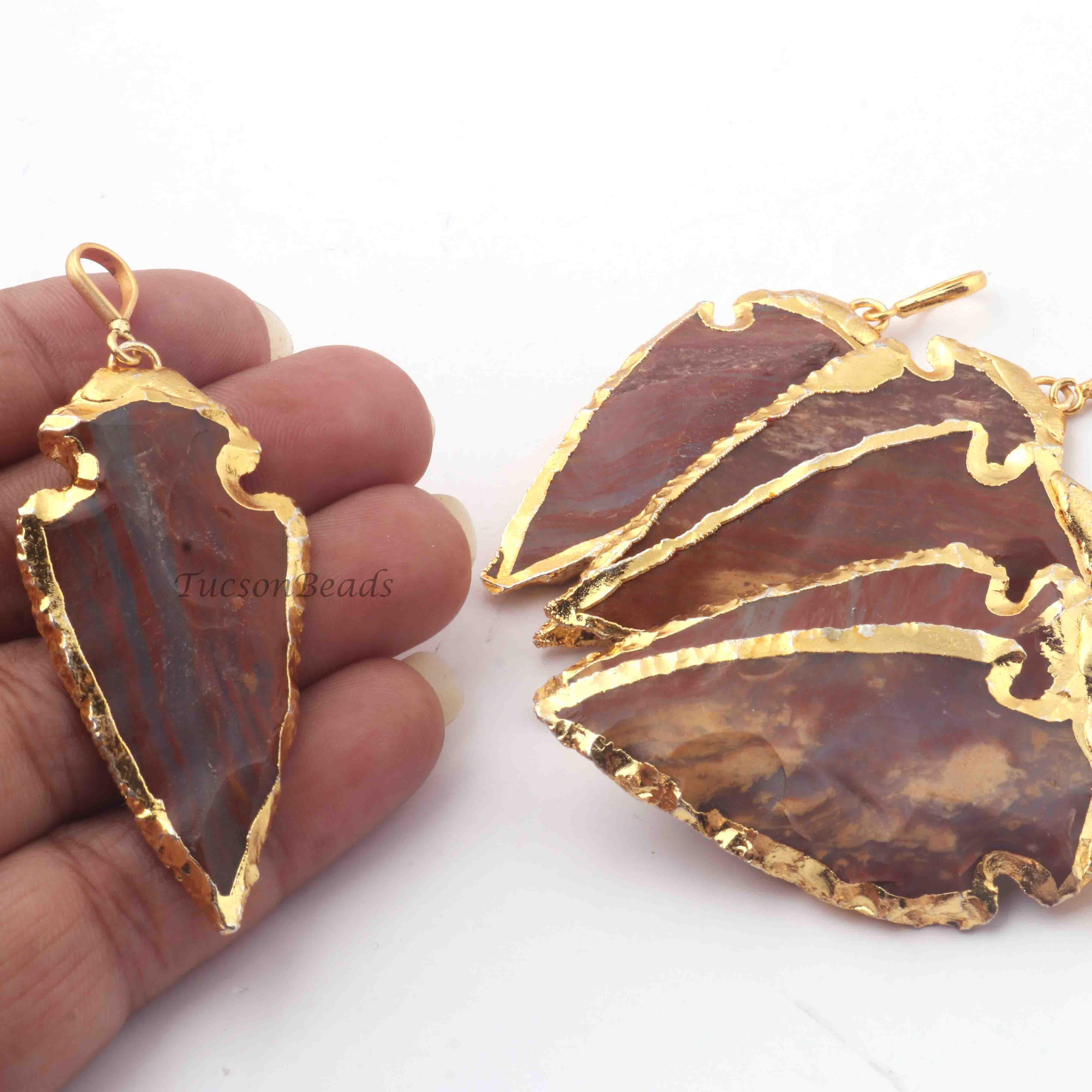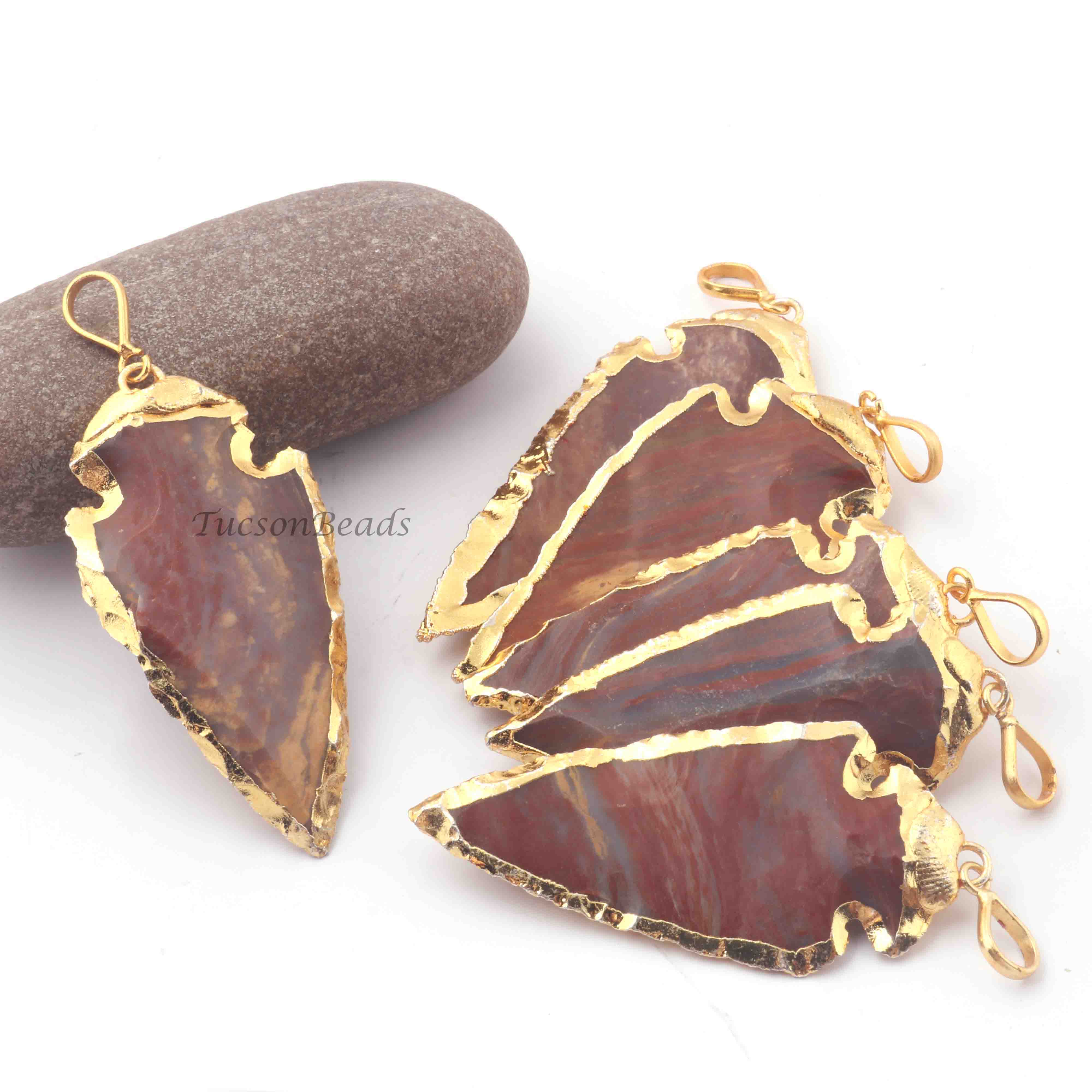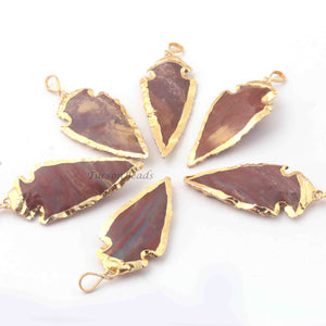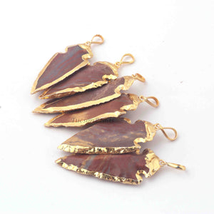 6 Pcs Shaded Brown Jasper Arrowhead 24k Gold Plated Charm Pendant - Electroplated With Gold Edge 62mmX25mm - AR054