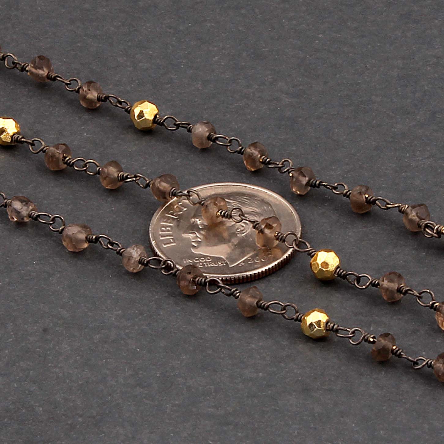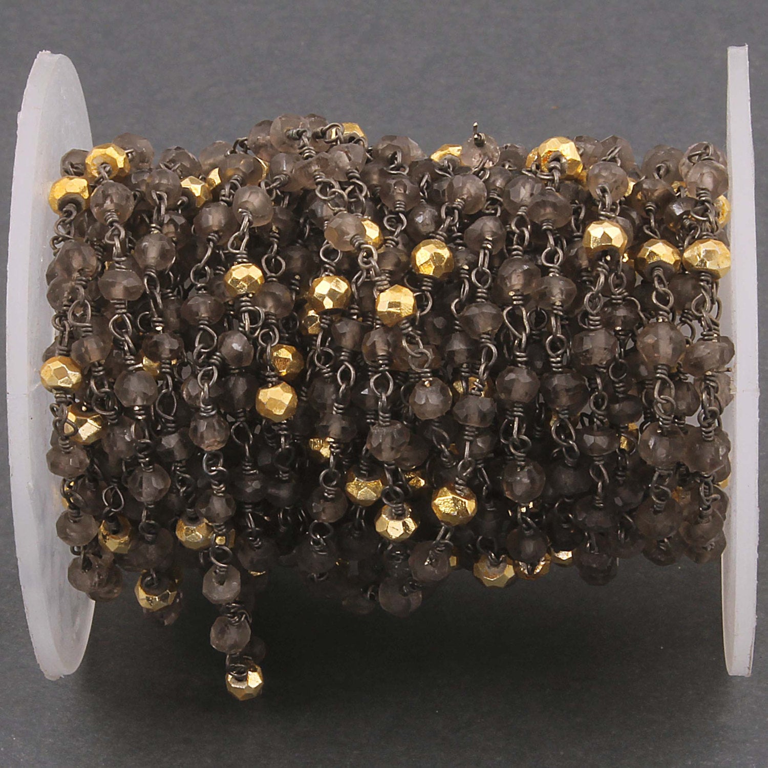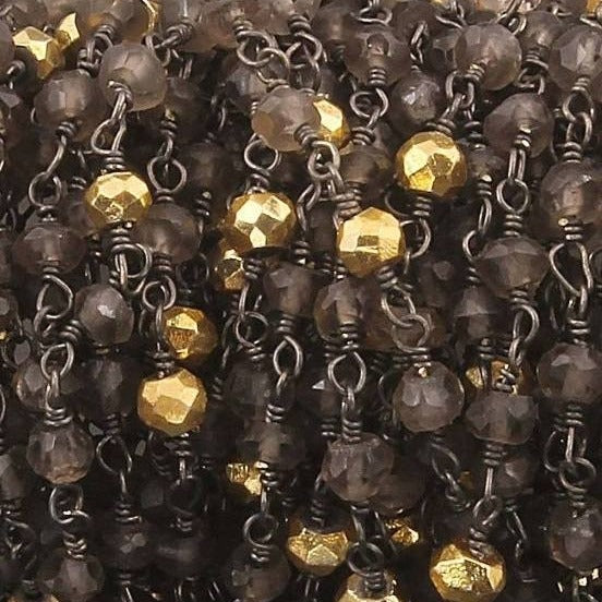 5 Feet Smoky Quartz and Gold Pyrite Black Wire Wrapped 3mm-3.5mm Beaded Chain Bdb057